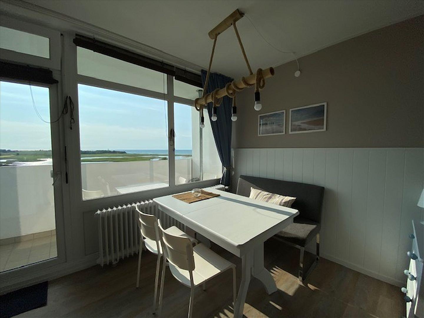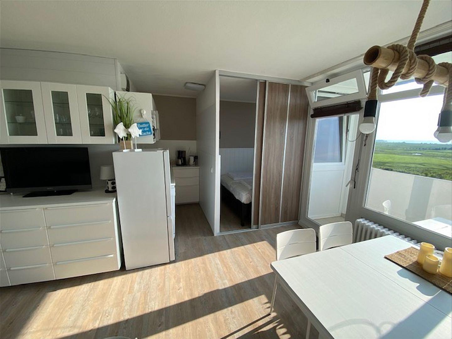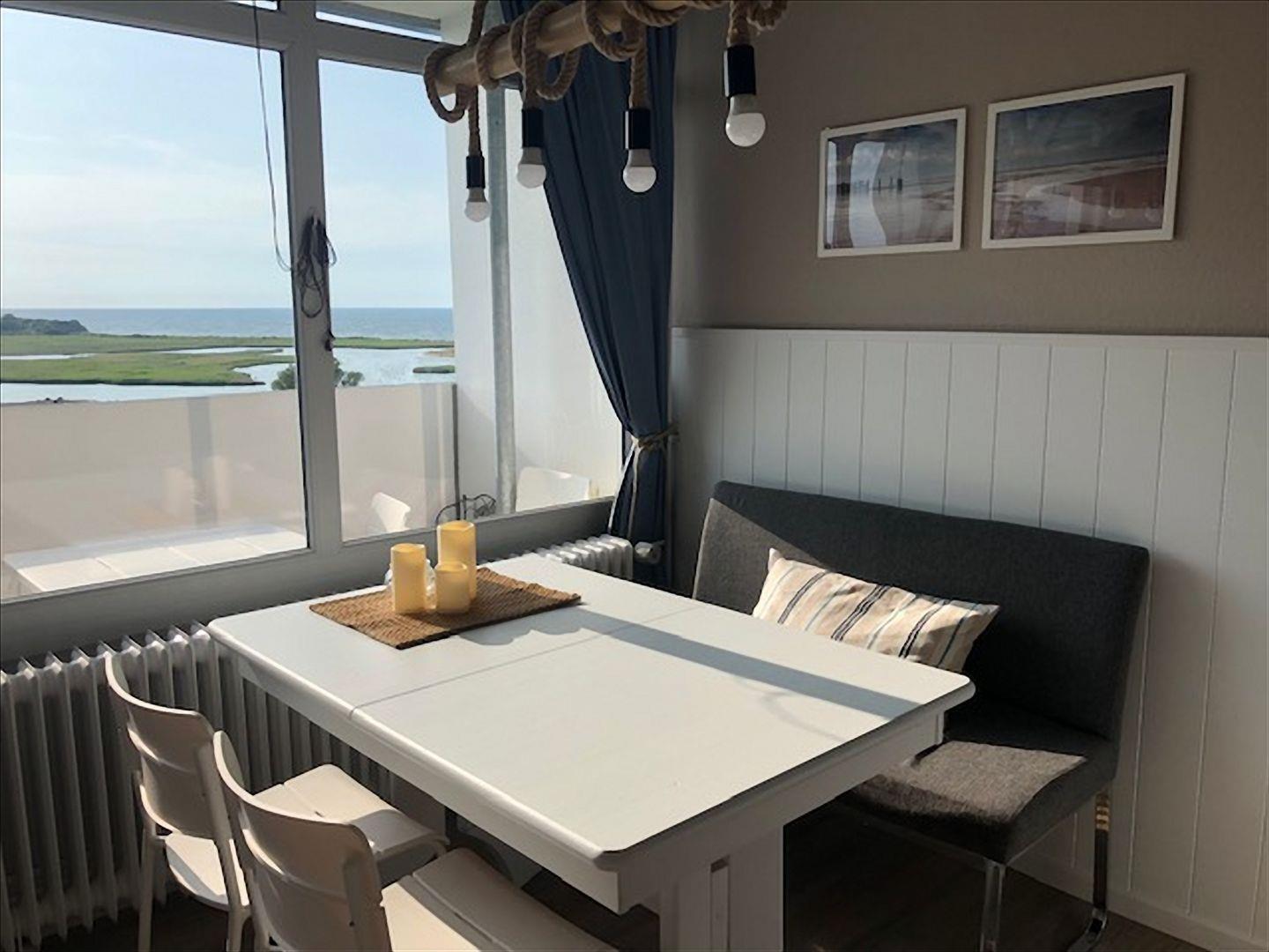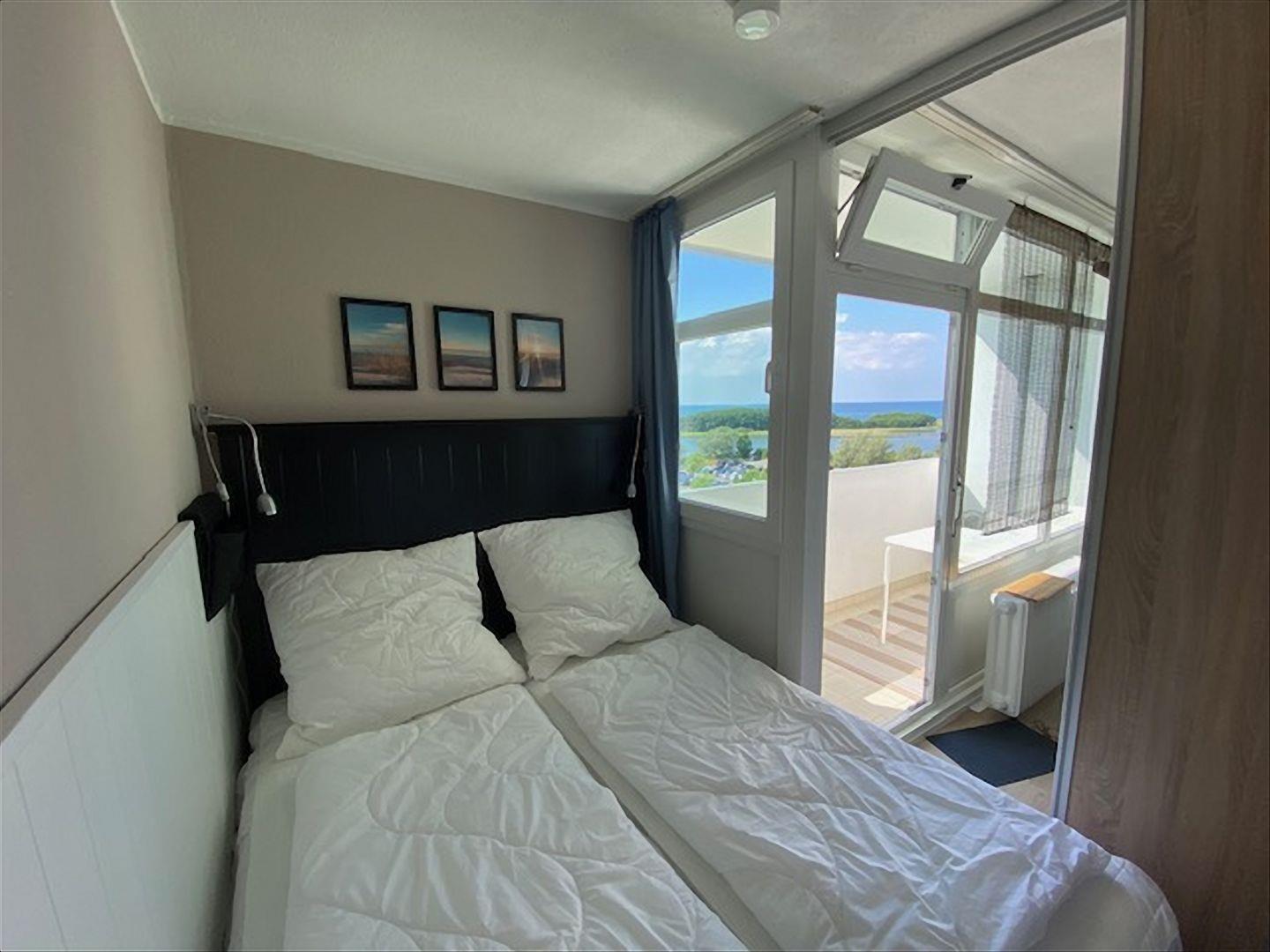 Diese Ferienwohnung ist komplett mit hellem Laminat ausgelegt und bietet einen tollen Blick über die Ostsee zum Leuchtturm.