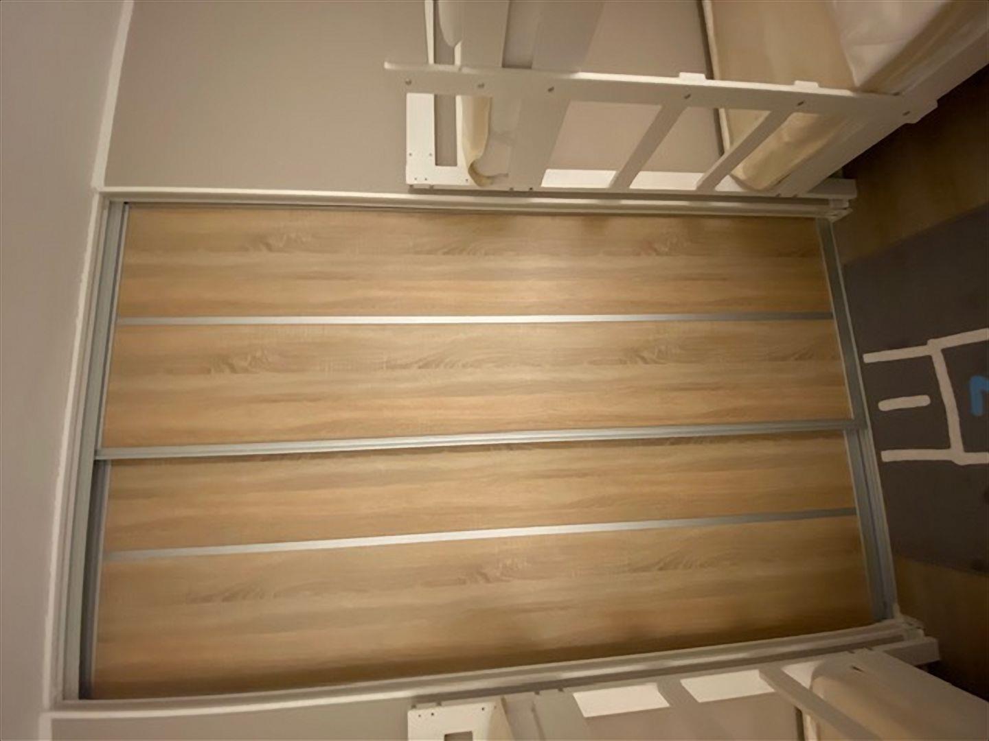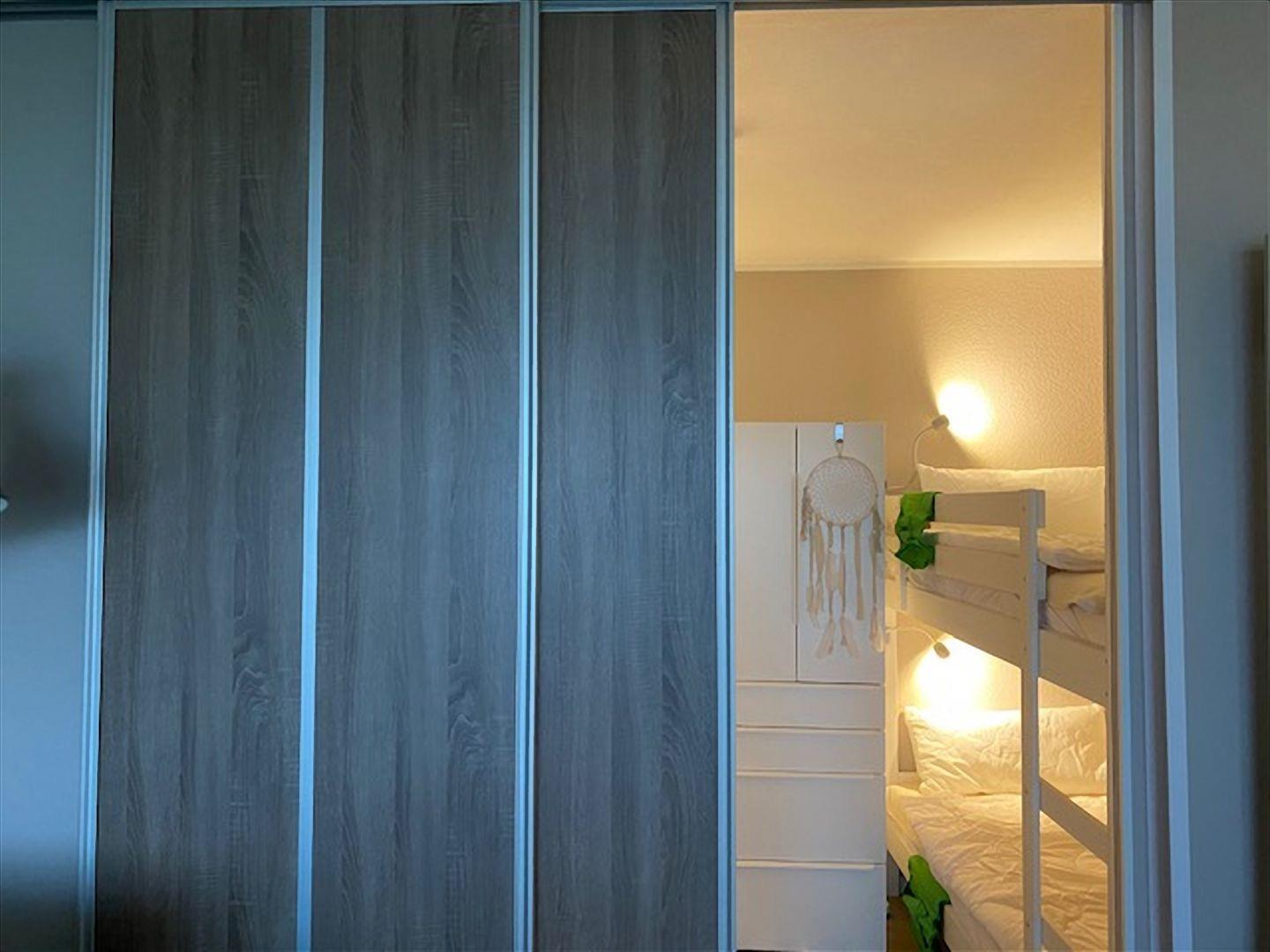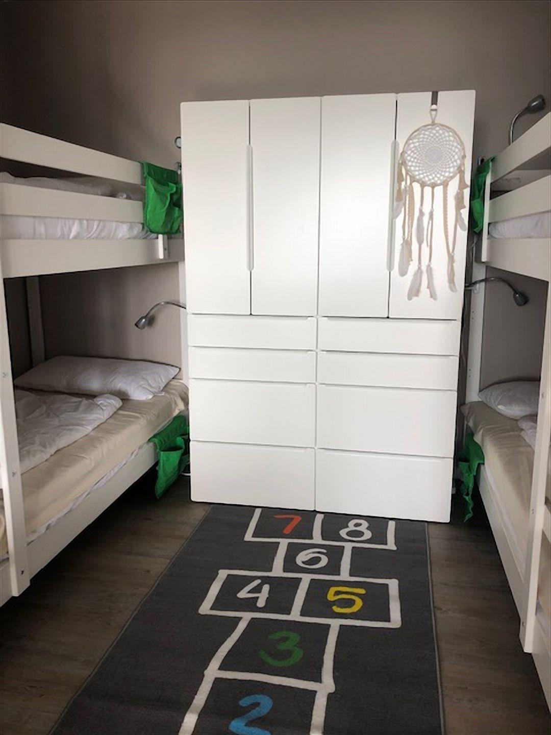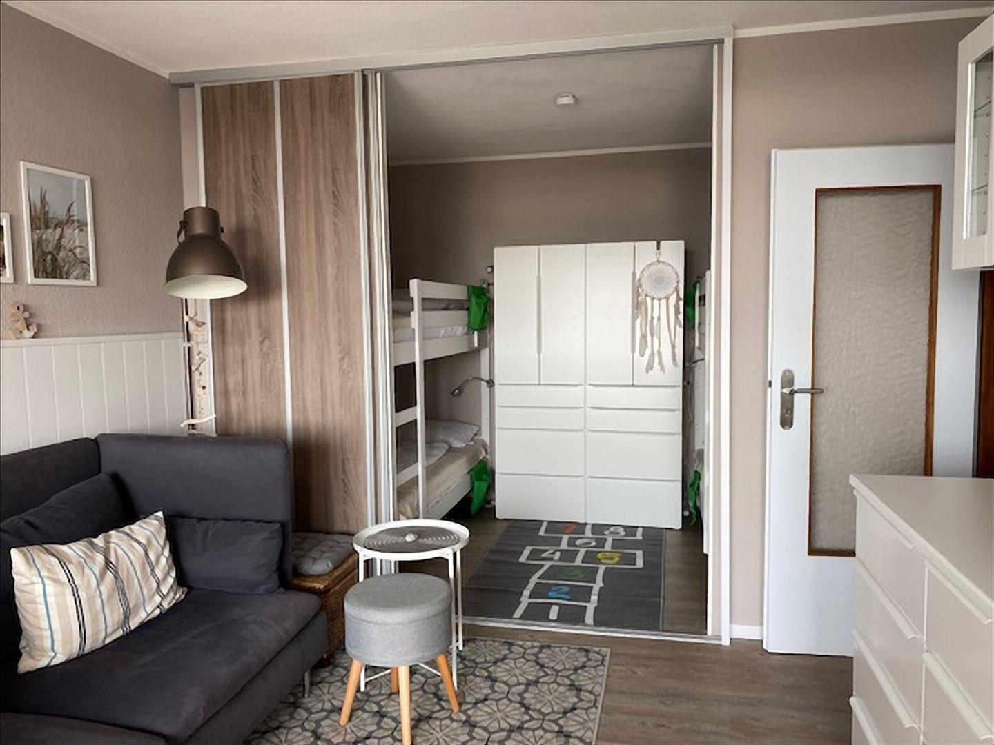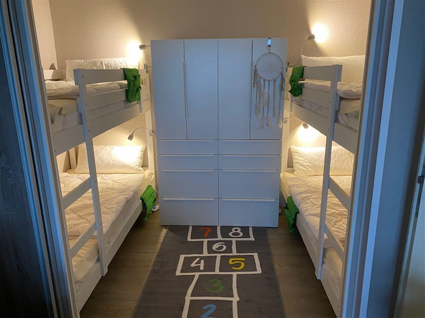 Im Kinderzimmer befinden sich 2 Etagenbetten aus hellem, weißen Holz (0,9 x 2,0 m) und ein Kleiderschrank. Auch dieses Schlafzimmer ist über eine Schiebetür vom Wohnbereich abgetrennt.