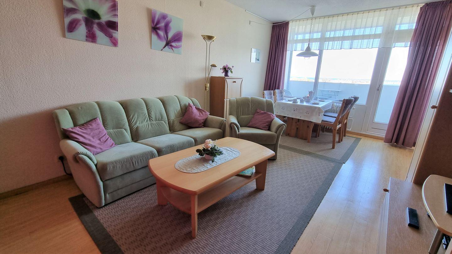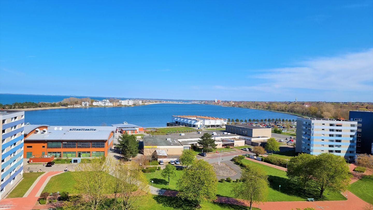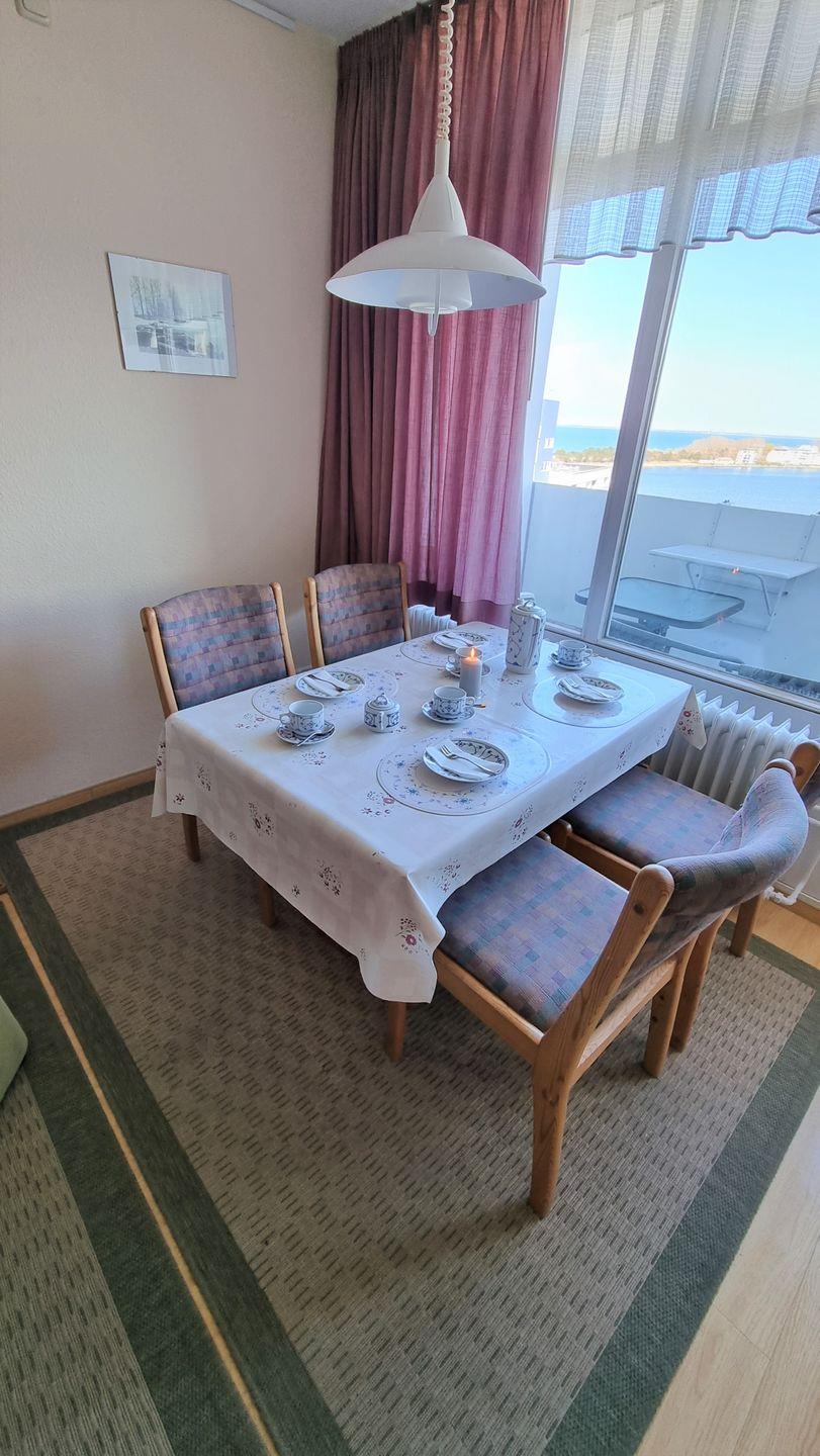 Farblich abgestimmte Ferienwohnung in der 10. Etage mit Balkon, Blick über den Binnensee Richtung Ostsee bis zur Fehmarnsundbrücke und Richtung Stadt Heiligenhafen.
