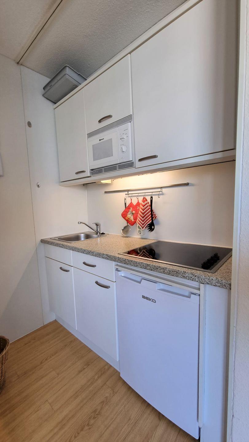 Die Küche ist offen zum Wohn/Schlafbereich und mit notwendigen Küchenutensilien ausgestattet -4er Ceranfeld, Mikrowelle, Wasserkocher, Kaffeemaschine etc.