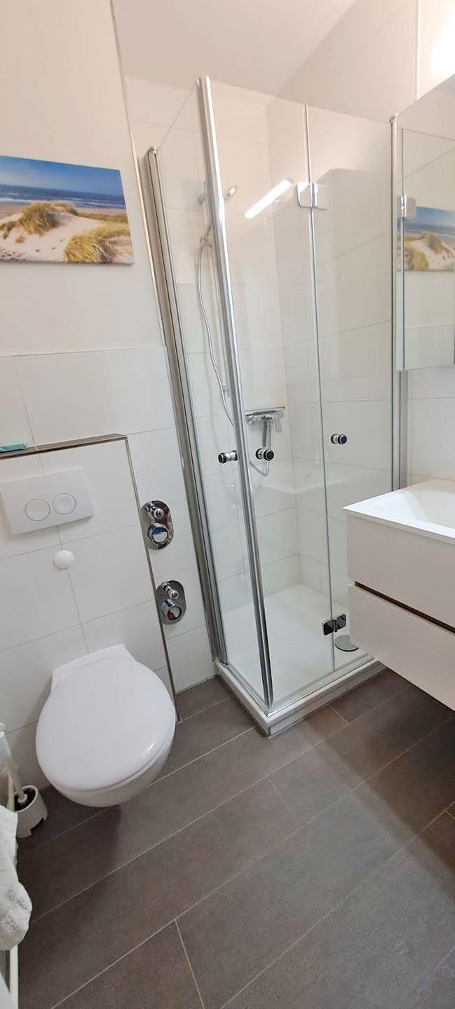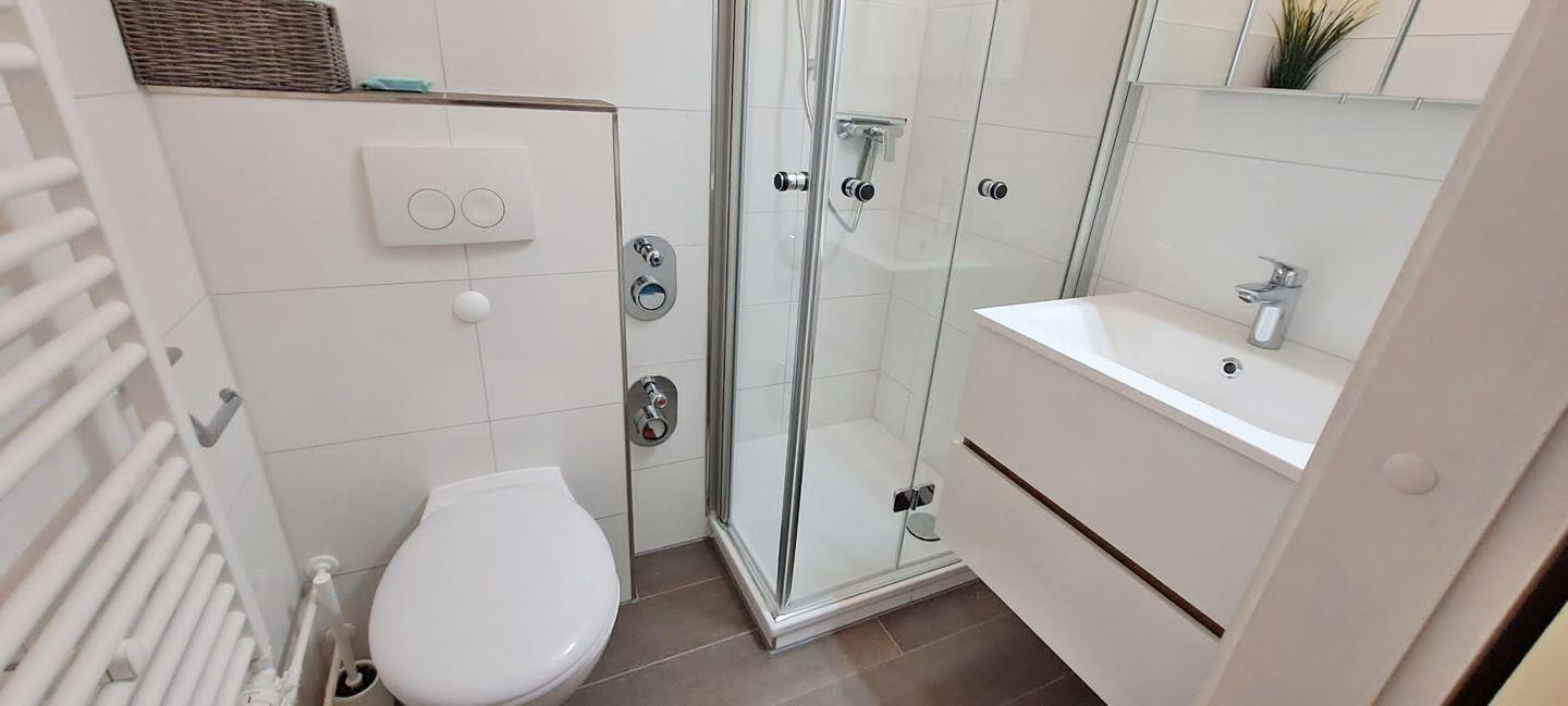 Ein frisch saniertes, helles Bad mit Duschkabine und WC komplettiert die Wohnung.