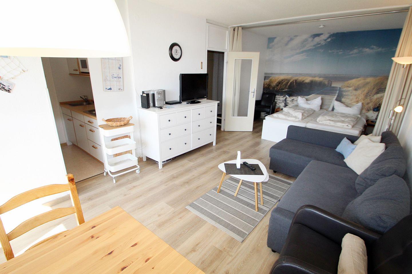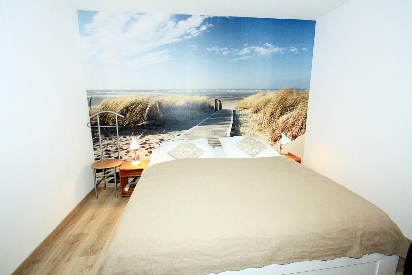 Den Schlafbereich mit der wunderschönen Ostseetapete können Sie mit einem Vorhang vom Wohnbereich trennen.