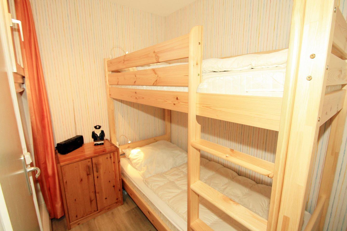 Das kleine aber feine Kinderzimmer- mit Tür zum Wohnzimmer- ist mit einem großen Etagenbett ausgestattet, und erlaubt es auch Erwachsenen den Blick über den Binnensee bis hin zum Hafen schweifen zu lassen.