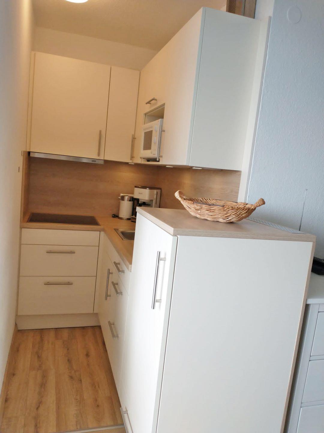 Die helle Küche ist mit einem 4 Plattenherd, Mikrowelle, Kaffeemaschine, Wasserkocher und Kindergeschirr vollständig ausgestattet.