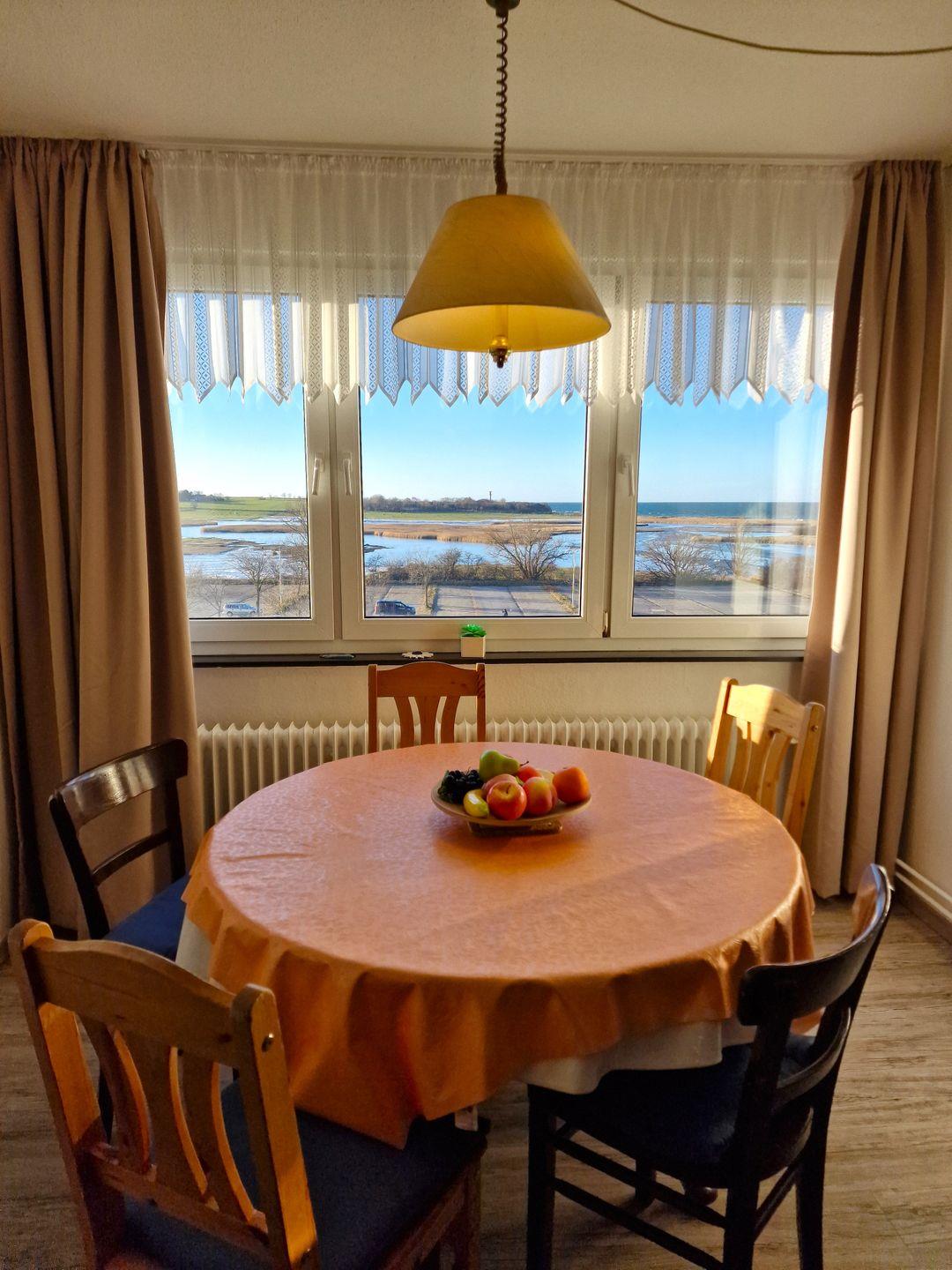 Die Wohnung im 4. Stock ist modern und gemütlich eingerichtet, ideal für Gäste, die zwischen Entspannung und Abenteuer wählen möchten. Genießen Die den Blick über die wunderschöne Landschaft und die Ostsee direkt aus dem Wohnzimmer. Dieses ist nicht nur der zentrale Treffpunkt, sondern auch ein Ort der Gemütlichkeit, ausgestattet mit einem komfortablen Sofa, einem Sessel und einem Fernseher mit Kabelanschluss – perfekt für einige entspannte Filmabende nach einem aufregenden Tag am Strand.
