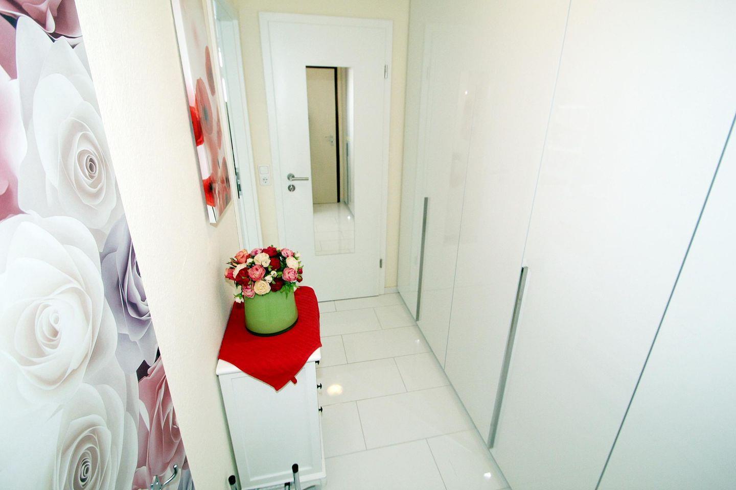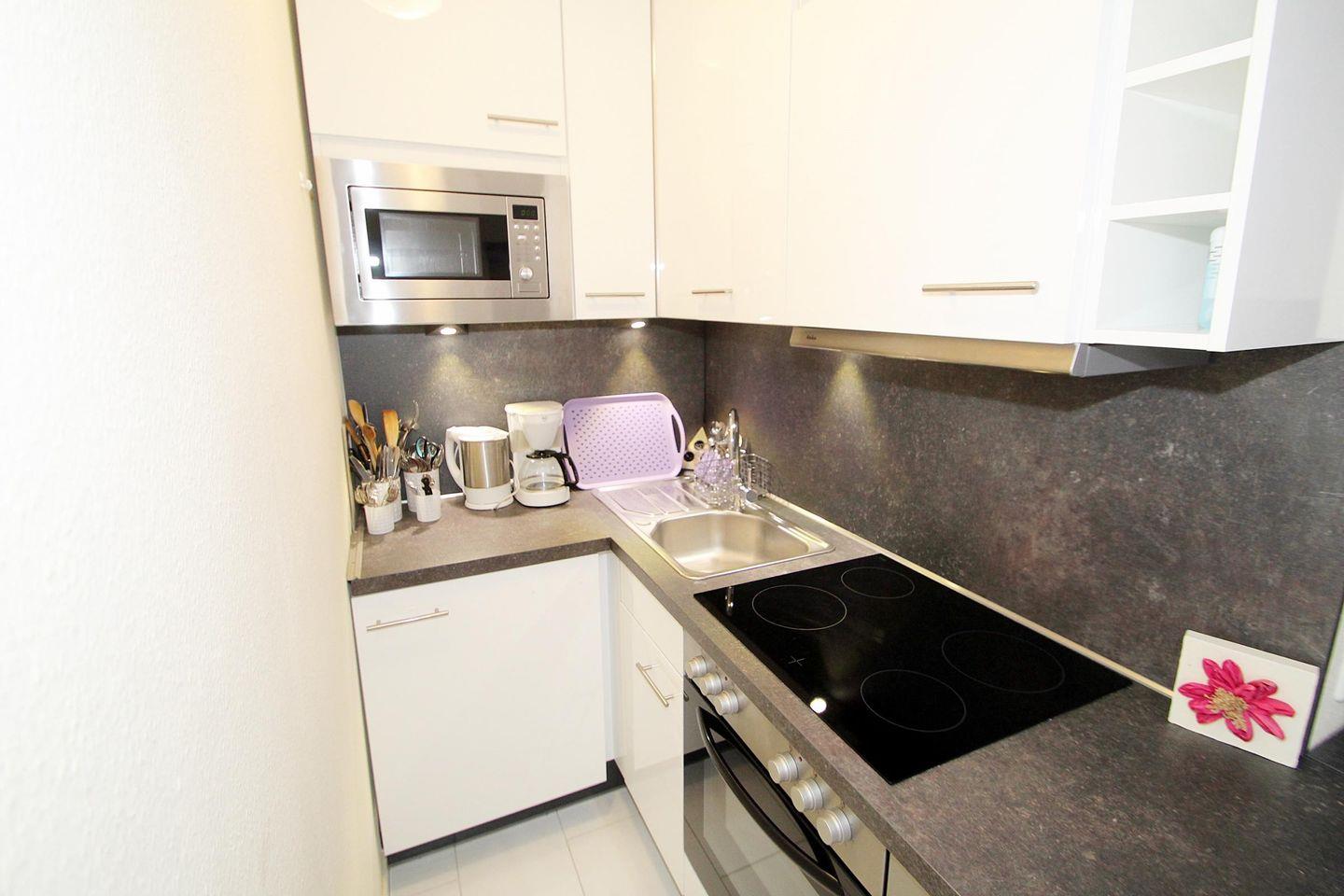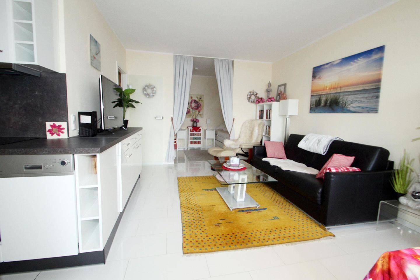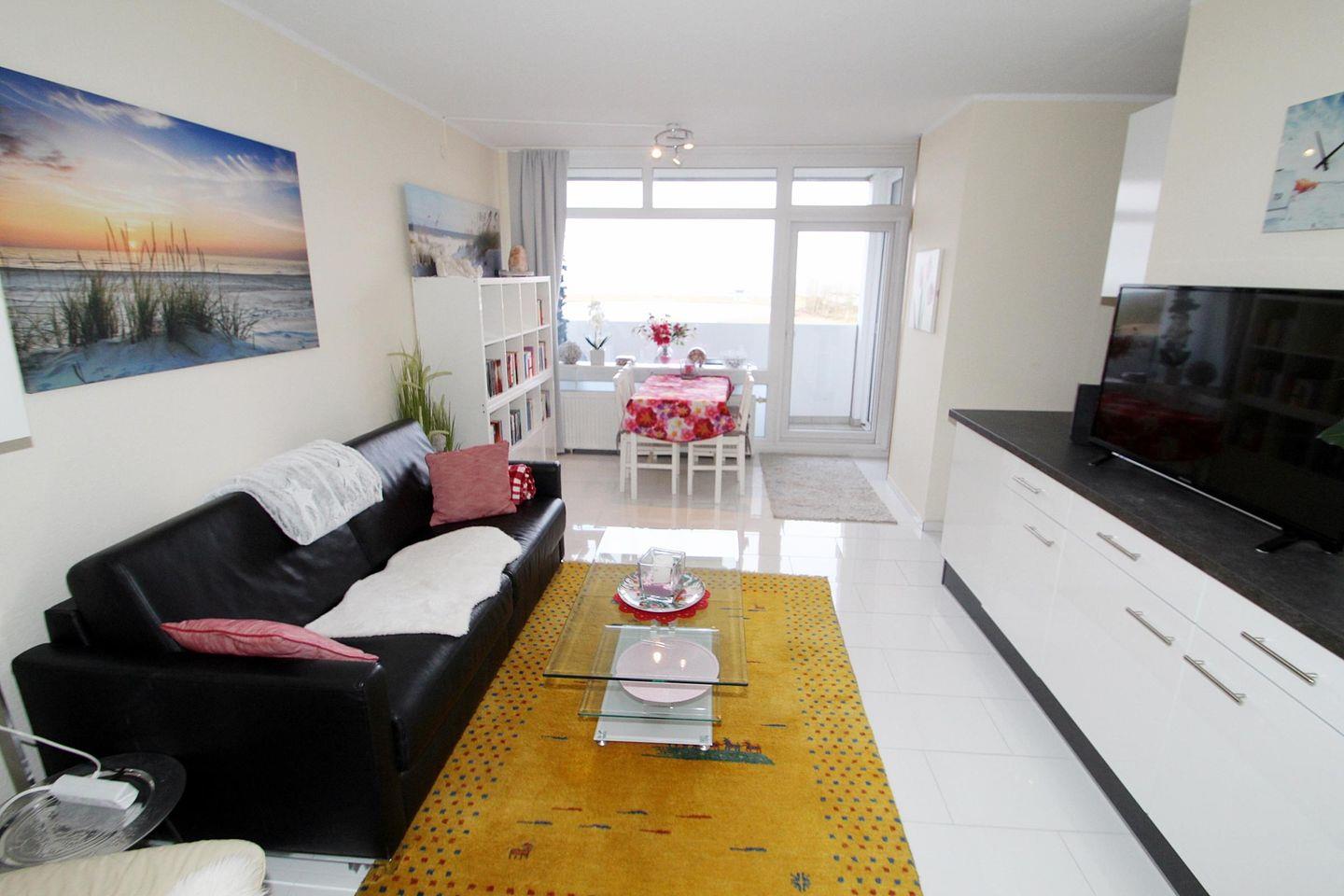Willkommen in dieser stilvollen Ferienwohnung in der 5. Etage mit Balkon zur Nordseite und einem wunderbaren Blick über die Ostsee – einen schönen Ort, um den Urlaub in vollen Zügen zu genießen. Ihr Wildrosentraum am Meer! Der helle Wohnbereich ist freundlich und komfortabel eingerichtet: Eine bequeme Couchgarnitur lädt zum Entspannen ein, ergänzt durch einen hochwertigen Sessel mit Fußhocker. Für Unterhaltung sorgen ein großer LCD-TV (110?cm) und eine HiFi-Anlage. Der Essbereich befindet sich direkt am Fenster – von hier aus genießen Sie den ungehinderten Blick auf die Ostsee in voller Pracht. Der Schlafbereich ist durch einen Vorhang vom Wohnraum getrennt und mit zwei hochwertigen Einzelbetten (90?×?200?cm, hoher Einstieg) ausgestattet, die erholsame Nächte garantieren. Das separate Kinderzimmer verfügt über ein Einzelbett (80?×?190?cm) und eine eigene Terrassentür auf den Balkon, sodass kleine Gäste ihren eigenen Rückzugsort haben. Die offene Küche ist modern und vollständig ausgestattet: Ceranfeld, Backofen, Spülmaschine, Kühlschrank und Kaffeemaschine – alles, was Sie für eine unkomplizierte Selbstversorgung benötigen. Das Badezimmer überzeugt mit einer Dusche (hoher Einstieg) und WC. Auf dem Balkon mit Sitzgelegenheiten können Sie die frische Ostseeluft genießen und haben dabei einen direkten Blick auf das Meer – perfekt für gemütliche Morgenstunden oder entspannte Abende. Die gesamte Wohnung ist liebevoll, modern und komfortabel eingerichtet. Hier lässt sich der Urlaub von Anfang an in vollen Zügen genießen! Kostenfreie Parkplätze stehen direkt in der Nähe der Wohnung zur Verfügung. Damit sich alle Gäste rundum wohlfühlen, ist diese Wohnung eine Nichtraucherwohnung und haustierfrei – vielen Dank dafür!