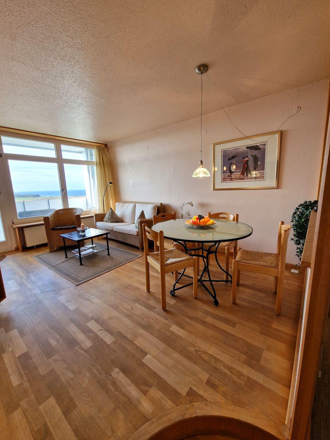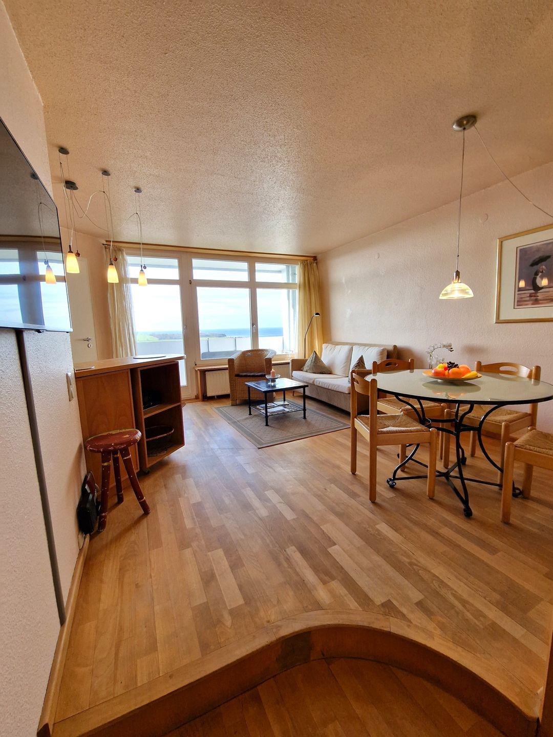 Grenzenlose Aussicht auf Küste, Himmel und Meer! Wie ein Kapitän auf seiner Brücke lassen sich beeindruckende Naturschauspiele und Sonnenuntergänge direkt aus der Ferienwohnung erleben. Völlig unverbaut und ganz bequem im Sitzen (bei Wohnungen im Ferienpark nicht üblich). Beobachten Sie vorne in den geschützten Salzwiesen eine Vielzahl rastender Vögel, die rhythmischen Leuchtsignale auf dem Leuchtturm an der Steilküste, dahinziehende Segler vorne im Wind und am Horizont die Großschifffahrt. (Bitte Fernrohr nicht vergessen!)