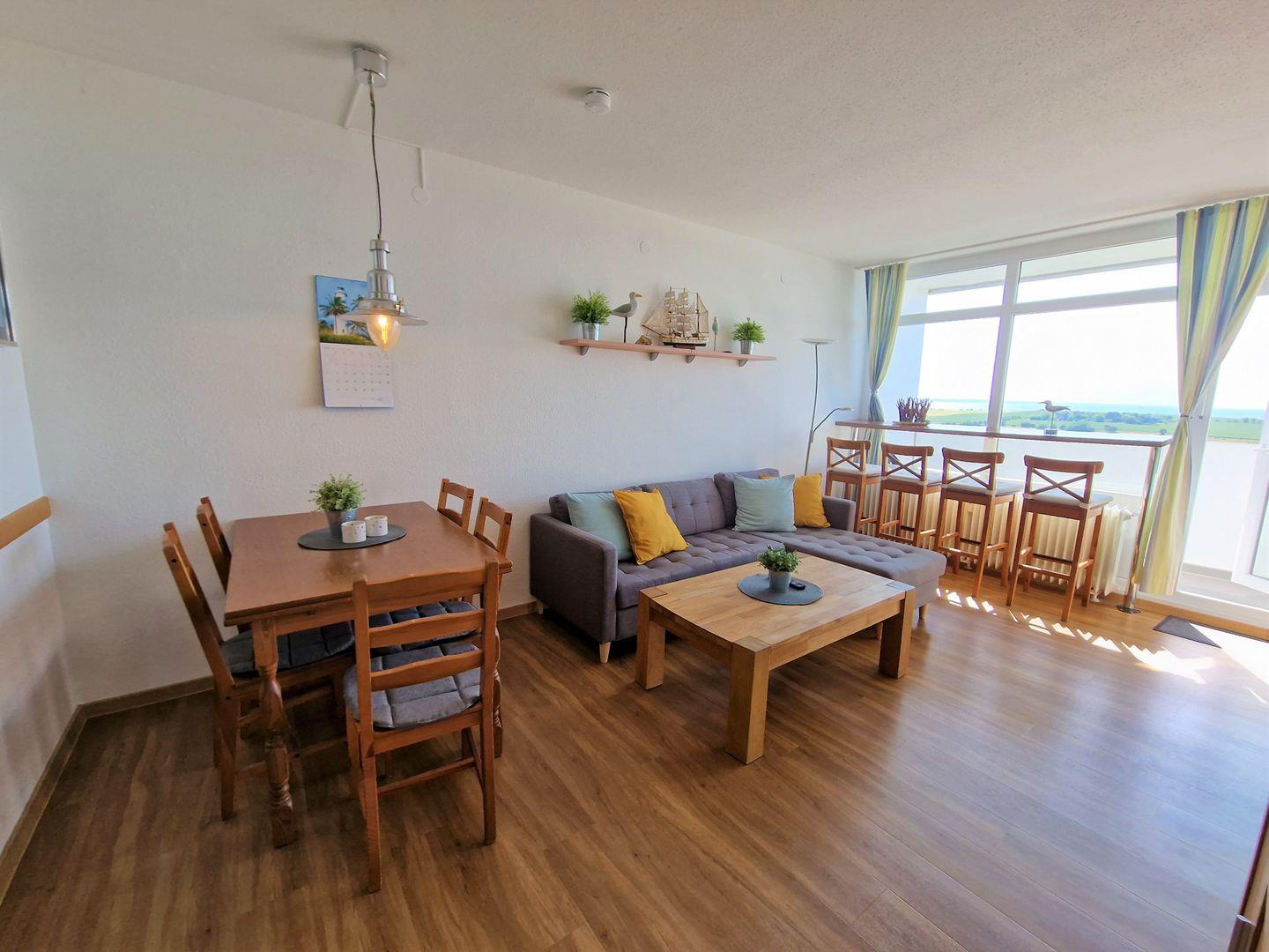 Helle und gemütliche Ferienwohnung mit kombiniertem Wohn- und Schlafbereich und gemütlichen Sitzgelegenheiten sowie Flachbild-TV.