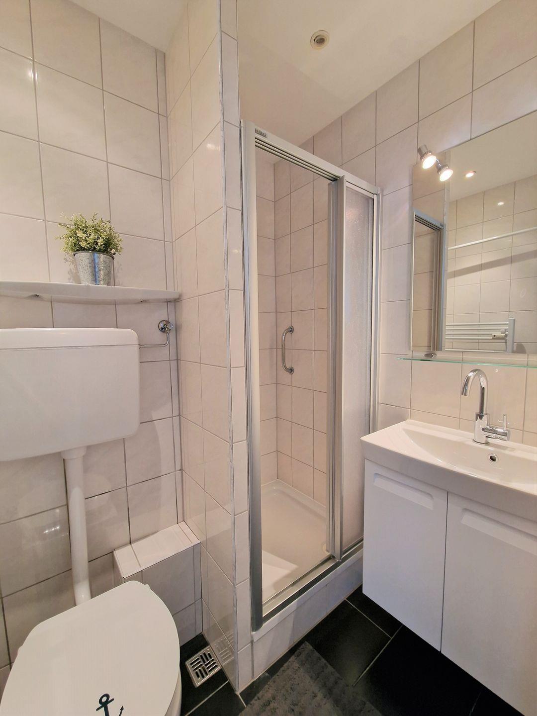 Das helle Bad verfügt über eine Duschkabine, WC und einen Handtuchheizkörper.