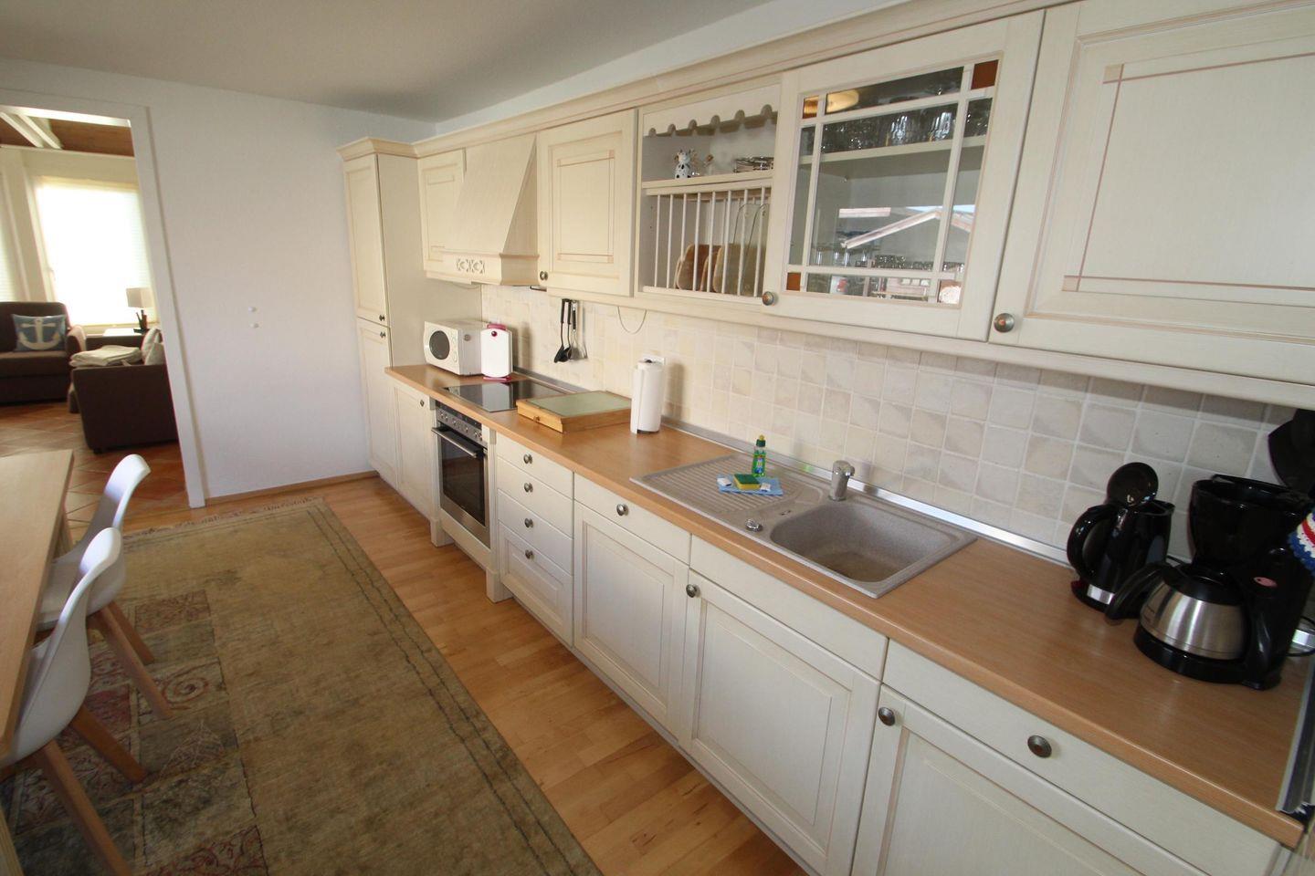 Die Wohnung liegt "Am Mühlentor", daher auch der Name. Sie ist hell und nordisch modern mit größtenteils gefliestem Boden und Läufern ausgestattet. Der Wohnbereich im Stile eines Wintergartens hat das gewisse Etwas und jede Menge Licht. Er bietet mit einer großen Schlafcouch, Sat-TV und WLAN eine tolle Entspannungsoase. Ein großer Essbereich steht in der vollausgestatteten Küche zur Verfügung. Hier trifft sich die Familie und es entspannt sich leicht. 2 Duschbäder runden die Ruhefindung ab. Die Wohnung ist besonders interessant für Familien mit 2-4 Kindern oder Gruppen, da es über 1 Schlafzimmer mit einem Etagenbett und einem Doppelbett, sowie eine Schlafcouch (im Wohnbereich) für 2 Personen verfügt. Eine Waschmaschine und Trockner stehen in einem Waschraum zur Verfügung. Eine weitere Annehmlichkeit ist hier der direkte Zugang zur Terrasse und dem Garten. Sitzmöbel, Strandkorb, Grillmöglichkeit und viel Platz für die "Lütten", dazu jede Menge Sonne, Entspannung und Erholung finden Sie hier "Am Mühlentor" garantiert.