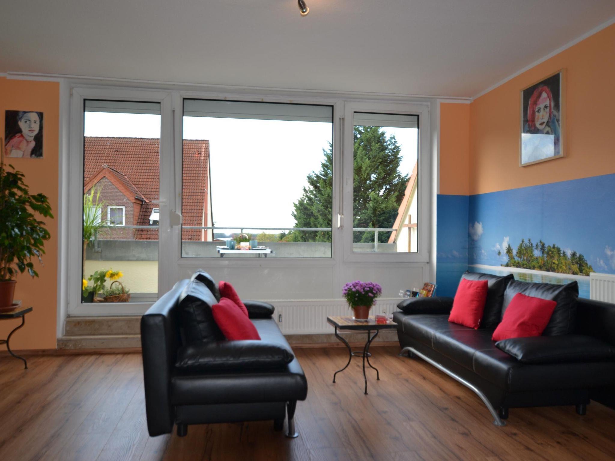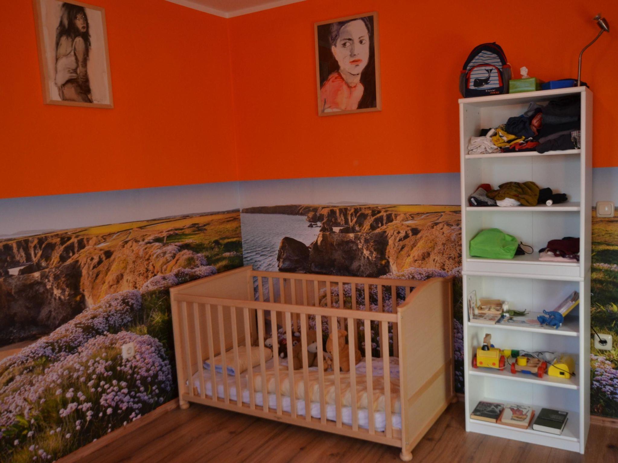 The holiday flat on the first floor has a living space of 159 m², which is noticeably larger due to the sloping ceilings and offers you plenty of space and numerous sleeping options for a holiday together. You are welcomed into six generously proportioned rooms, which are colourful and decorated with murals to create a lively atmosphere. The interior is divided into five bedrooms, a living and dining room with an integrated kitchen, as well as a full bathroom and a shower room, each with a WC. The first three bedrooms each have two double beds measuring 140 cm x 200 cm. This means that each room can sleep up to four people. The fourth and fifth bedrooms are both designed as classic double rooms for two people with a French bed of the same dimensions. In the living room, you can pull out the two leather sofa beds (140 cm x 200 cm) as you wish, so that the flat can accommodate up to 20 people in total with a maximum occupancy. Next to the living area, you can enjoy a meal together at the dining table for six people. From there, you can access the roof terrace through the exterior door, which lets in plenty of natural light. The open-plan corner kitchen allows you to conveniently prepare your own meals using the four-zone ceramic hob with oven, dishwasher, fridge and freezer, washing machine, microwave and the usual small electrical appliances such as a coffee machine, kettle and toaster. The comfortable furnishings also include a workstation with multifunction printer in one of the bedrooms, a TV with DVD player in the living room and free Wi-Fi internet access. A cot and high chair are also available.