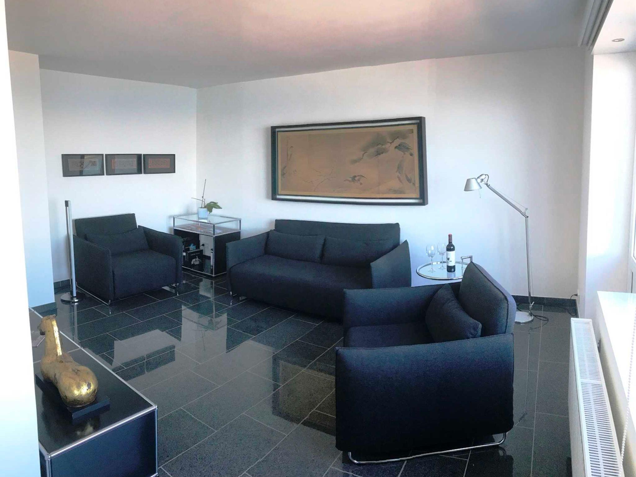Vier Räume: Wohnzimmer zur Seeseite mit Balkon, Küche mit Essplatz zur Seeseite. Bidet, Dusche/WC, Flur.
