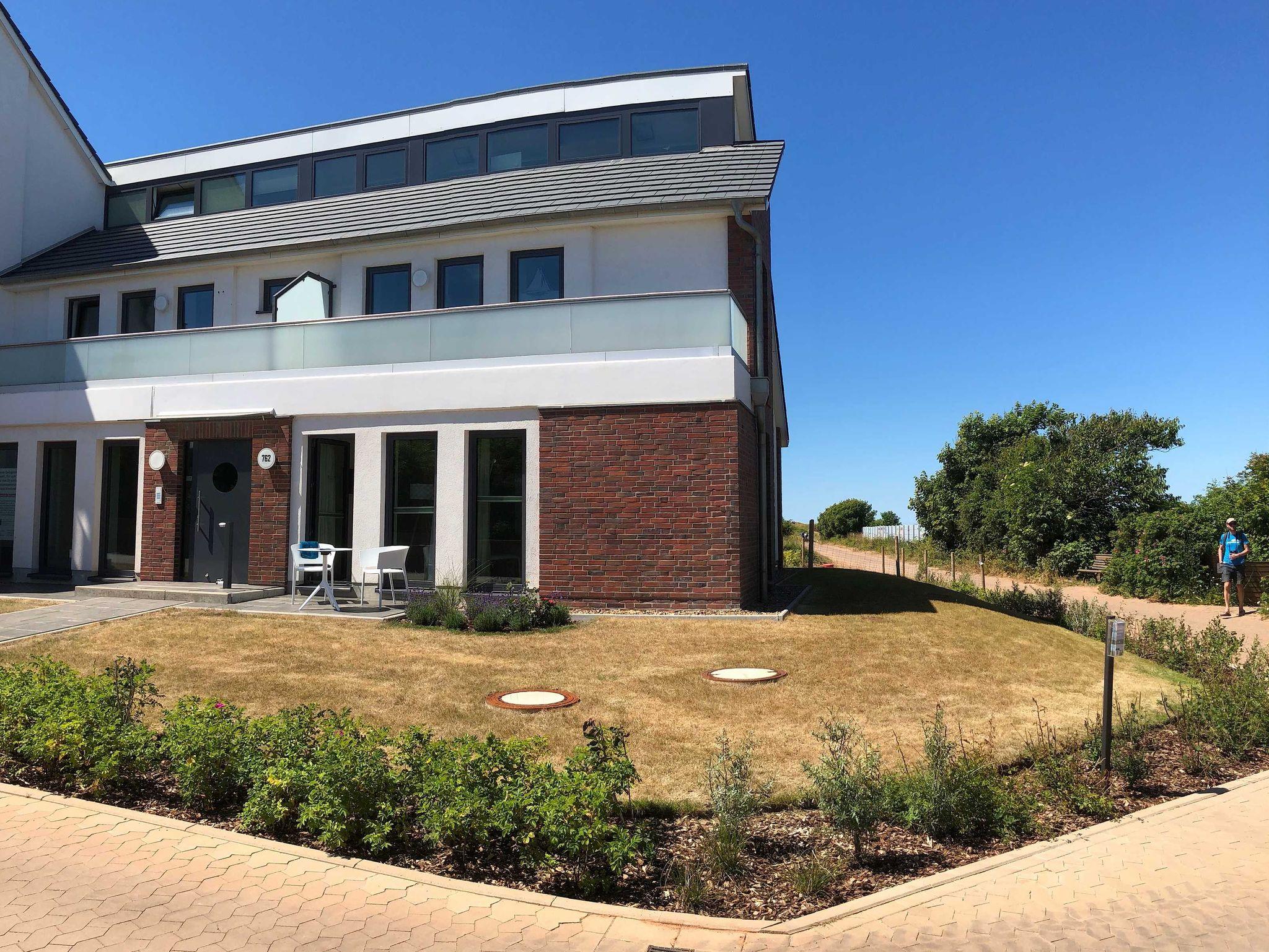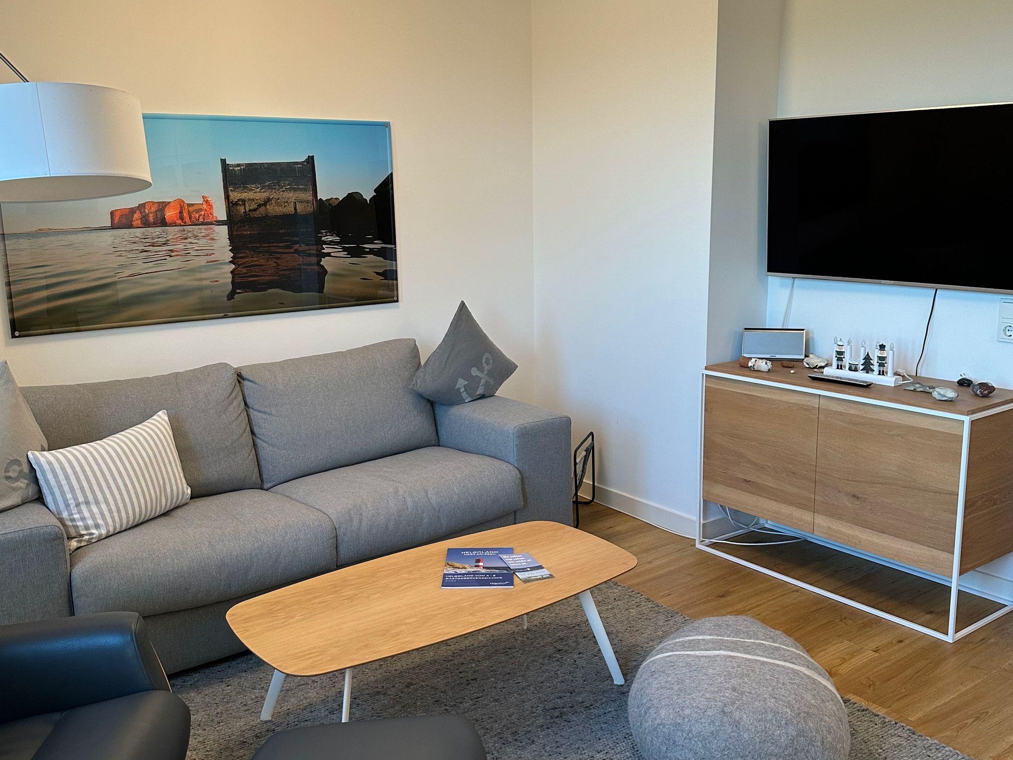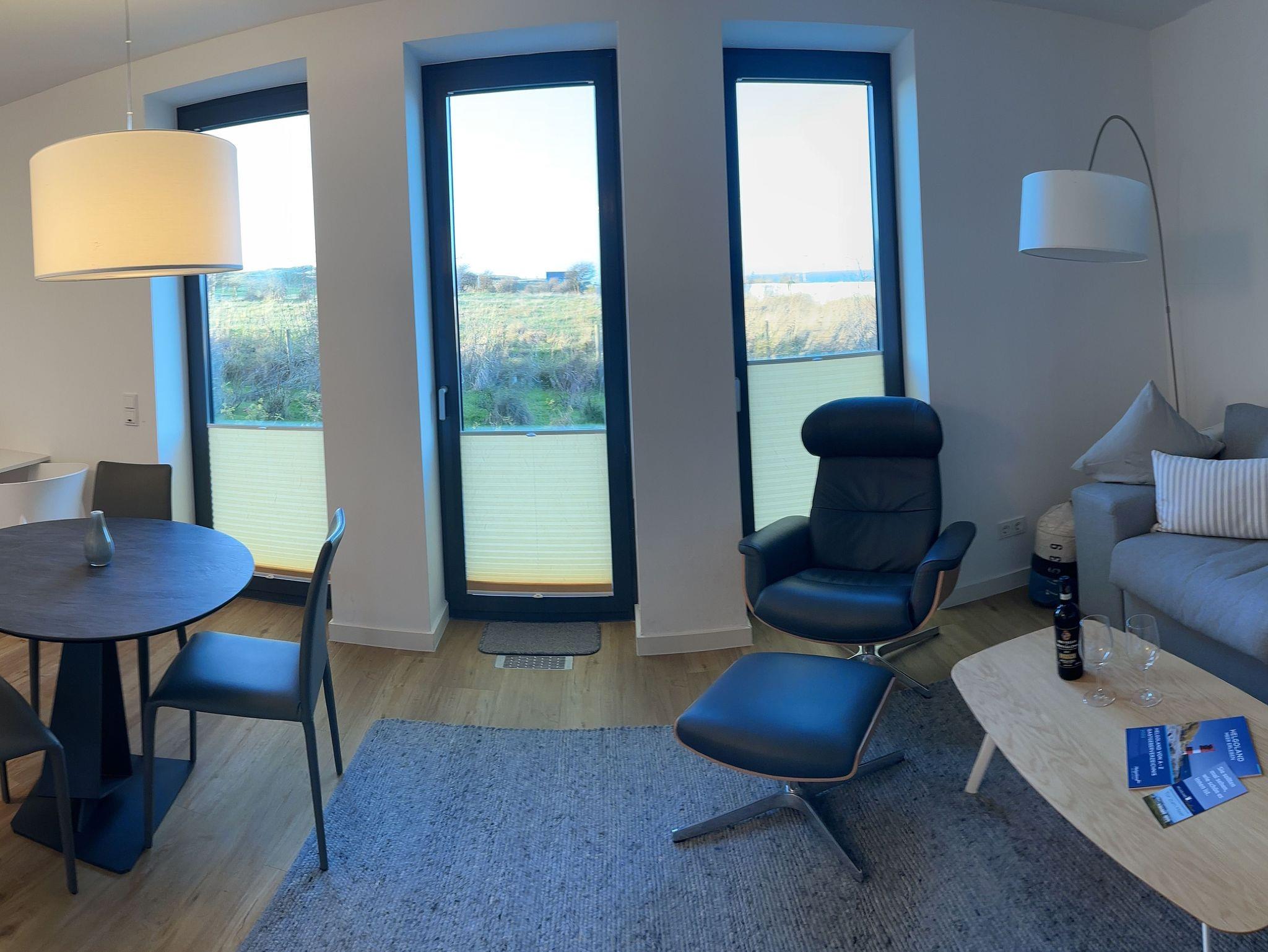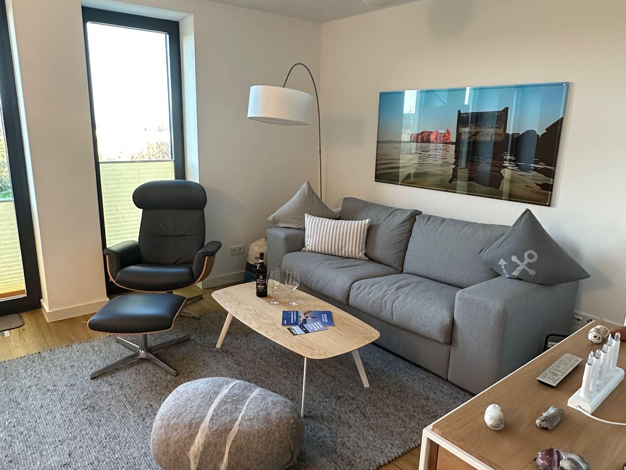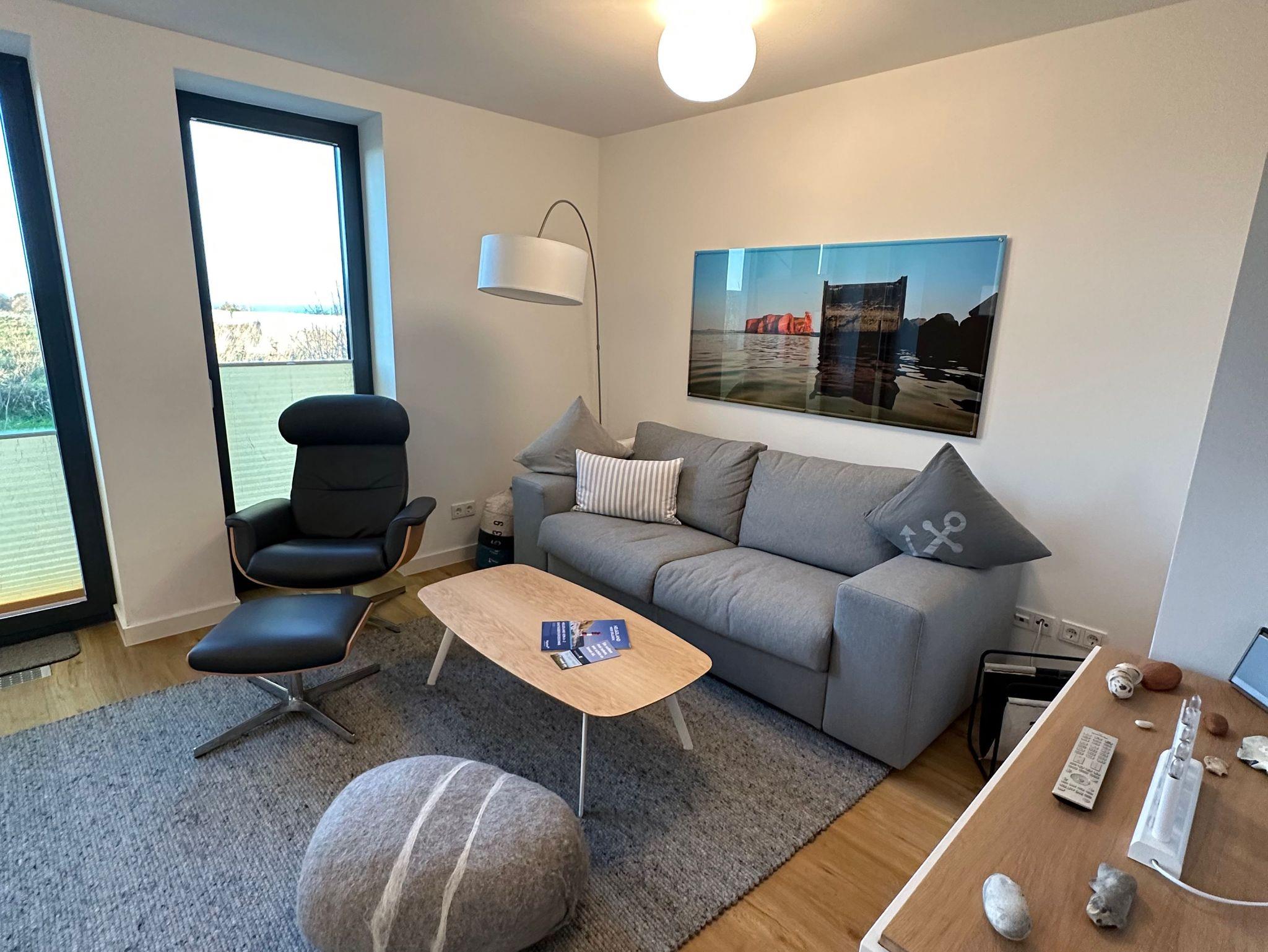 Die luxuriöse Wohnung hat ca. 59 qm Wohnfläche im Erdgeschoss. Der Wohnbereich verfügt über eine offene, komplett ausgestattete Küche mit Essplatz und Zugang zur Terrasse mit einem unverbauten Blick auf die Nordsee und das grüne Oberland. Duschbad und WC sind separat. WLAN, TV und Radio/Dockingstation sehen zur Verfügung. Im Schlafzimmer befindet sich ein Doppelbett (180 x 200 cm), das Schlafsofa im Wohnbereich hat eine Liegefläche von 140 x 180 cm. Bettwäsche und Handtücher sind inklusive und werden bei längeren Aufenthalten gewechselt.