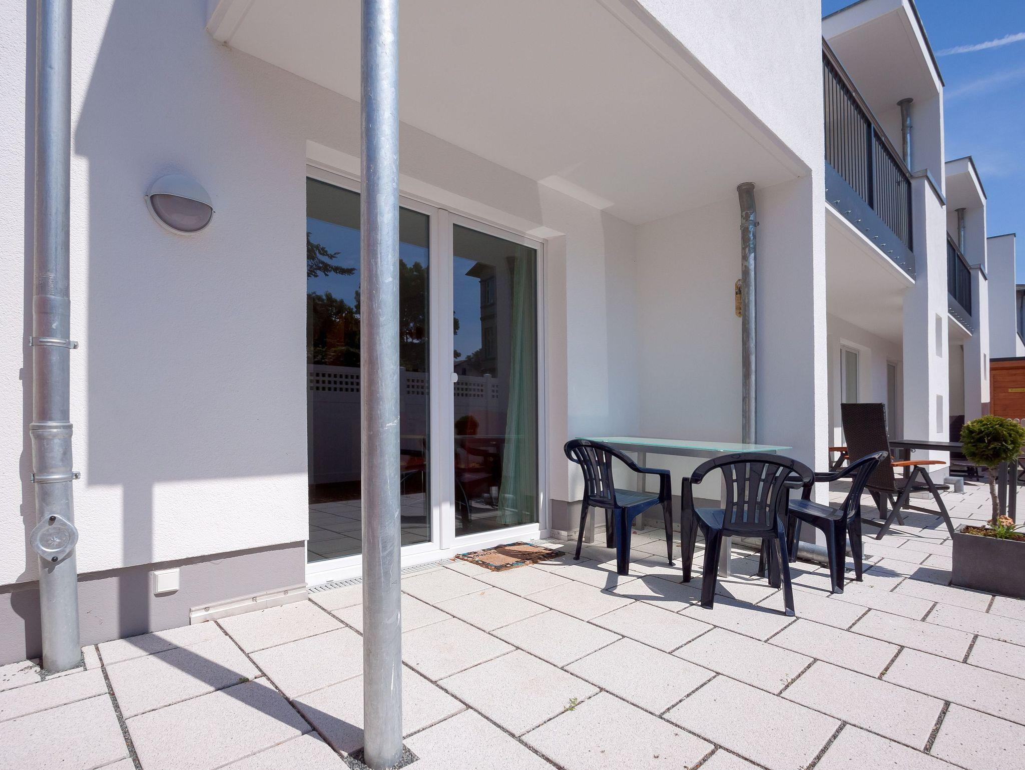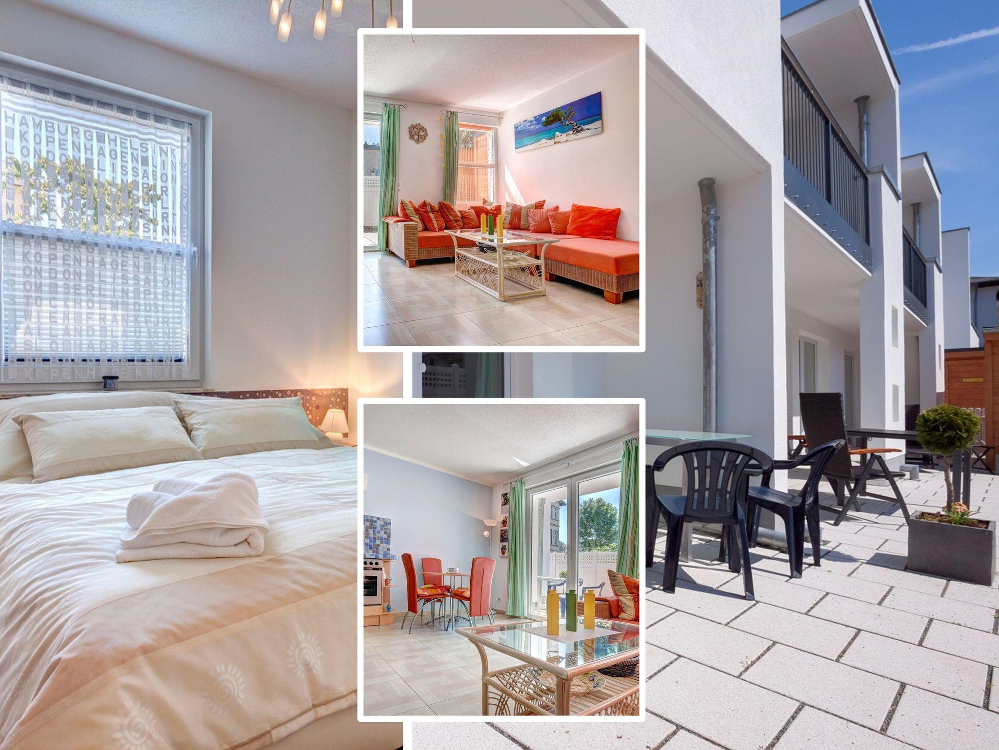 Ein Esstisch für 4 Personen und eine offene Küchenzeile mit Geschirrspüler, Kaffeemaschine, Mikrowelle, Herd etc. befinden sich angrenzend an den Wohnbereich. Für ein Sonnenbad oder laue Sommerabende bietet sich die angrenzende private und möblierte und ruhig gelegene Terrasse an.