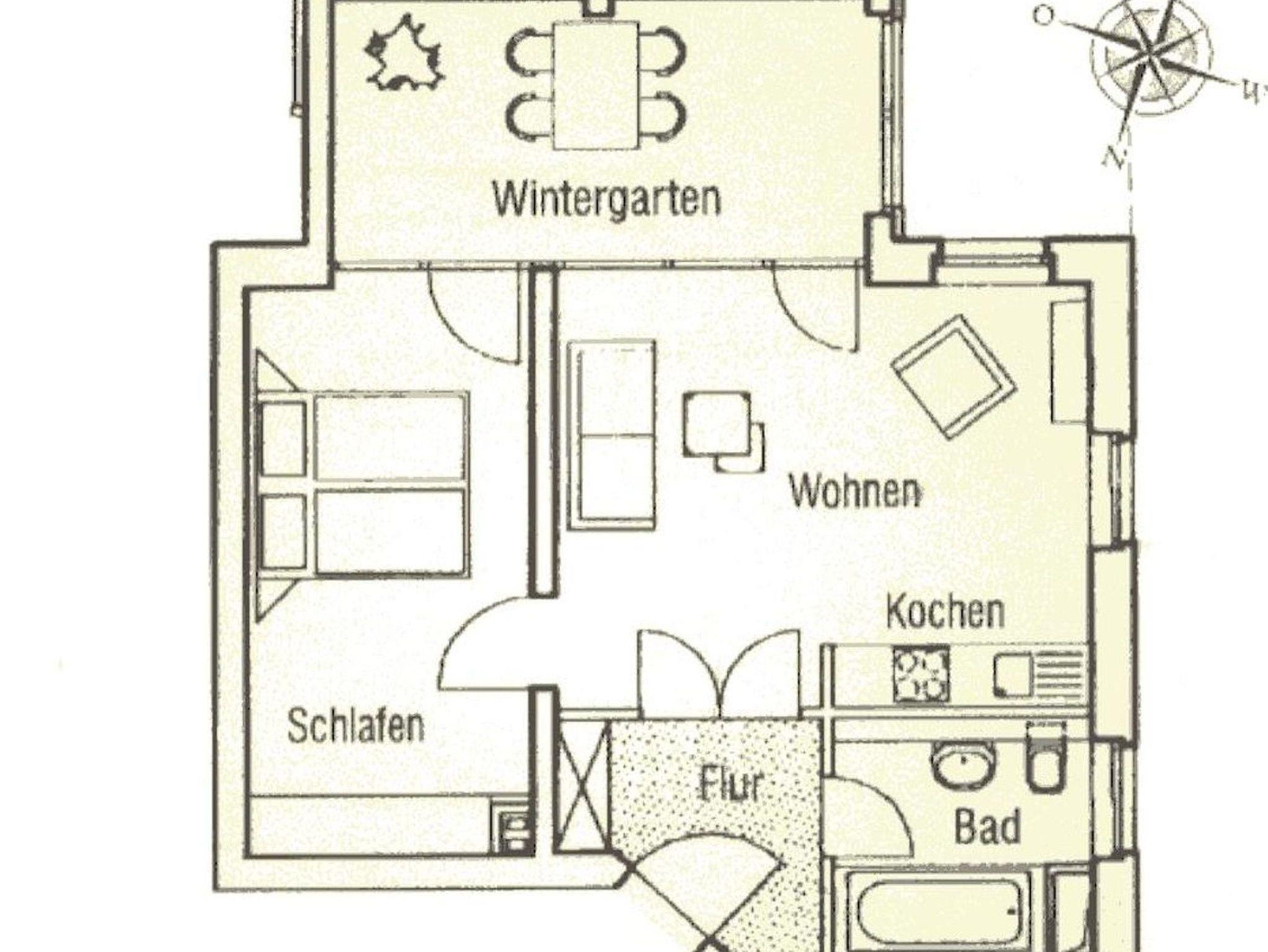 Die komfortable Nichtraucherferienwohnung ist ca. 58qm groß und für zwei Personen ideal geeignet. Der Wohnbereich verfügt über eine gemütliche Couch, Flachbild-TV, Blue-Ray-Player sowie ein CD-Radio. Die offene Küchenzeile ist voll ausgestattet mit einem Ceranfeld, Mikrowelle mit Backofenfunktion, Geschirrspüler, Kühlschrank mit Gefrierfach, Wasserkocher, Kaffeemaschine und Toaster. In dem schönen Wintergarten befindet sich der Esstisch mit vier Stühlen. Das separate Schlafzimmer erwartet Sie mit einem Doppelbett, einem zusätzlichen TV sowie einem geräumigen Kleiderschrank. Das im Jahr 2026 sanierte Badezimmer verfügt über eine Dusche, WC und Haartrockner.