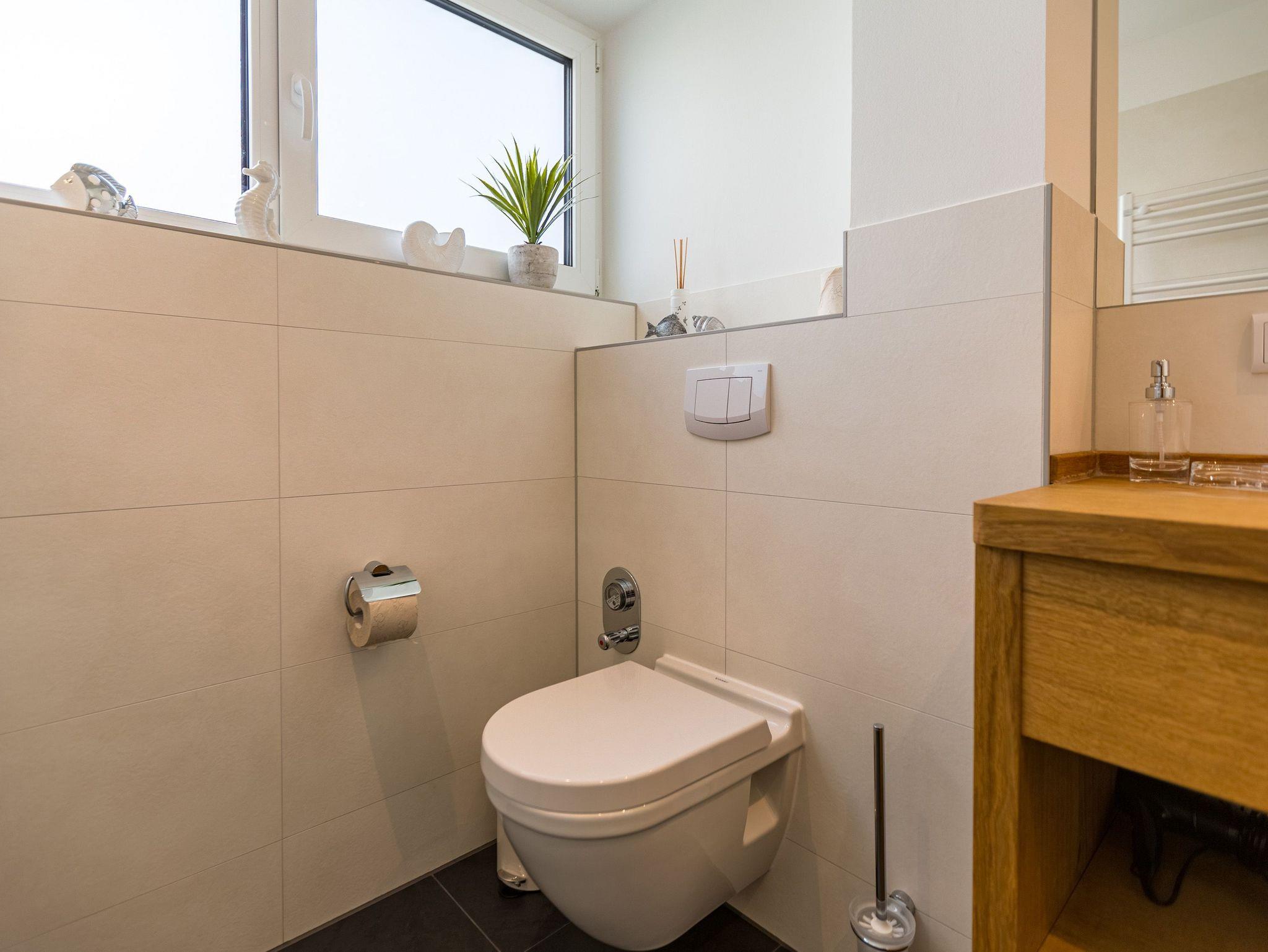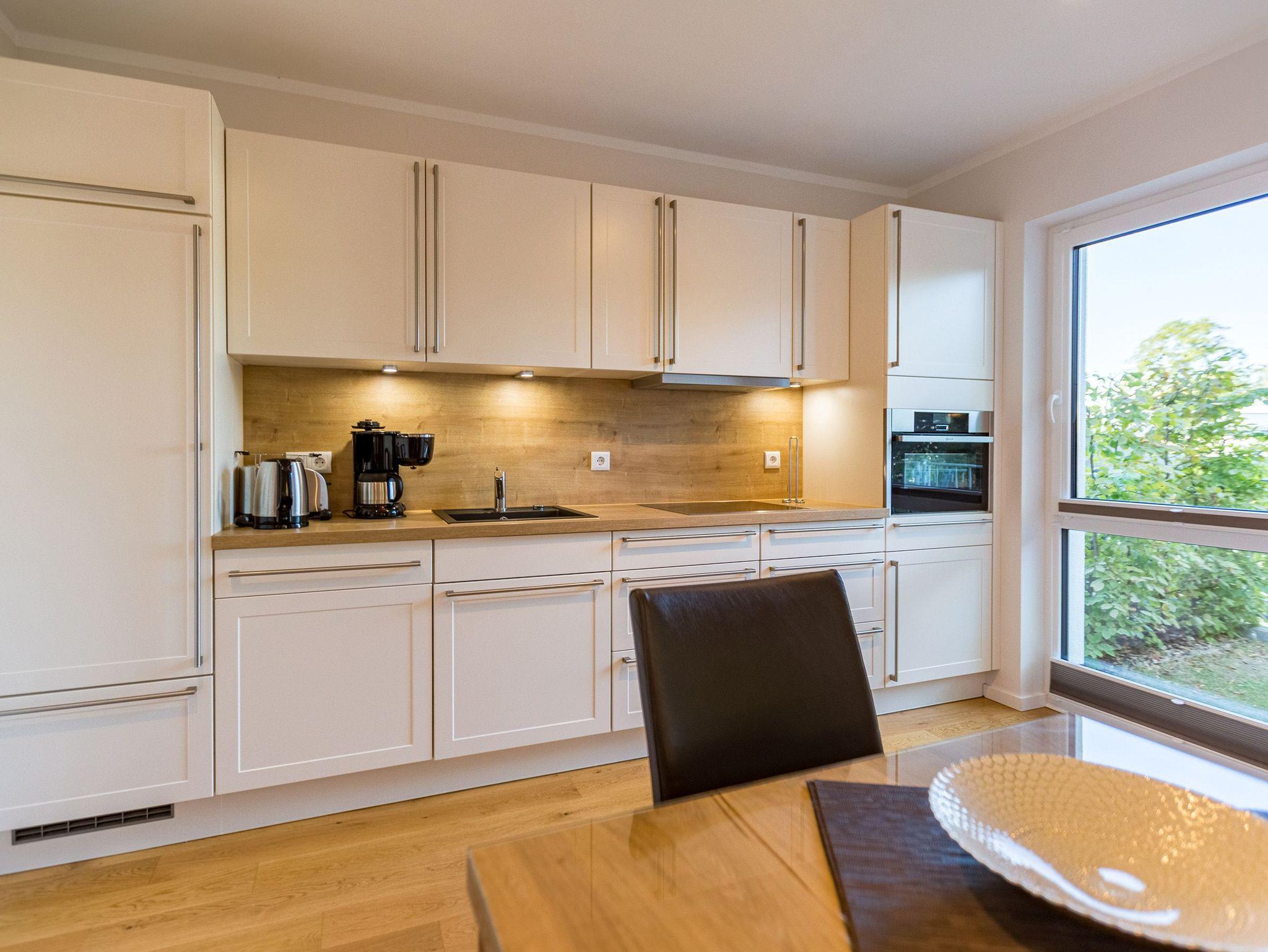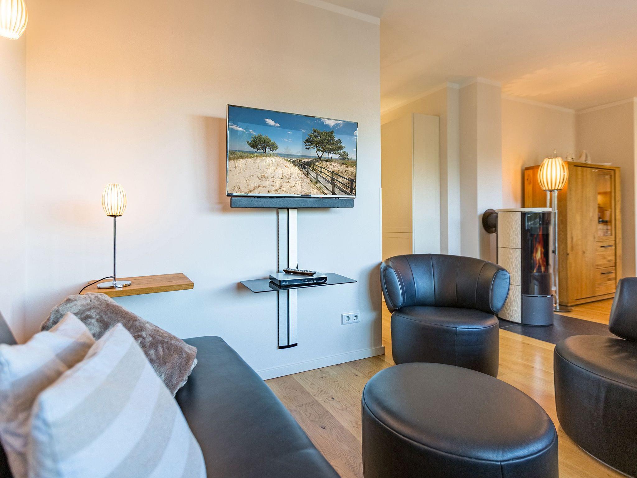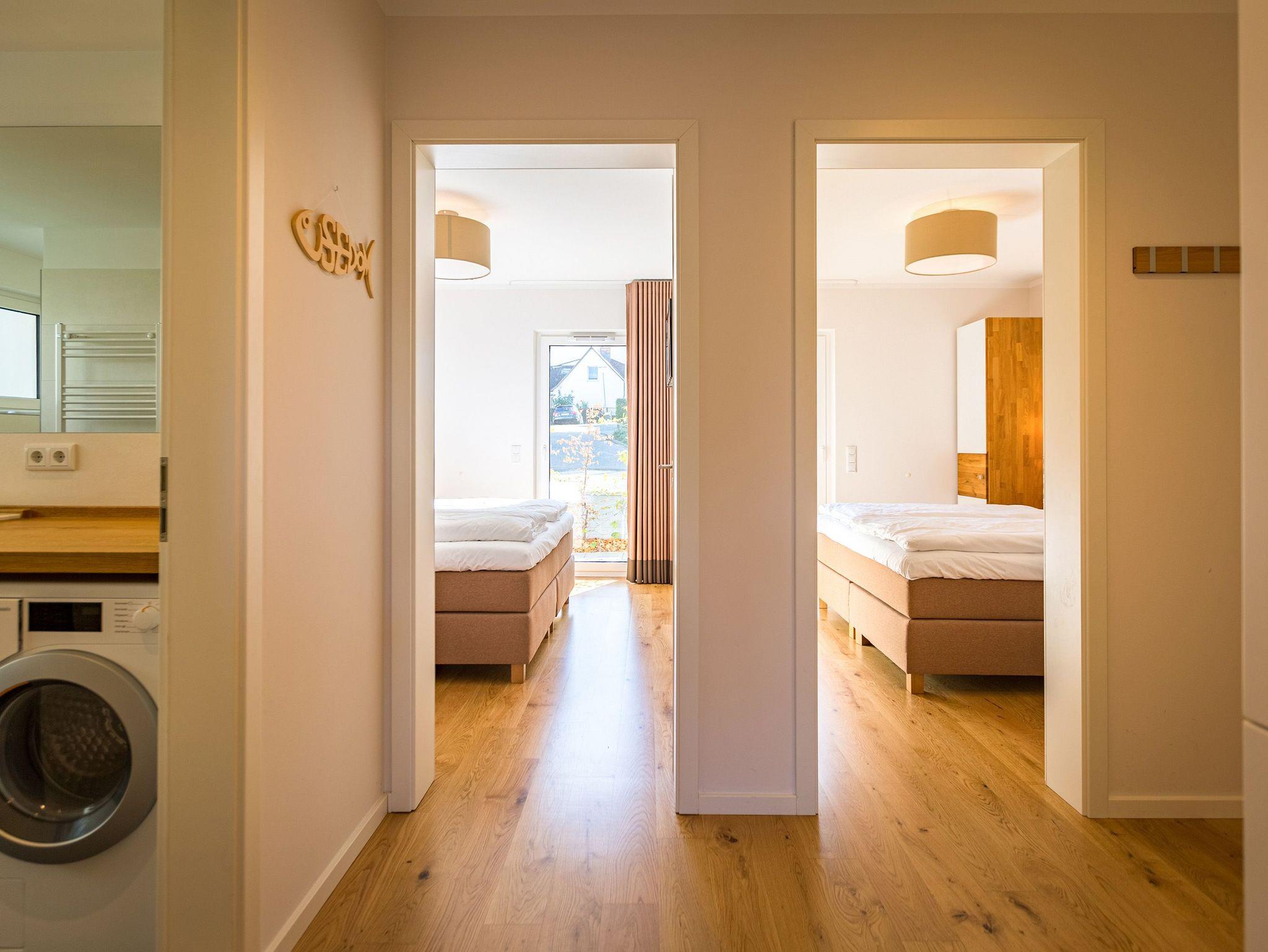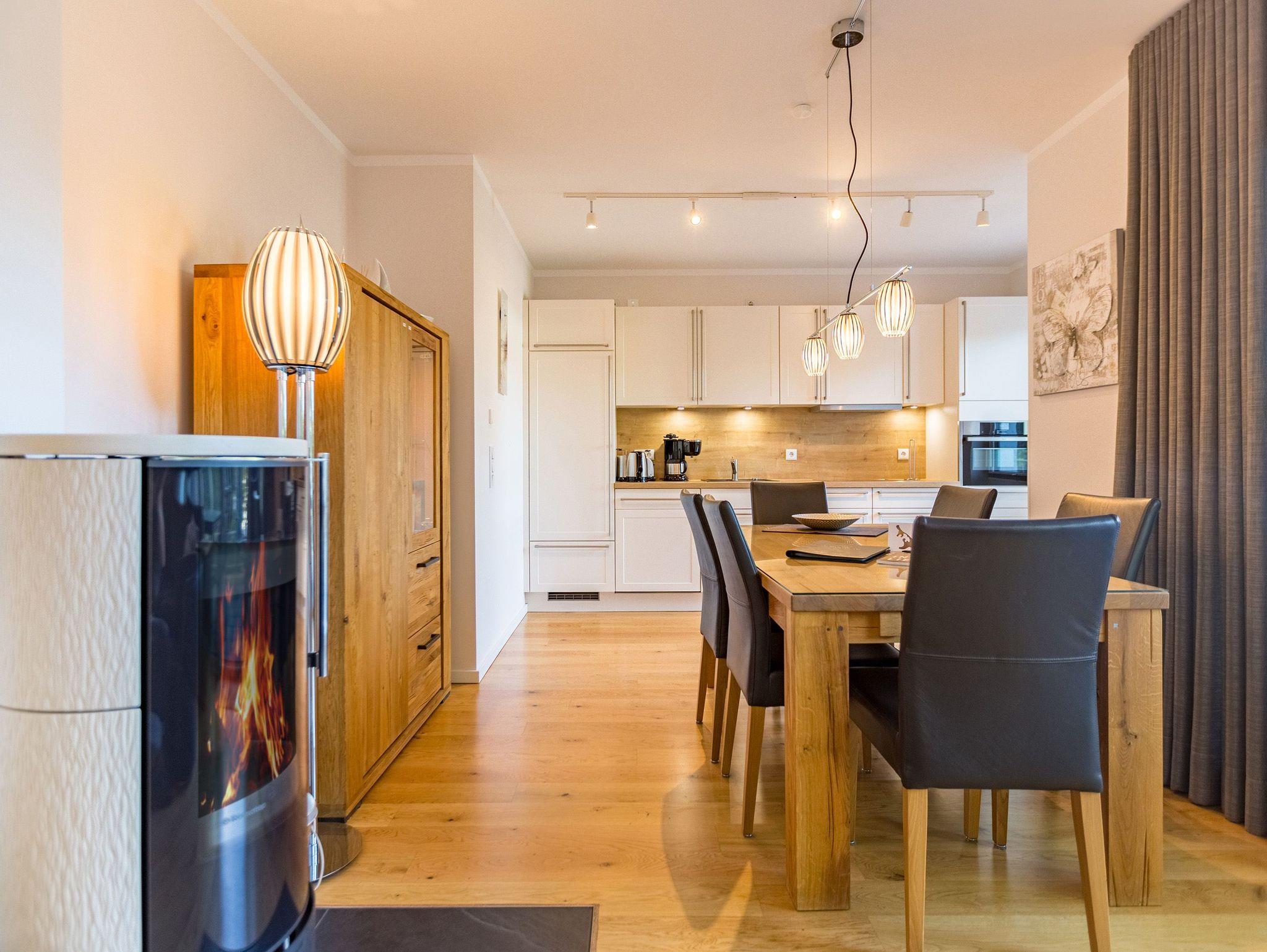 Wenn der Himmel sich im Sommer beim Untergang der Sonne in schönsten Rot- und Orange-Tönen färbt, dann können Sie auf der Terrasse Ihres Ferienparadieses sitzend diesem grandiosen Schauspiel bei einem feinen, gekühlten Getränk zuschauen. Die Wohnung 2 im Erdgeschoss des Quartiers am Fischerstrand entführt Sie auf ihren 75 großzügigen Quadratmetern in eine Welt aus warmen Farben und wunderschönen und modernen Echtholzmöbeln. Das 3-Zimmer-Appartement für vier Personen strahlt in allen seinen Räumen Eleganz aus. Zum offenen Wohnbereich gehört eine Küchenzeile mit hochwertigen Geräten wie Mikrowelle, Cerankochfeld, Backofen, Kühlschrank, Gefrierschrank, Spülmaschine und diversen Kleingeräten. Schönes Geschirr sorgt dafür, dass das Auge am schönen, großen Echtholztisch mitisst. Genießen Sie die wohlige Wärme des Kamins und entspannen Sie auf der riesigen und bequemen Sofalandschaft vor dem Flat-TV oder beim Blick ins Grüne durch die bodentiefen Panoramafenster. Zwei komfortable Boxspringdoppelbetten (beide 1,80 m x 2,00m) schenken Ihnen einen erholsamen Schlaf. In den Schränken gibt es viel Ablagefläche und in einem Schlafzimmer auch einen Safe. Die Wohnung 2 wartet gleich mit zwei Bädern auf. Beide verfügen über Dusche, WC und Waschtisch. Im Master-Bad steht eine hochwertige Miele-Waschmaschine. Zudem hat dieses noch ein kleines Highlight für Sie: Eine finnische Sauna. Für einen sorgenfreien Urlaub liegen Handtücher bereit und die Betten sind bezogen. Das WLAN ist kostenfrei nutzbar. Außerdem gehört ein Außenstellplatz zu der Wohnung. Für Ihre Fahrräder steht neben der Wohnung hinter dem dazugehörigen Parkplatz ein Fahrradständer ( für 4 Räder) zur Verfügung.