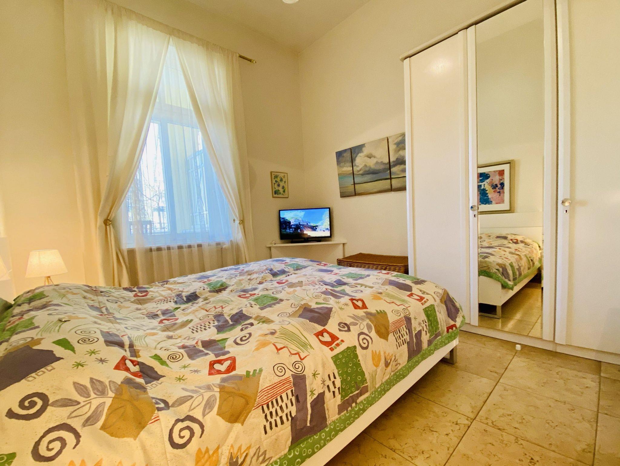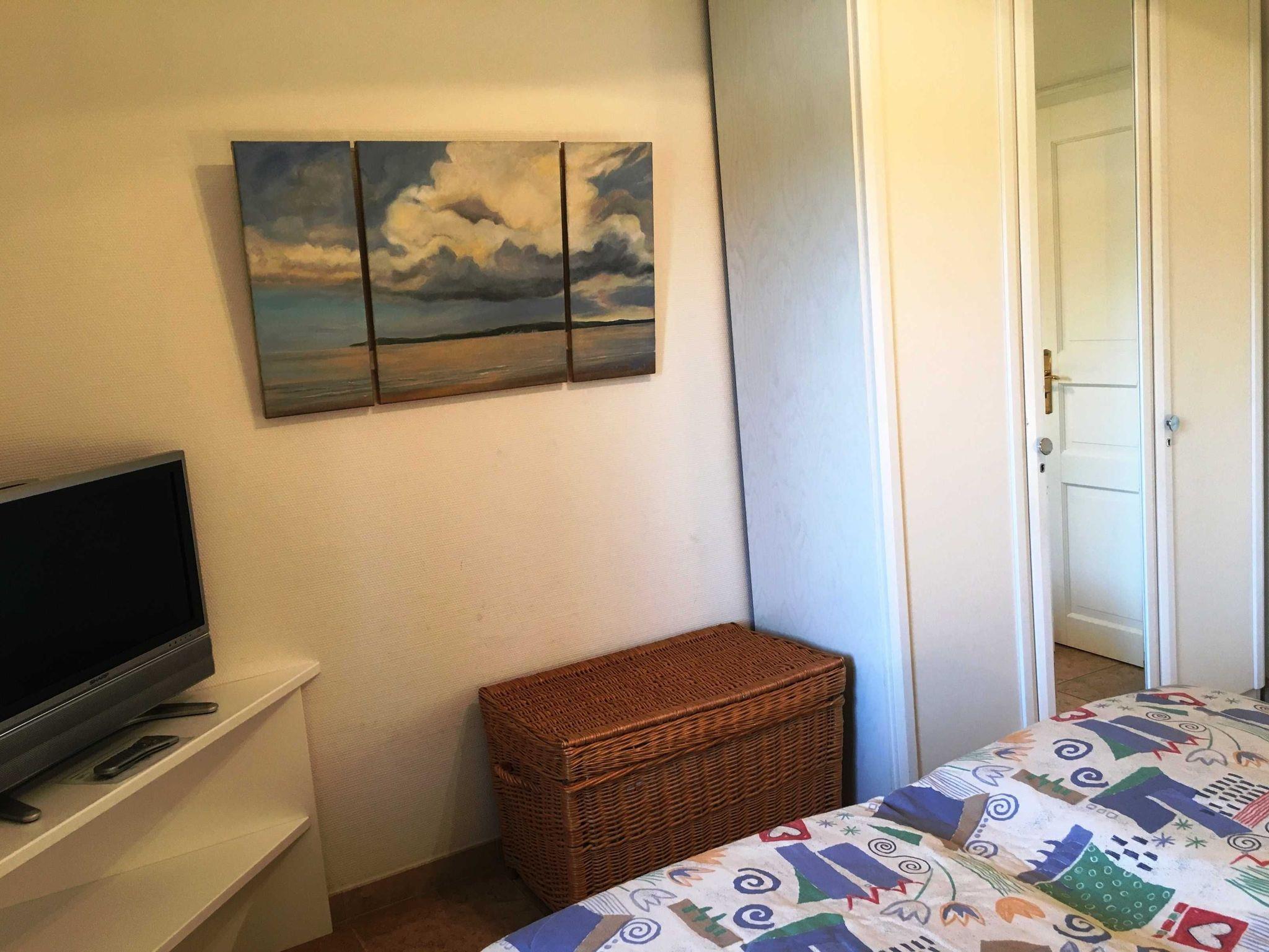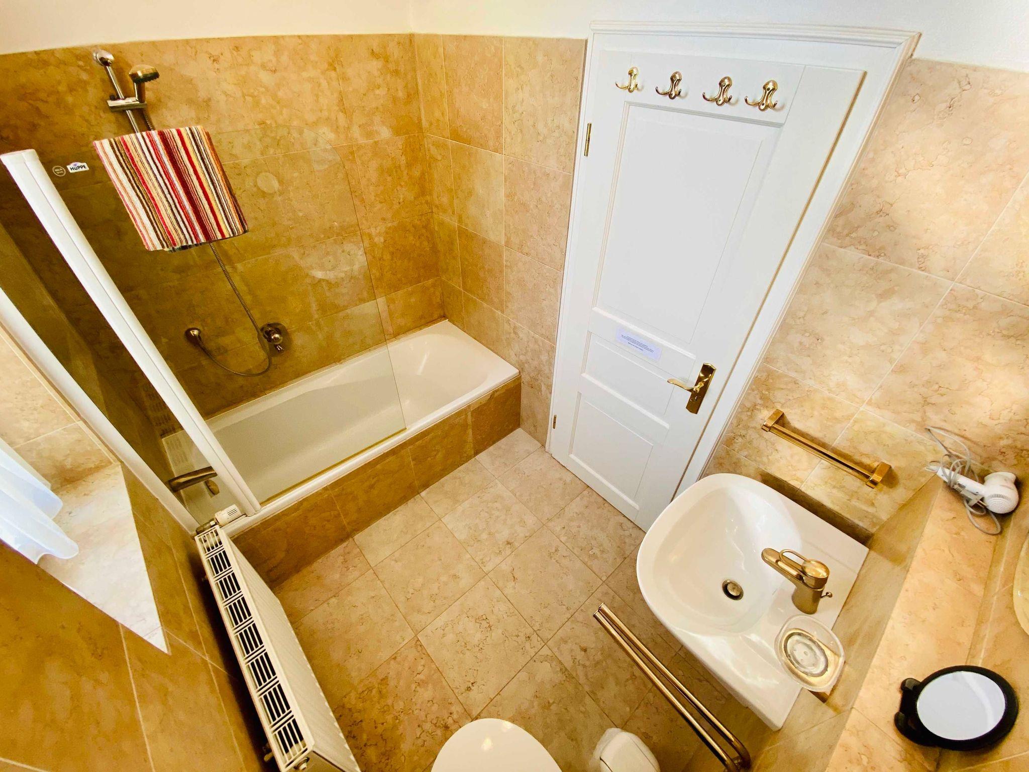 Im Schlafzimmer steht ein großes Doppelbett und ein zusätzlicher TV zur Verfügung. Das Bad hat eine Badewanne mit Duschabtrennung. Für die 3. bzw. 4. Person gibt es im Wohnzimmer Gästebetten.