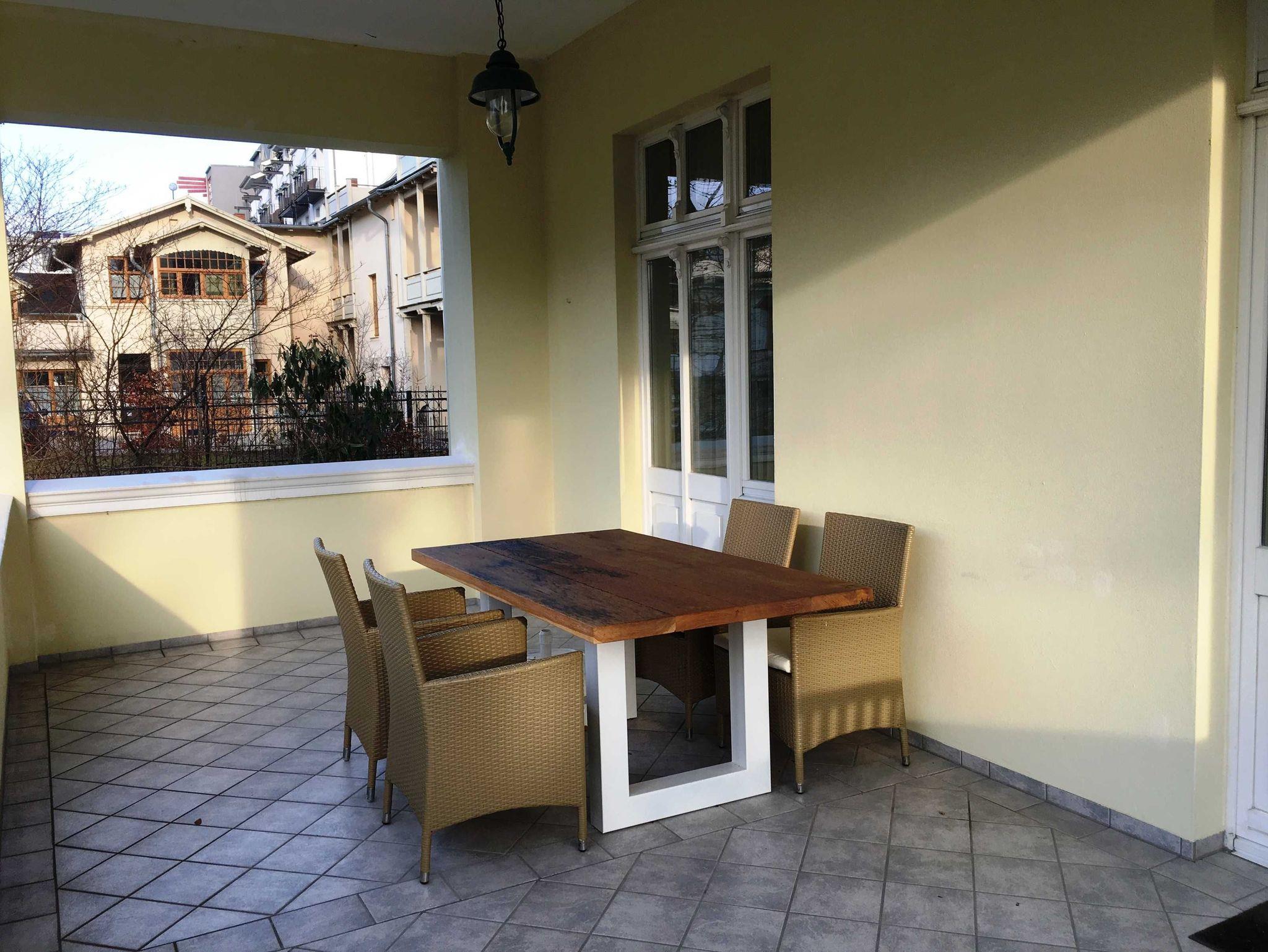 Die Zweiraum-Ferienwohnung befindet sich im ersten OG der Villa und ist durch das Treppenhaus zu erreichen. Sie besteht aus einem großen Wohnbereich, in den die Küchenzeile mit Esstisch integriert wurde. Von hier aus gelangt man auf zwei überdachte Balkone, auf denen man das Leben im Freien genießen kann.