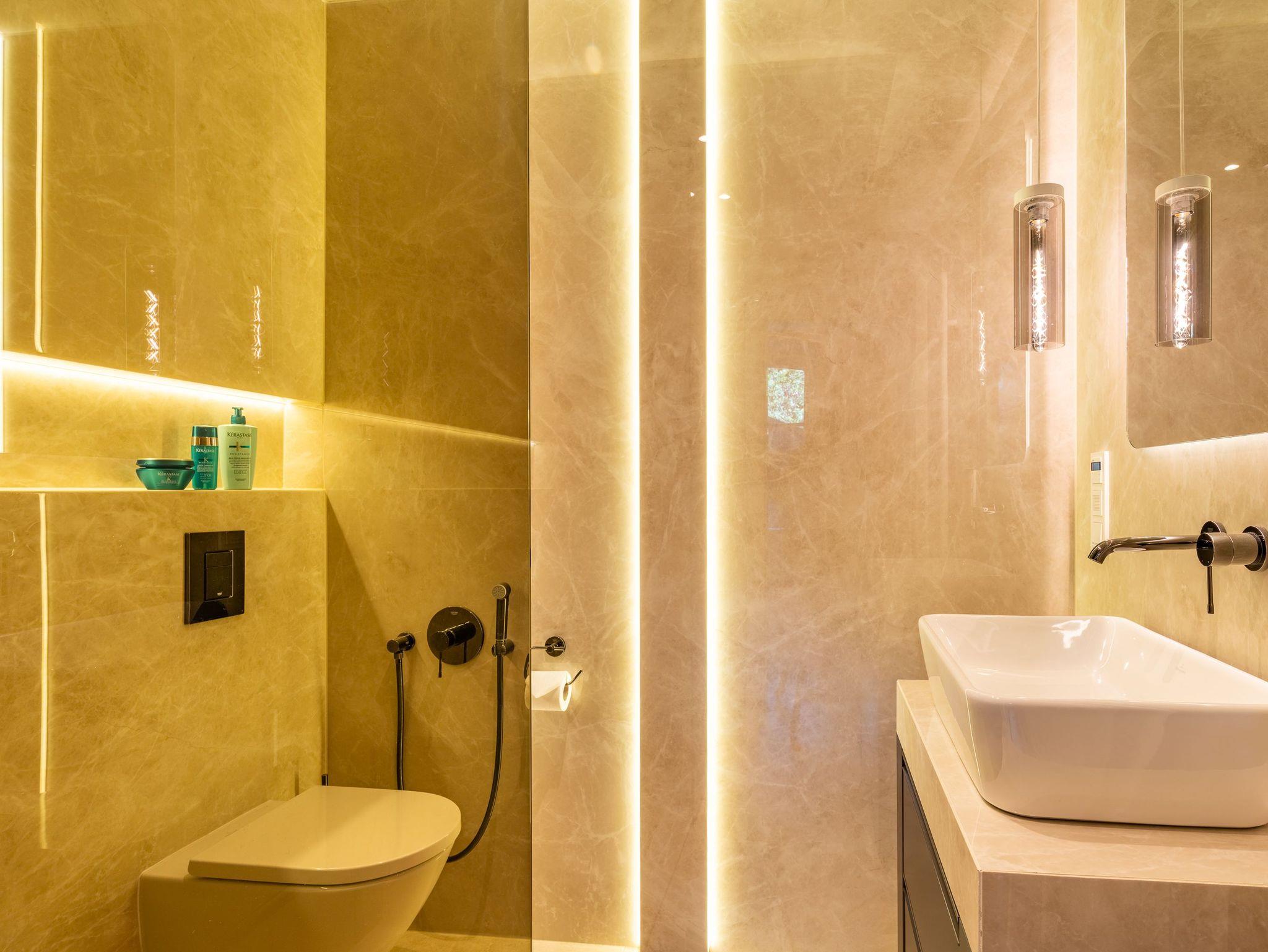Über eine Wendeltreppe erreichen Sie das Gartengeschoss, das mit einem durchdachten Raumkonzept überzeugt. Das Masterschlafzimmer mit großzügiger Glasfront, Doppelbett, begehbarem Kleiderschrank und Smart-TV bietet direkten Zugang zur eigenen Terrasse mit zwei Sonnenliegen. Das luxuriöse Bad en Suite ist mit Badewanne, Dusche, WC und Haartrockner ausgestattet.