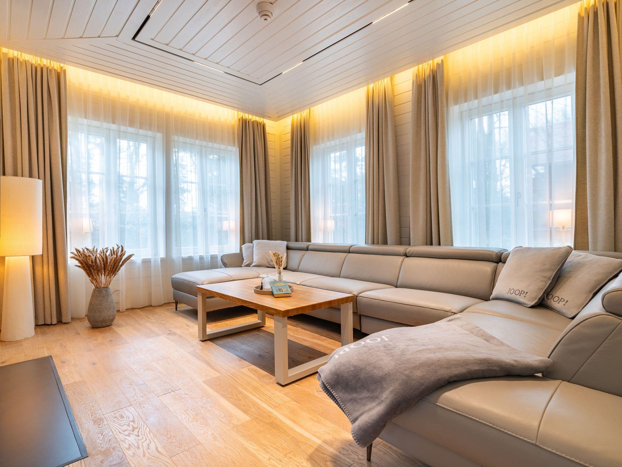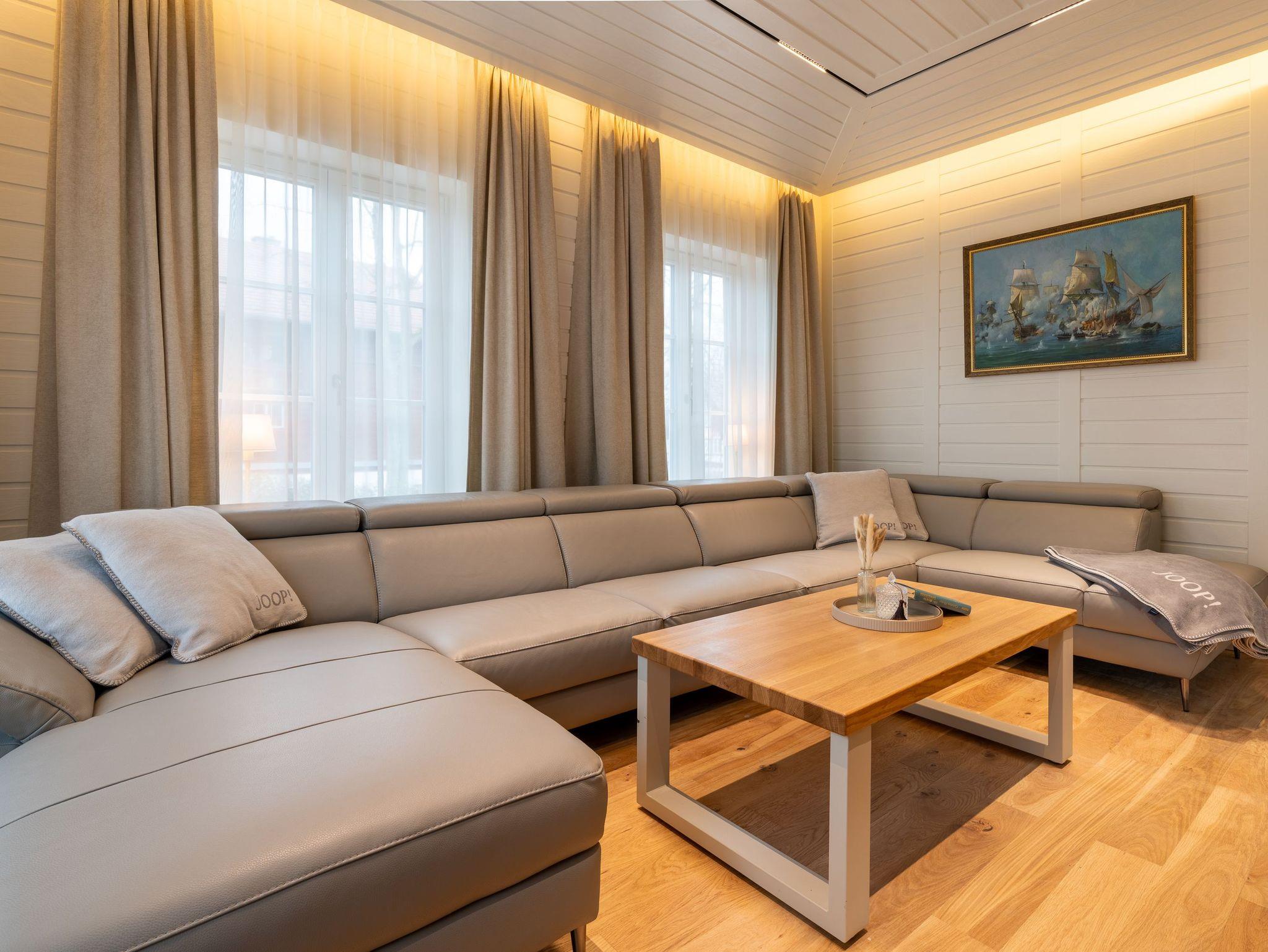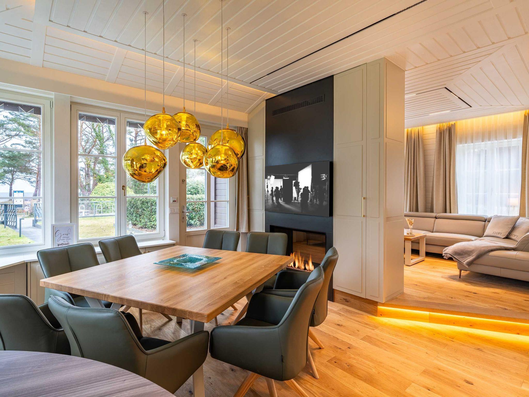 Im Erdgeschoss erwartet Sie ein offener Wohnbereich mit direktem Blick auf den Strandabgang und das sanfte Glitzern der Ostsee. Das bequeme Sofa lädt zum Verweilen ein, Smart-TV und eleganter Gaskamin sorgen für gemütliche Abende.