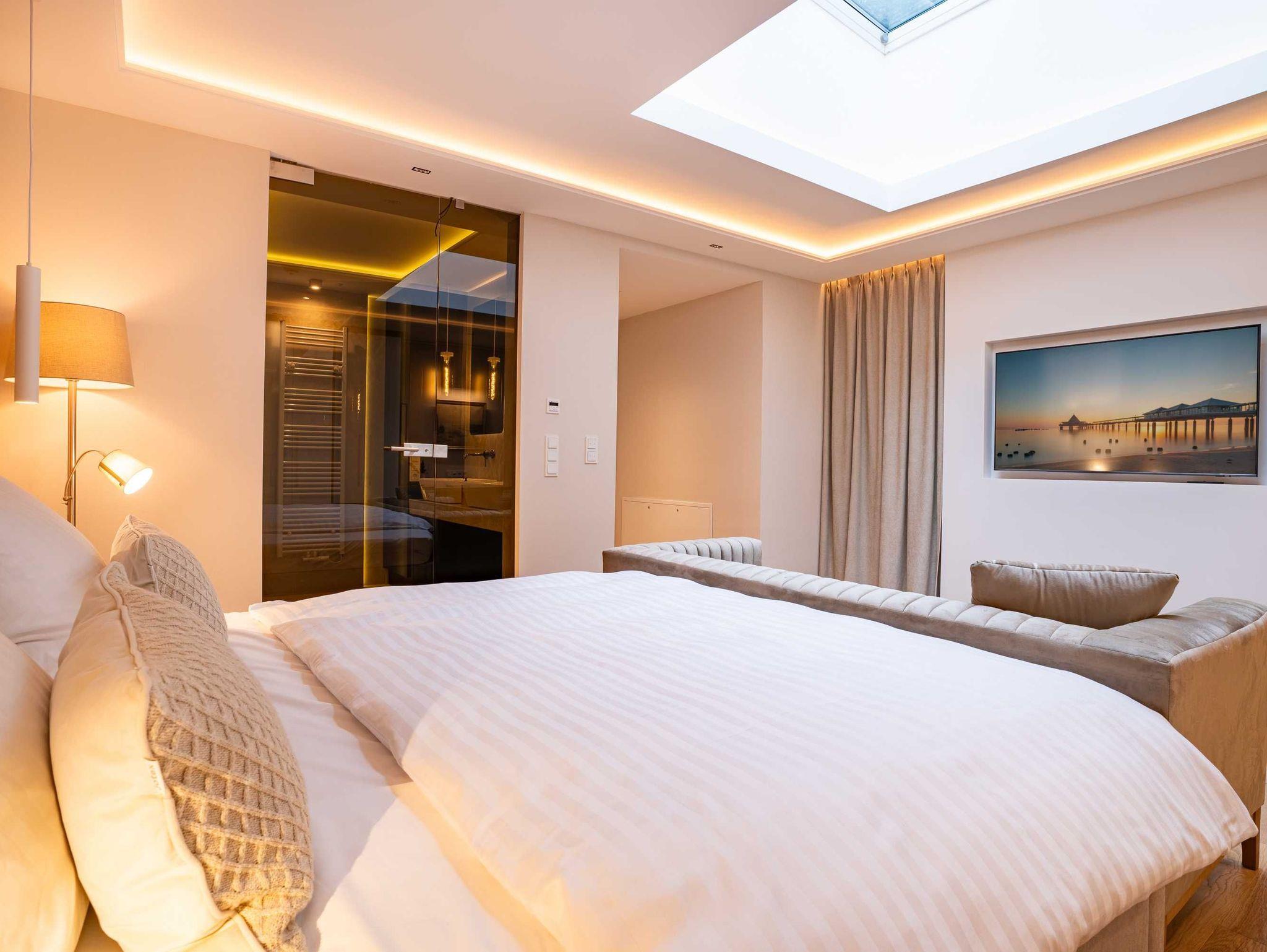 Auf zwei großzügigen Ebenen verteilen sich 225 Quadratmeter Wohnfläche mit Platz für bis zu acht Personen. Das hochwertige 5-Raum-Appartement steht für zeitlose Architektur, durchdachtes Design, erstklassige Ausstattung und unmittelbare Strandnähe.