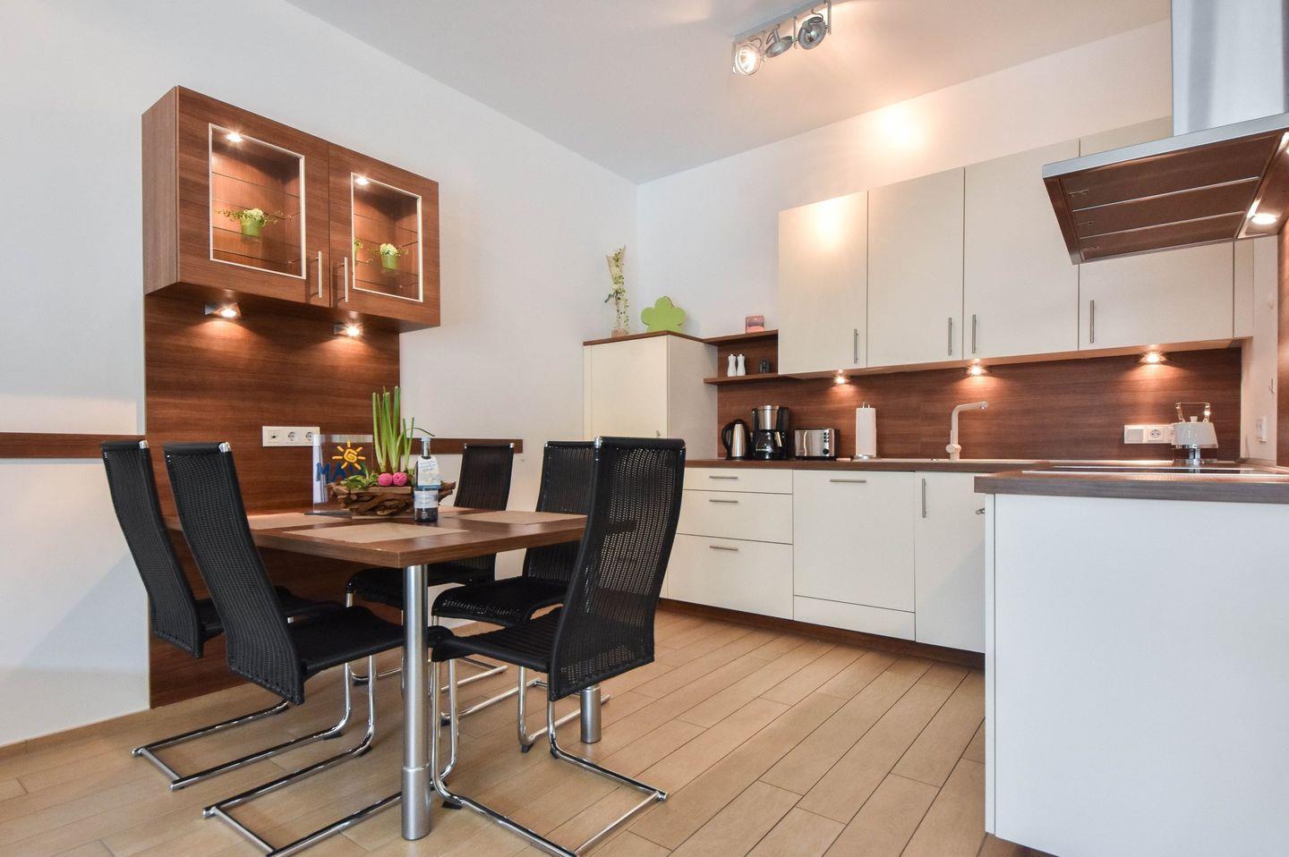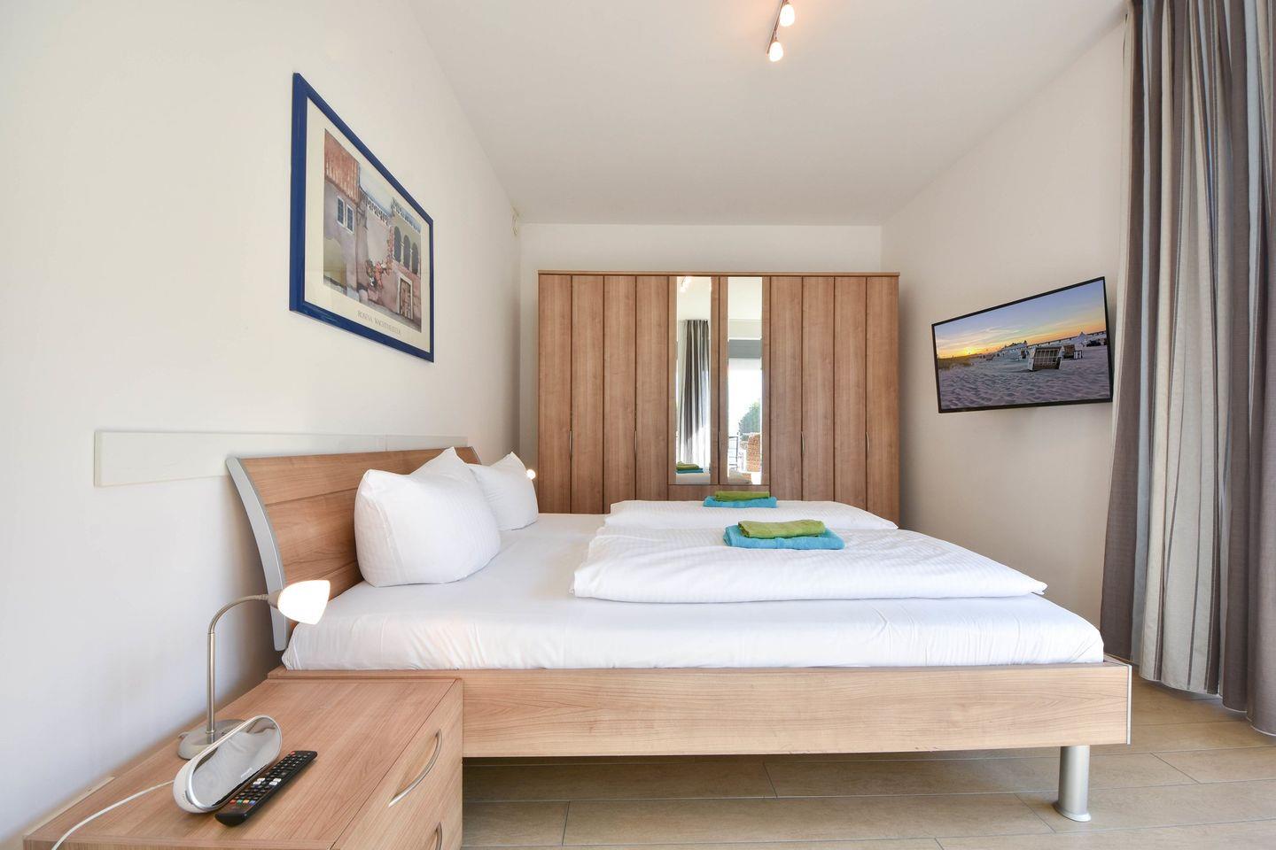 Hier erwartet Sie eine großzügige 3-Raum-Ferienwohnung mit Rasenfläche in ruhiger Lage des Kaiserbades Heringsdorf. Das Haus ist nur 200 Meter entfernt vom feinsandigen, weißen Strand entfernt und bietet ideale Voraussetzungen für Ihren Urlaub. Die Wohnung verfügt über ein großes Wohn- und Esszimmer, welches offen gestaltet ist. Es beinhaltet neben einem modernen TV-Gerät auch eine Soundbar sowie eine voll ausgestattete Küche samt Backofen, Ceranfeld und Geschirrspüler. Vom Wohnraum haben Sie Zugang zur großen Terrasse. Dank südlicher Ausrichtung ist Abendsonne garantiert. Die Fenster der gesamten Wohnung können mit elektrischen Außenjalousien abgedunkelt werden. Für Ihren Komfort sind Waschmaschine und Trockner im Hauswirtschaftsraum der Wohnung vorhanden. Beide Schlafzimmer sind mit einem Doppelbett eingerichtet und bieten ausreichend Stauraum für Ihre Garderobe. Vom größeren Schlafzimmer (Maße des Bettes 2,00m x 2,00m) ist ein weiterer Zugang zur Terrasse gewährleistet. Ein zusätzlicher Fernseher sorgt für Unterhaltung. Das angeschlossene Badezimmer ist mit einer ebenerdigen Dusche ausgestattet. Im kleineren Schlafzimmer (Maße des Bettes 1,80m x 2,00m) befindet sich ebenfalls ein eigener Fernseher. Das zweite Badezimmer verfügt über eine Dusche und bietet Zugang zum Hauswirtschaftsraum.
