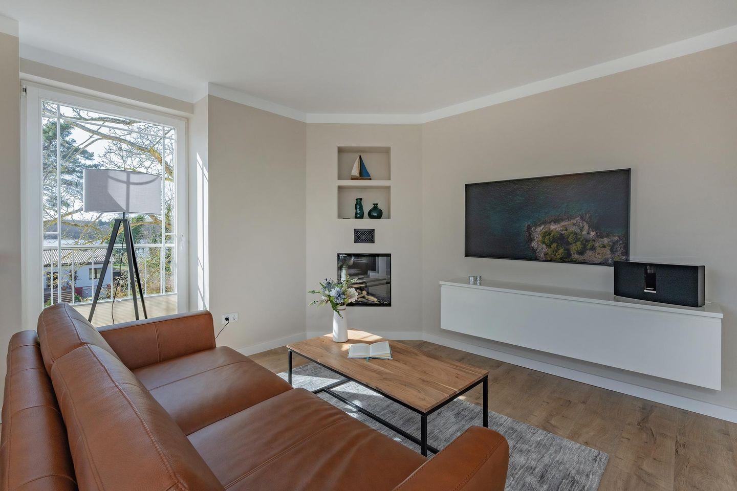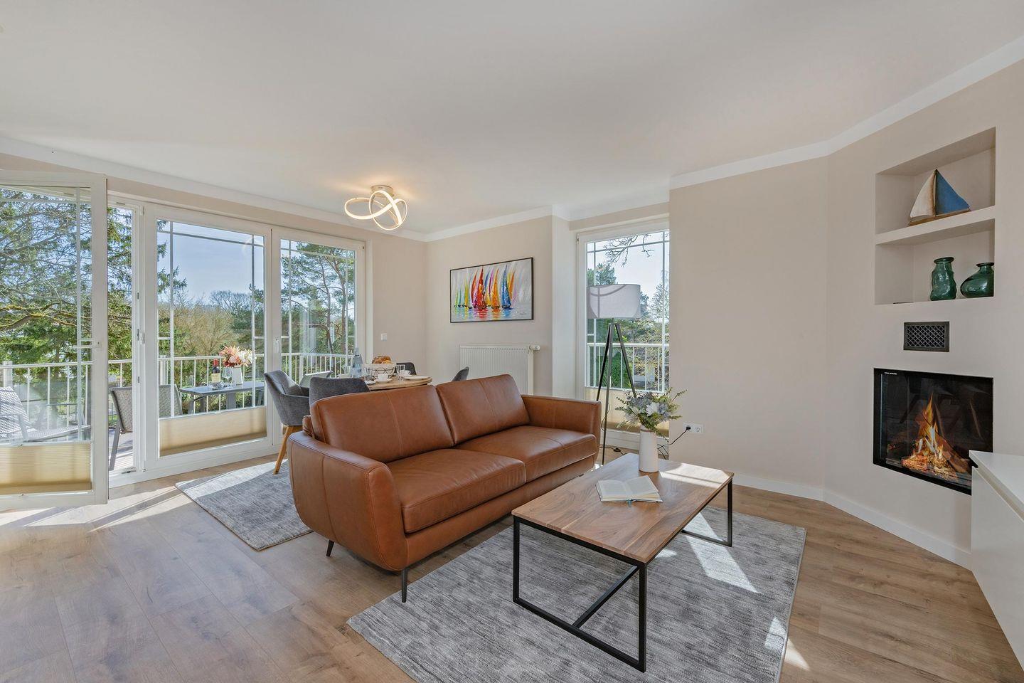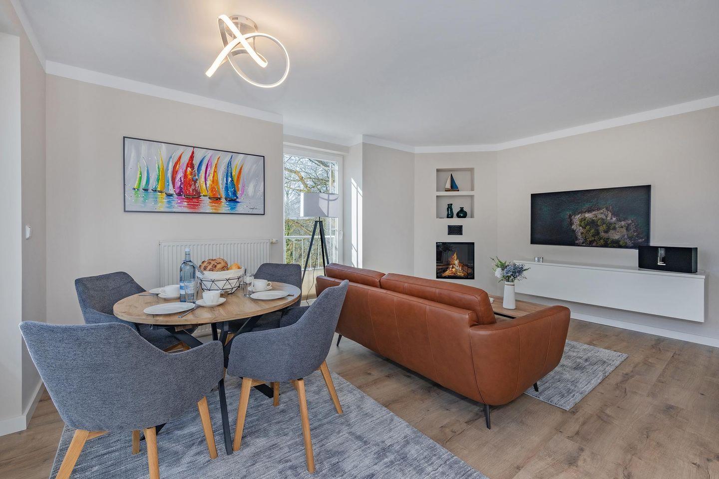 Entdecken Sie die neu renovierte Ferienwohnung "Haus Strandoase 24“, ein wahres Juwel in Heringsdorf auf der Insel Usedom, das höchste Urlaubsansprüche erfüllt. Diese 56 Quadratmeter große Oase im zweiten Obergeschoss, nur einen Steinwurf von der lebhaften Promenade entfernt, ist der ideale Ausgangspunkt für unvergessliche Urlaubstage. Das moderne Wohnzimmer, ein Ort der Entspannung, besticht durch einen Elektrokamin, einen zeitgemäßen Flachbildfernseher und ein Internetradio. Die neue, voll ausgestattete Küche mit hochwertigen Elektrogeräten, einschließlich Mikrowelle und Geschirrspüler, lässt keine Wünsche offen. Eine elegante Ledercouch und ein Esstisch für vier Personen ergänzen das stilvolle Ambiente, während der Balkon einen herrlichen Blick auf die Umgebung freigibt.