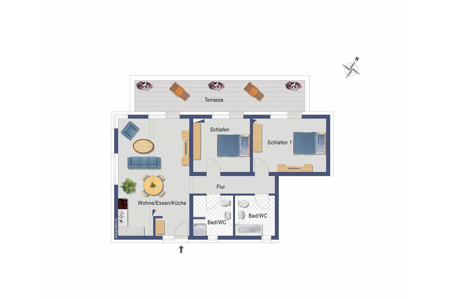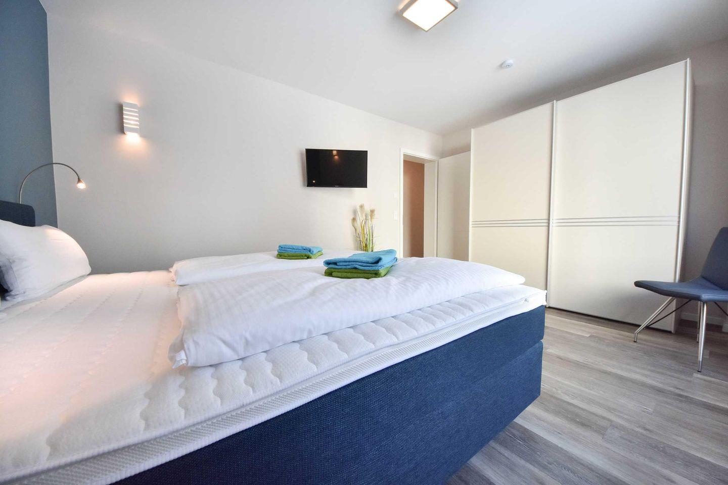Der große Wohnraum mit offener Küche und angrenzendem Essbereich ist das Herzstück der Wohnung. Von hier aus haben Sie Zugang zum großen Westbalkon, der sich entlang des Wohnraumes bis hin zu den Schlafzimmern erstreckt. Beide Schlafzimmer verfügen über ein Doppelbett und einen großen Kleiderschrank, eines zusätzlich über einen zweiten Fernseher. Für Ihren Komfort sind zwei Badezimmer vorhanden. Eines besitzt eine Badewanne, das Zweite eine ebenderige Dusche. Bei der Einrichtung der gesamten Wohnung wurde höchster Wert auf Qualität gelegt. So müssen Sie beispielsweise nicht auf gewärmte Handtücher verzichten. Die Fußbodenheizung sorgt in allen Räumen für eine angenehme Wärme.