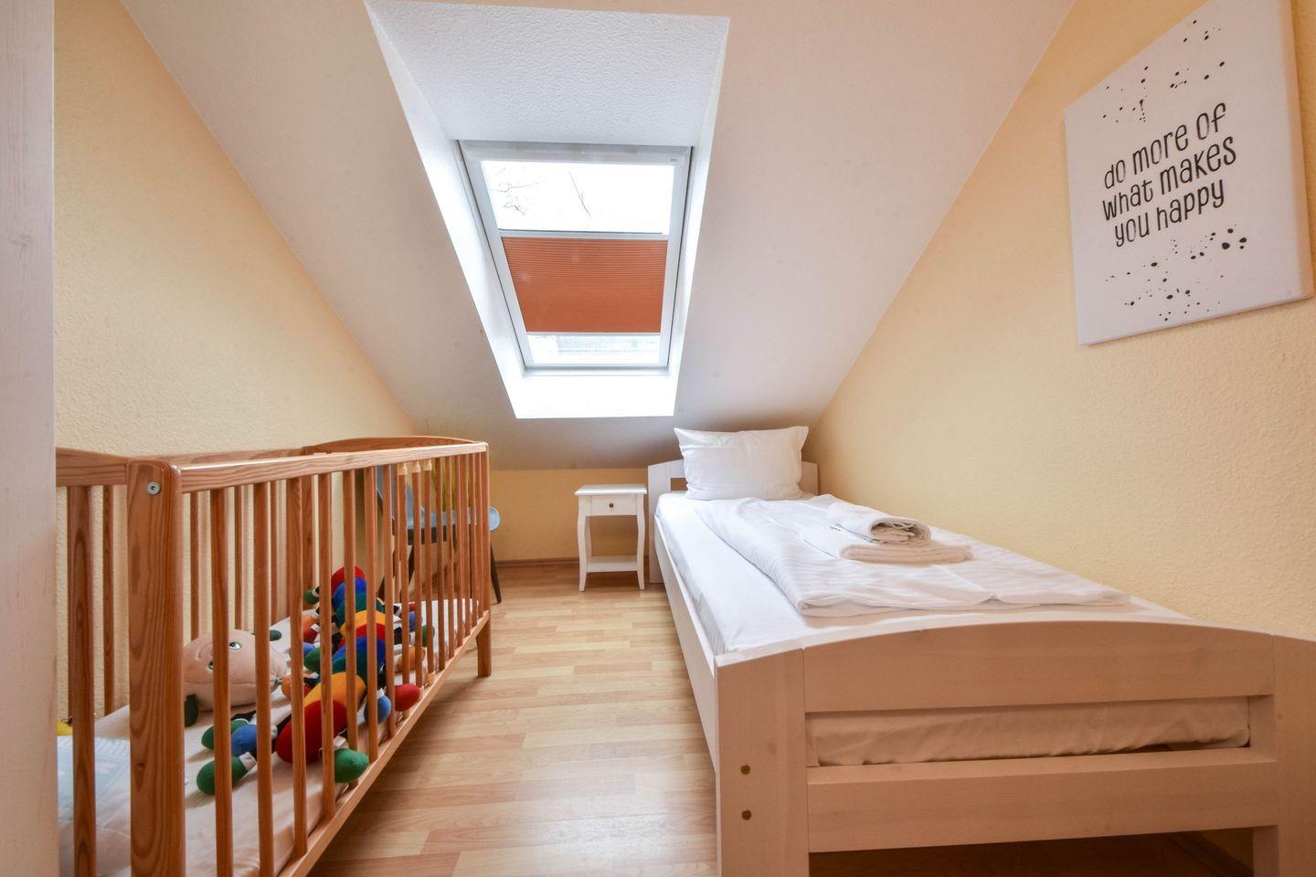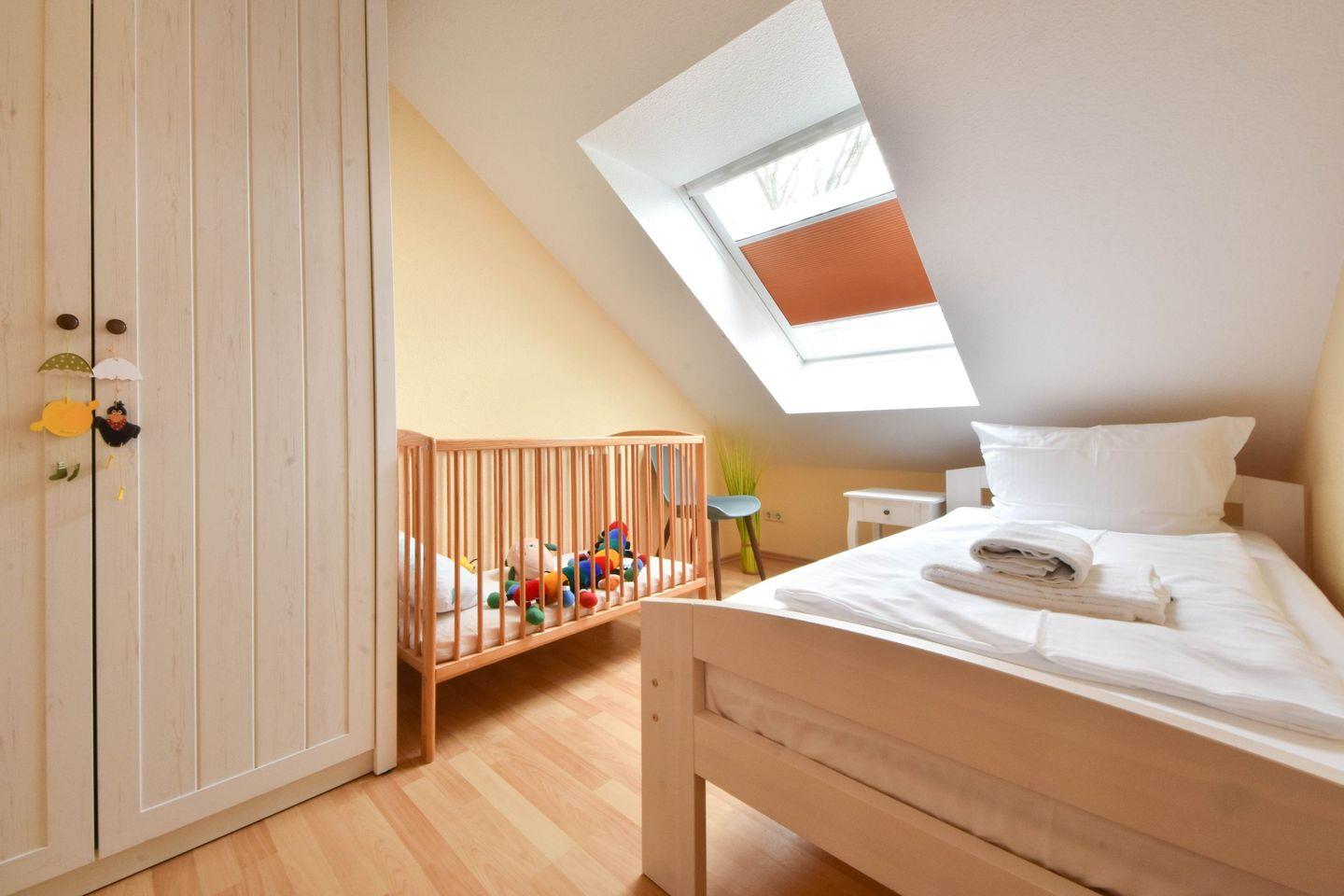 Für die ganz kleinen Besucher stehen ein Babyreisebett mit Matratze jedoch ohne Wäscheausstattung und ein Kinderhochstuhl kostenfrei zur Verfügung. WLAN ist vorhanden und für Sie kostenfrei. Ihren PKW können Sie auf einen eigenen Stellplatz auf dem Gelände parken. Fahrräder können im Fahrradschuppen oder an den Fahrradständern der Anlage untergebracht werden. Sowohl Waschmaschine als auch Trockner sind im Keller des Hauses und können von Ihnen gegen Gebühr genutzt werden.