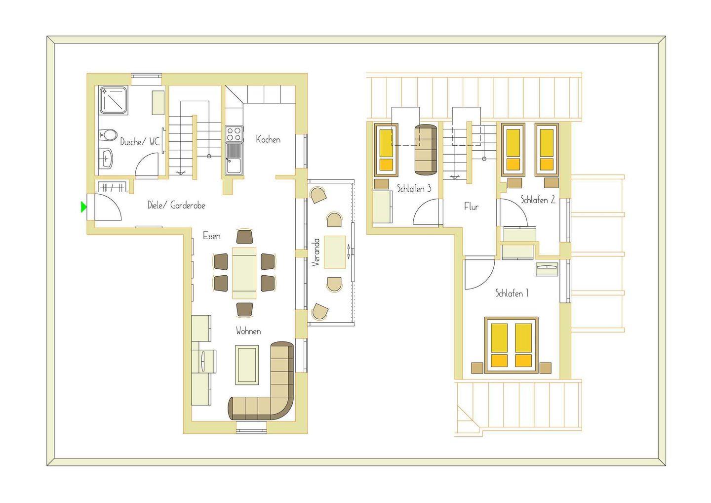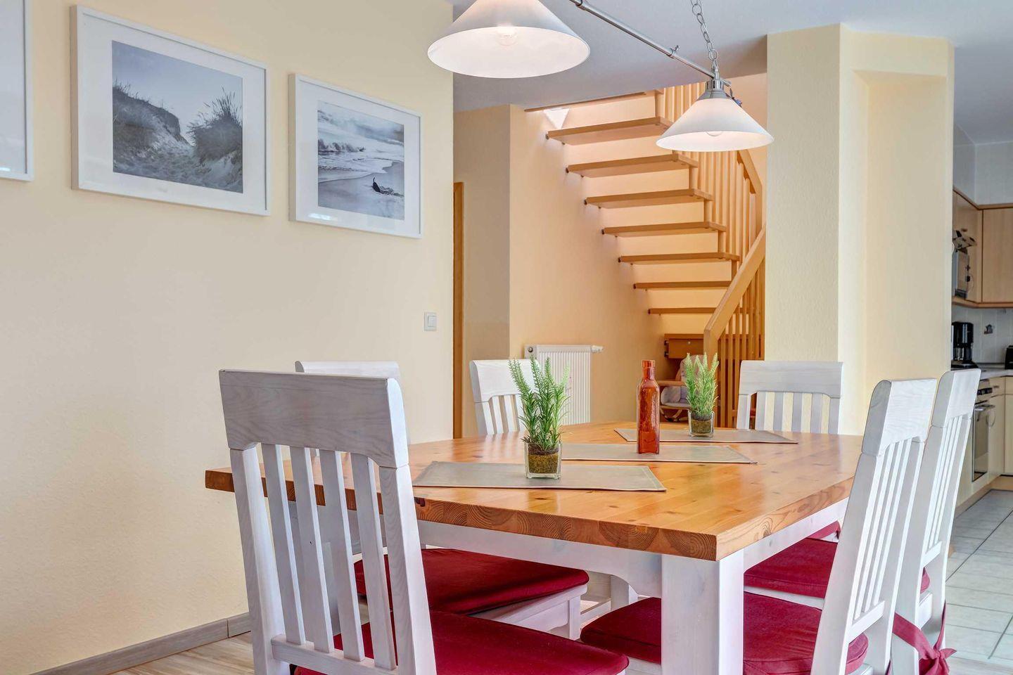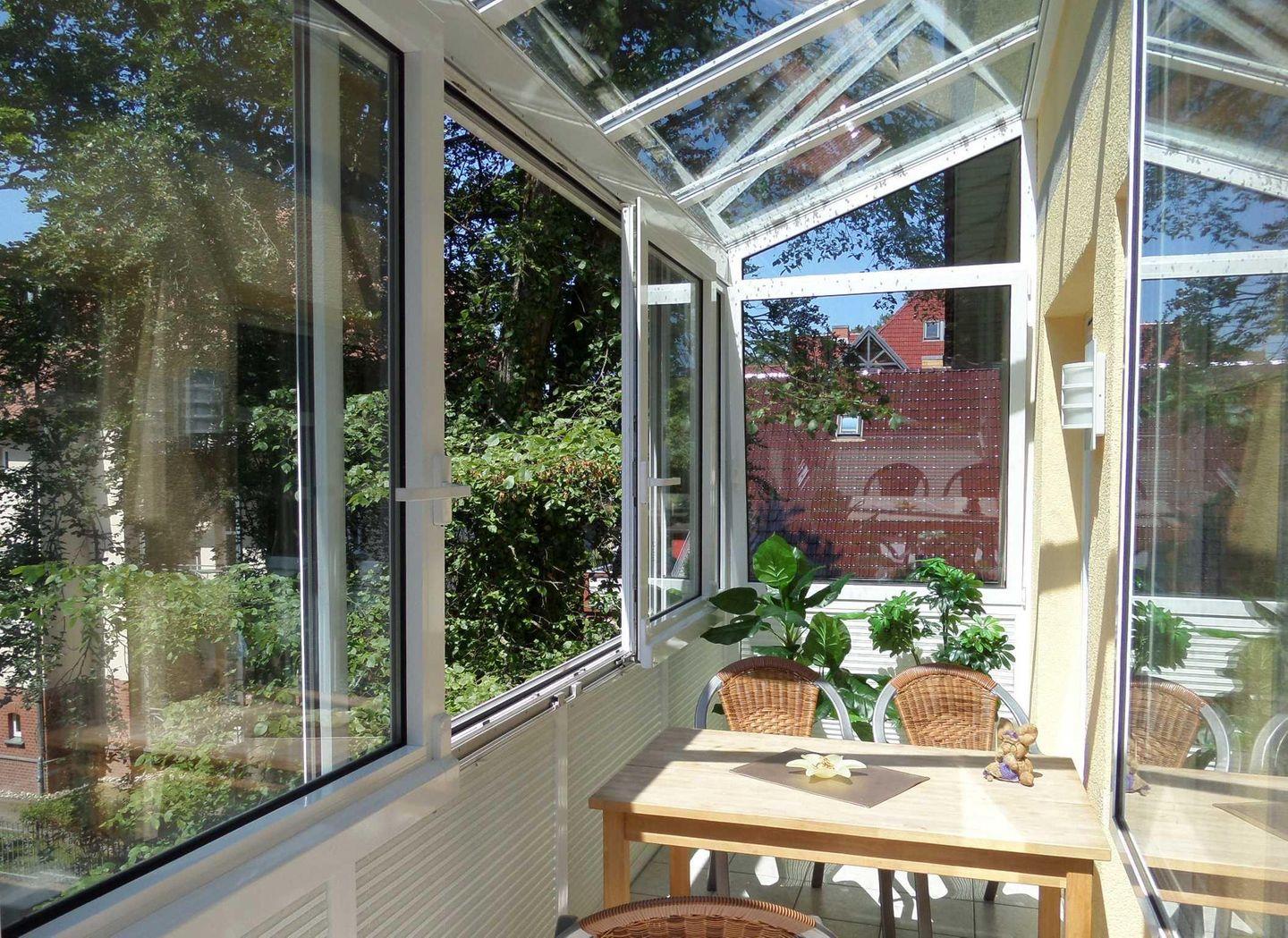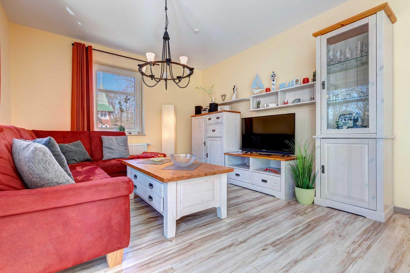 Diese liebevoll eingerichtete Ferienwohnung befindet sich als Maisonettewohnung im 2. Obergeschoss des Hauses und bietet Platz für 2 bis 5 Personen. Neben einem großen, offenen Wohnraum halboffener Küche befindet sich auch das Tageslichtbad mit Dusche auf dieser Etage. Über eine Treppe in der Wohnung gelangen Sie in die obere Etage mit den Schlafräumen. Hier finden Sie ein großes Schlafzimmer mit Doppelbett und zweitem Fernseher, sowie ein Zimmer mit zwei getrennt stehenden Einzelbetten und ein weiteres Schlafzimmer mit einem Einzelbett vor. Highlight der Wohnung ist die große verglaste Veranda, auf der Sie frühstücken und die Sonne genießen können.