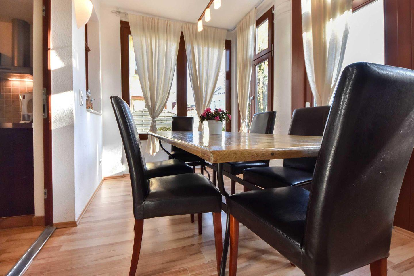 Diese komfortable Ferienwohnung mit einer Wohnfläche von großzügigen 85 Quadratmetern erwartet Sie im Erdgeschoss der Villa Lamora, die sich in einer verkehrsberuhigten Nebenstraße im Herzen von Heringsdorf befindet. Der Wohnbereich überzeugt mit einer gemütlichen Couchecke. In der kalten Jahreszeit sorgt der Kamin für eine angenehme Wohlfühlwärme. In der voll ausgestatteten Küche bereiten Sie Ihre Lieblingsspeisen während des Urlaubs zu. Der große Esstisch in der angrenzenden, nach Osten ausgerichteten Loggia, lädt bis zu sechs Personen zu den gemeinsamen Mahlzeiten ein. Genießen Sie milde Sommerabende bei einem Wein auf der möblierten Terrasse, die direkt von der Loggia aus begehbar ist. Das große Schlafzimmer ist mit einem bequemen Doppelbett und einem zusätzlichen Fernseher ausgestattet. Im kleinen Schlafzimmer befinden sich ein Einzel- sowie ein Etagenbett. Das Badezimmer verfügt über eine Dusche, WC und Waschtisch. Ein zusätzliches Gäste-WC komplementiert den Wohlfühlfaktor.