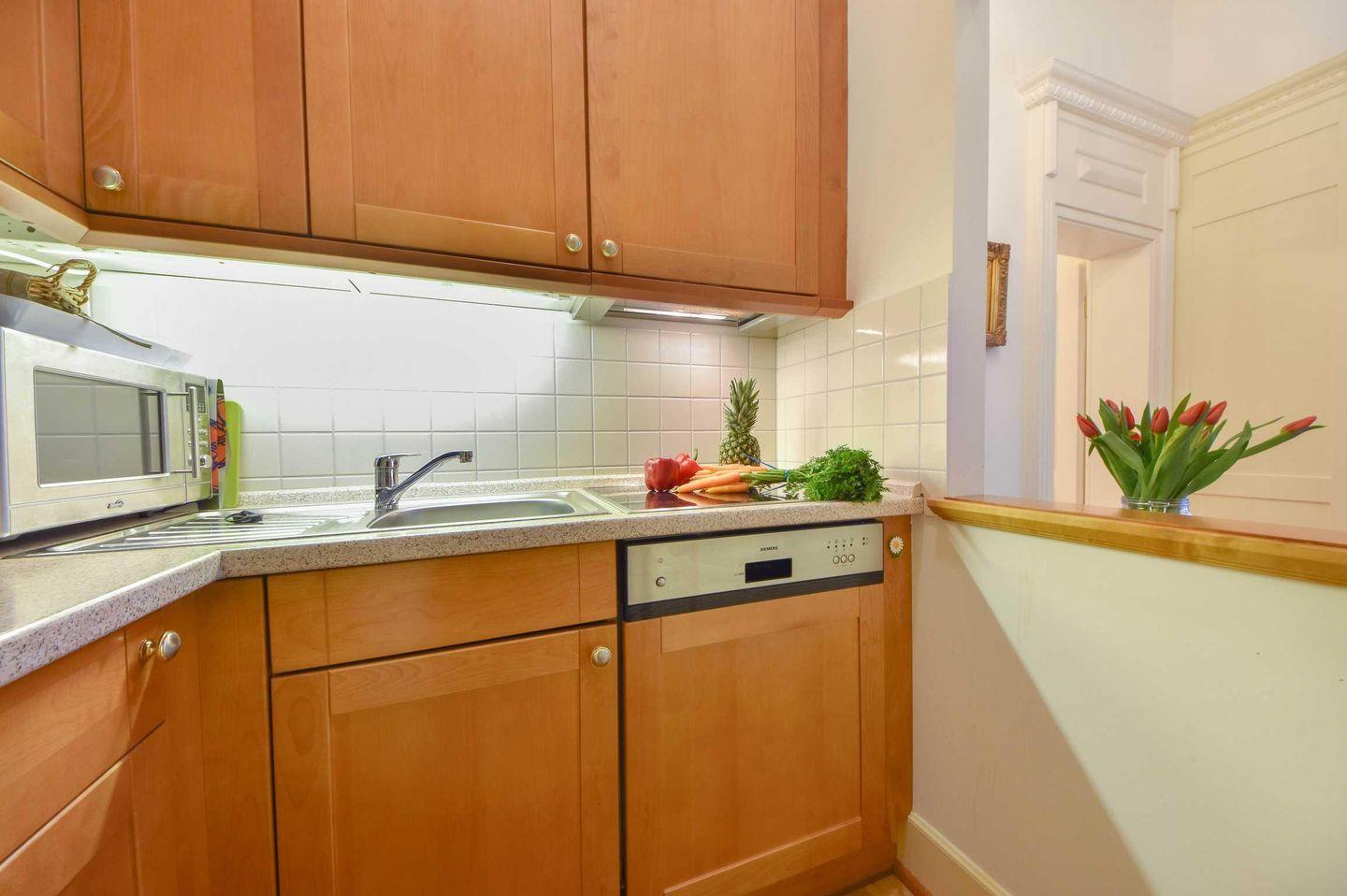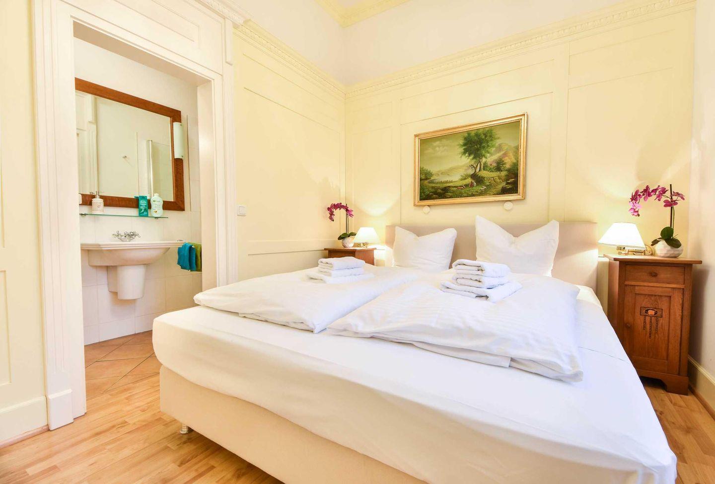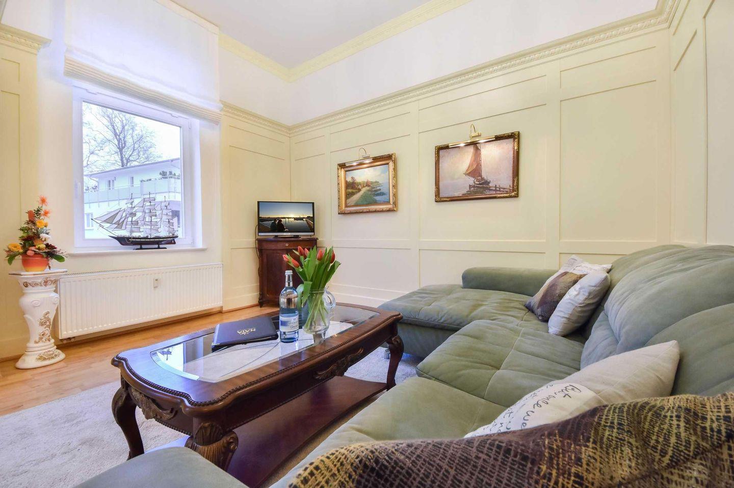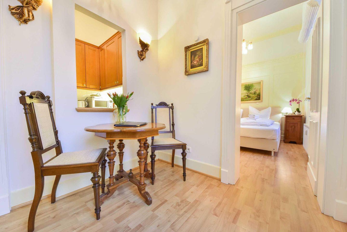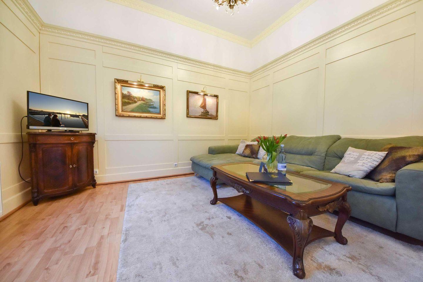 Das Appartement 23 in der ersten Etage der historischen Villa Usedom verfügt über großzügige, helle Räume und ist ideal für Ihren Urlaub in bester Lage. Hochwertige Tischlerarbeiten, stuckverzierte Decken und dazu eine moderne, komfortable Ausstattung machen dieses Appartement so besonders. Der Wohnbereich ist mit Sitzgruppe und Flat-TV ausgestattet. Eine kleine Küche mit Durchreiche wird vom Essplatz ergänzt. Das Schlafzimmer mit bequemem Doppelboxspringbett und Einbauschrank sorgt für erholsame Nächte, hier grenzt ein Duschbad an. Der kleine Westbalkon bietet einen schönen Blick auf die Klenzestraße und die umliegenden Bäderstilvillen. Bei klarer Sicht erhaschen Sie einen Blick auf die Ostsee.