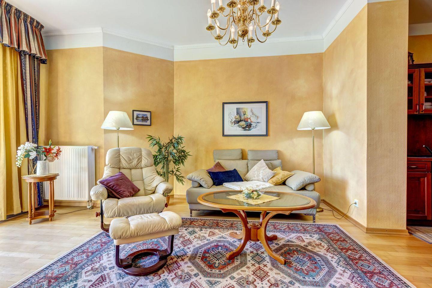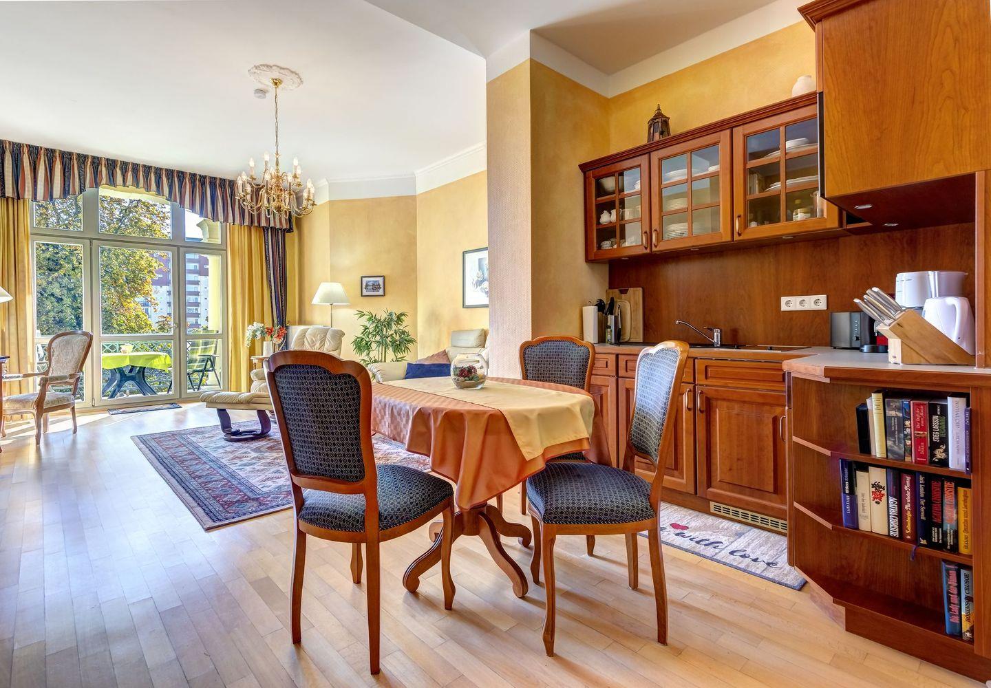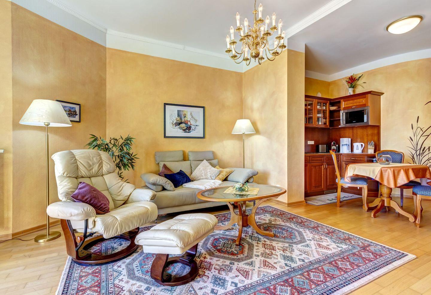 Das Seeschloss gehört in den Kaiserbädern zu einem der repräsentativsten Bauten aus der Gründerzeit und befindet sich unmittelbarer Nähe zur Seebrücke und dem Ostseestrand. Dank der äußerst zentralen Lage können Sie das Auto hier bequem stehen lassen und einen erholsamen Aufenthalt auf der Insel Usedom genießen. Die Ferienwohnung befindet sich in der zweiten Etage. Ein Fahrstuhl ist für Ihren Komfort vorhanden. Das gesamte Appartement ist dem Stil des Hauses angepasst und hochwertig durch einen Hotelausstatter eingerichtet, sodass Vorhänge, Couchgarnituren und Teppiche im gleichen Design vorzufinden sind.