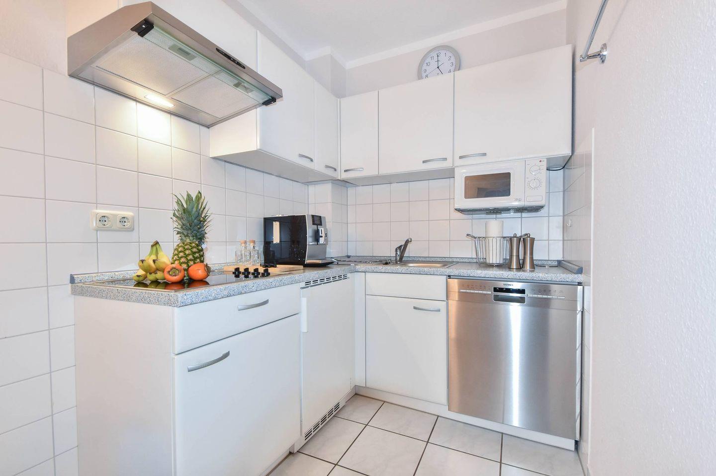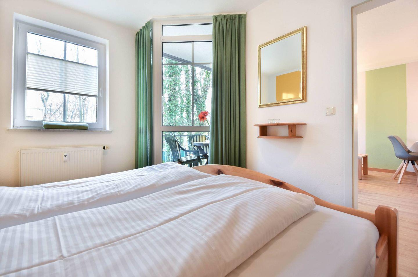 Das praktisch eingerichtete 2-Raum-Appartement Buchenpark 08 mit einer Größe von 45 Quadratmetern lädt zu einem erholsamen Urlaub ein. Der Wohnbereich mit Zugang zum Balkon und der offenen Küche, ausgestattet mit 4-Platten Herd, Mikrowelle und Geschirrspüler, lässt keine Wünsche offen. Für den morgendlichen Kaffeegenuss steht Ihnen ein Kaffeevollautomat zur Verfügung. Das Schlafzimmer mit Doppelbett und durchgehenden Matratzentopper sorgt für erholsamen Schlaf.