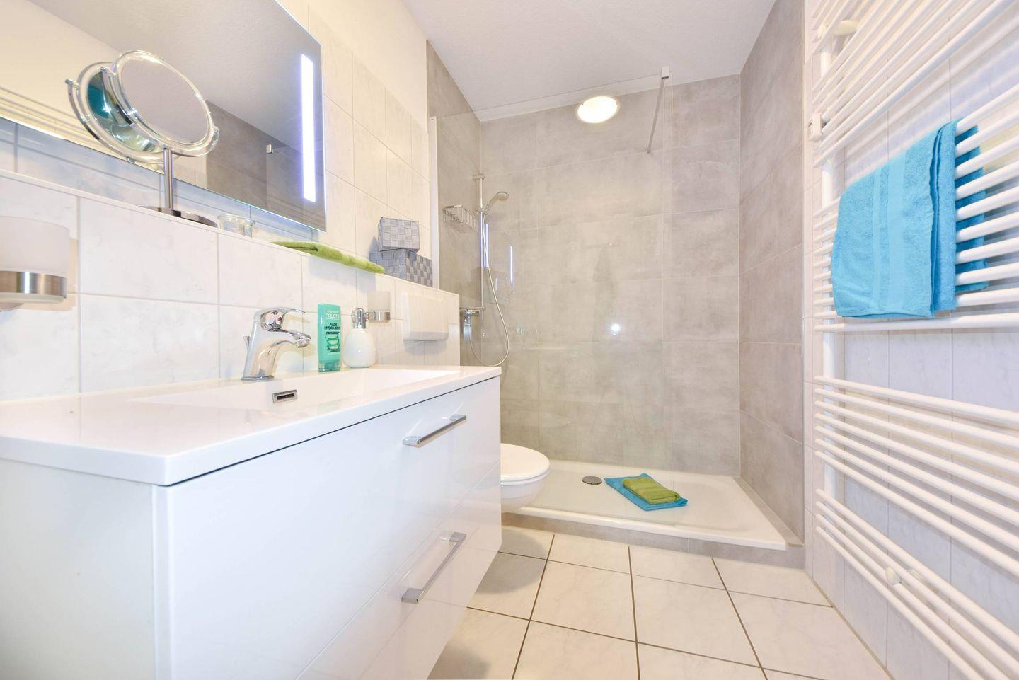 Das Highlight der Wohnung ist das Bad mit großer, bodentiefer Dusche, in der man auch mal zu zweit duschen kann. Vom Schlafzimmer sowie auch vom Flur ist das modern und hell gestaltete Duschbad begehbar. Für längere Aufenthalte steht Ihnen eine Münz-Waschmaschine zur Verfügung. Diese befindet sich im Untergeschoss der Ferienresidenz Buchenpark.