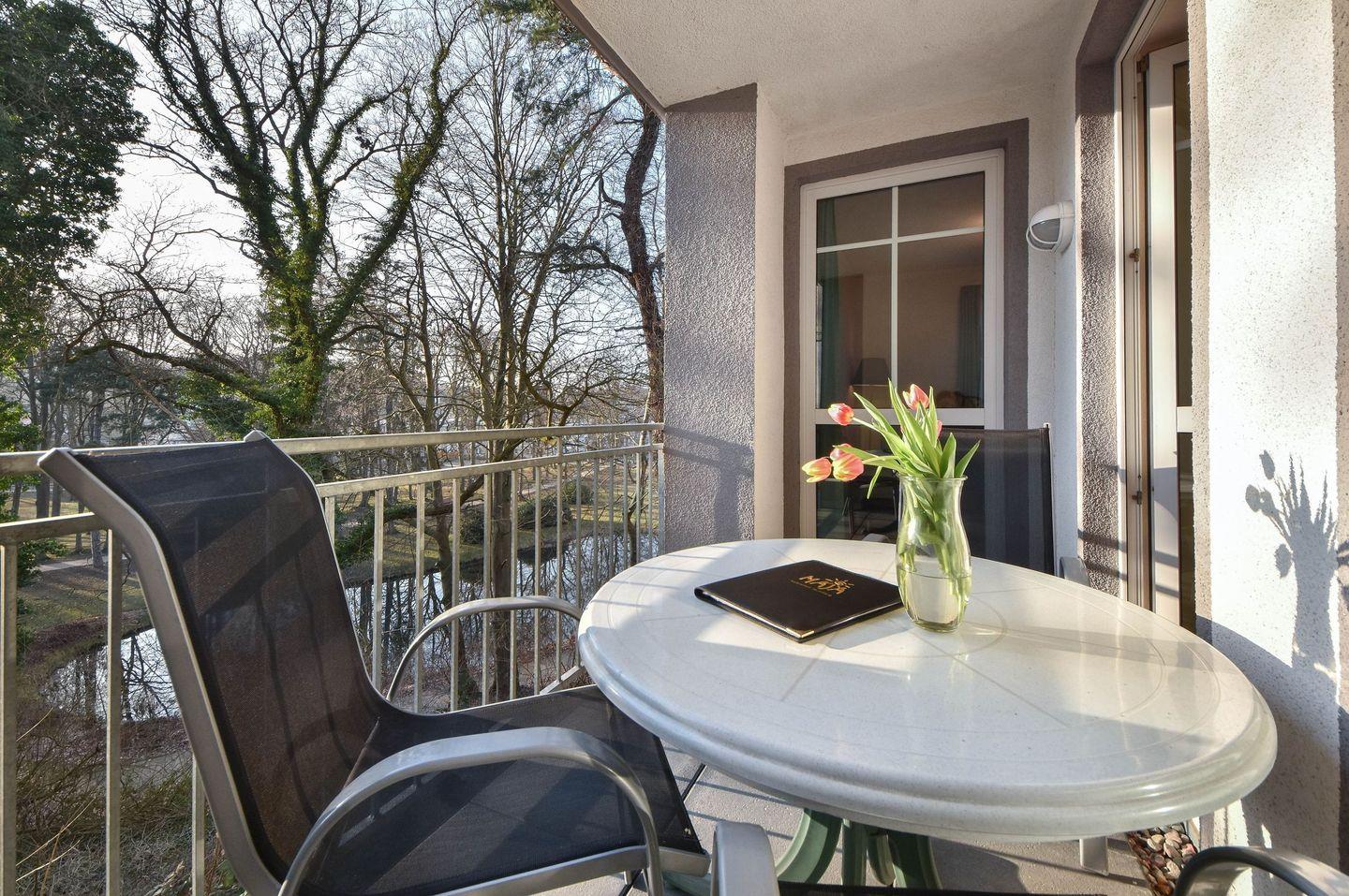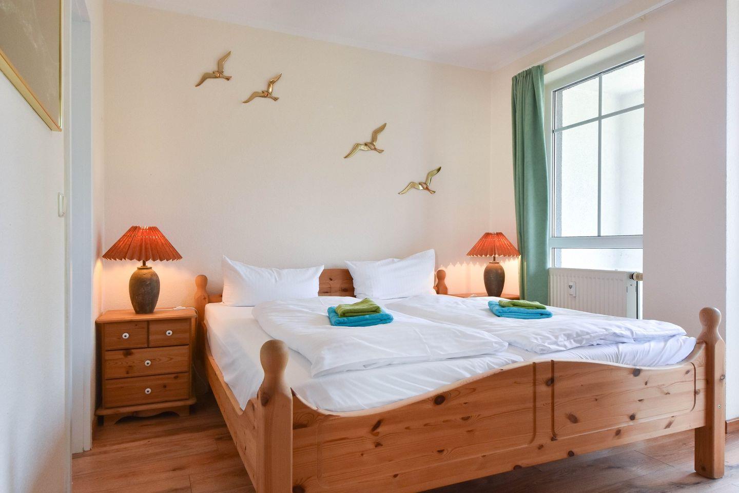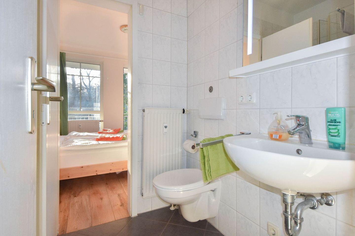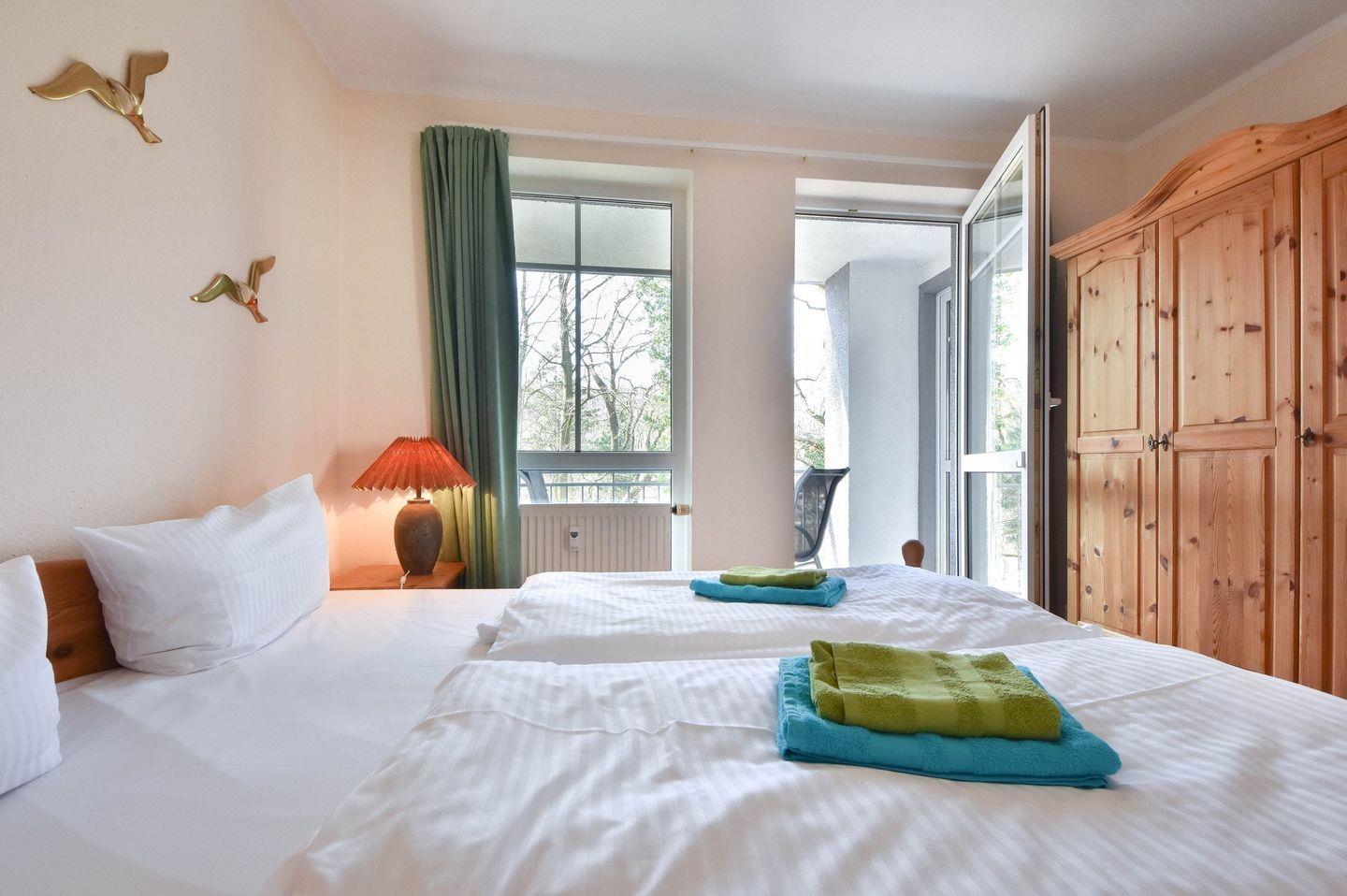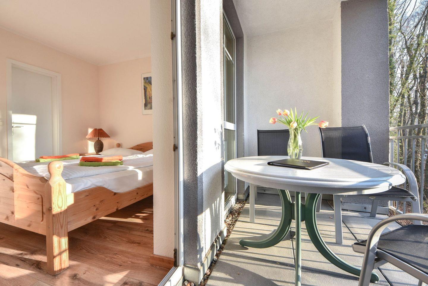 Das Schlafzimmer mit Doppelbett und Kleiderschrank bietet Ihnen ebenso wie der Wohnraum Zugang zum möblierten Balkon. Aufgrund der westlichen Ausrichtung genießen Sie hier am Nachmittag die Sonne und entspannen mit Blick auf den Goethepark in Heringsdorf. Das kleine Badezimmer verfügt über eine ebenerdige Dusche, WC und Waschtisch. Das Bad ist sowohl vom Schlafraum als auch vom Flur zu erreichen.