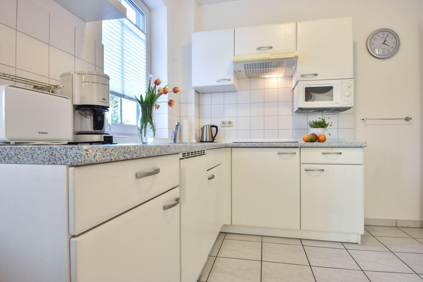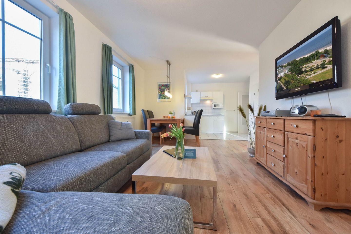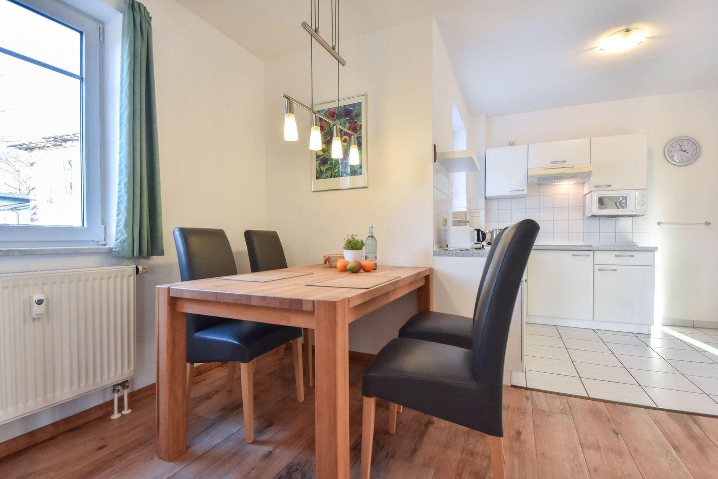 Herzlich Willkommen im Buchenpark in Heringsdorf! Zentral in der Delbrückstraße gelegen erwartet Sie hier im ersten Obergeschoss des Hauses ein gemütliches Domizil, für bis zu drei Personen. Die etwa 44 Quadratmeter der Wohnung werden dank des optimalen Grundrisses ideal genutzt. Ein großer Wohn- und Essbereich mit Esstisch und Stühlen sowie ausziehbarer Couch (Schlafmöglichkeit für die dritte Person) und großem TV-Gerät, schließt sich an die offene Küche an. Diese ist mit Mikrowelle und Ceranfeld ausgestattet und verfügt außerdem über Kaffeemaschine, Wasserkocher und Toaster.