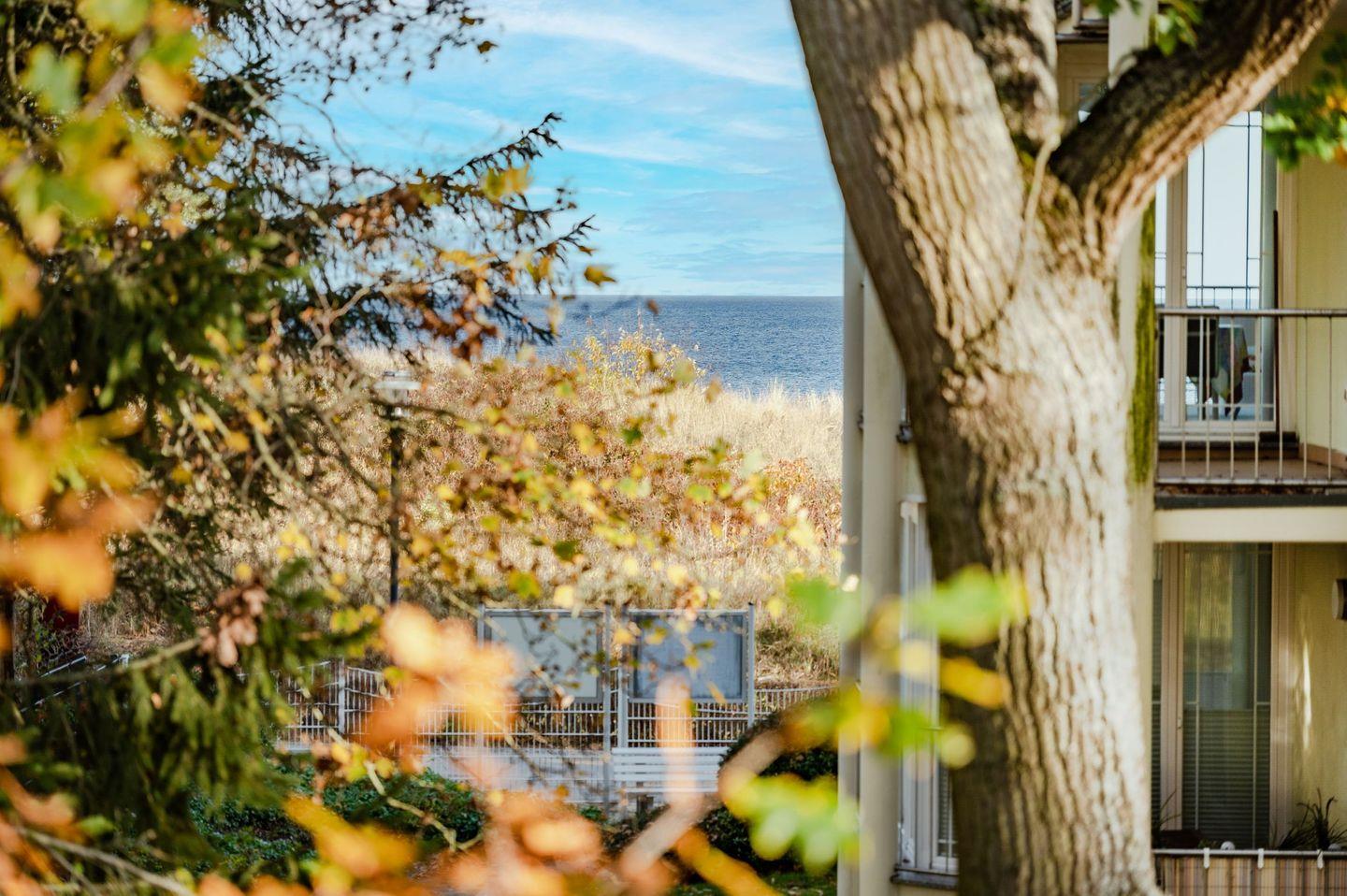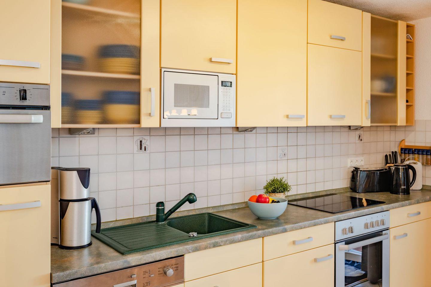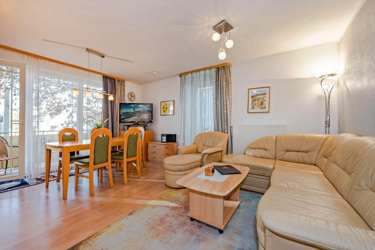 Das Wohnzimmer mit Essbereich und offener Küche begrüßt Sie in einer stimmigen Farbkombination, sodass Sie sich direkt wohlfühlen werden. Der Urlaubsgestaltung sind keine Grenzen gesetzt. Erleben Sie mit der Familie einen gemütlichen Filme- oder Spieleabend auf der Ledercouch oder nutzen Sie eigene Streamingdienste, auf die Sie dank des Smart-TVs nicht verzichten müssen. Am Esstisch findet jeder Urlaubsgast Platz für gemeinsame Mahlzeiten. Die Küche ist vollwertig ausgestattet mit 4-Platten-Herd, Backofen, Spülmaschine und Mikrowelle. Weitere kleinere Küchenhelfer ermöglichen ein komfortables Kocherlebnis - auch im Urlaub. Vom Wohnzimmer gelangen Sie auf den anliegenden Balkon, von dem Sie einen idyllischen Ausblick auf die naturbelassene Umgebung genießen. Bei guter Wetterlage lässt sich sogar ein kleiner Blick auf die Ostsee erhaschen.
