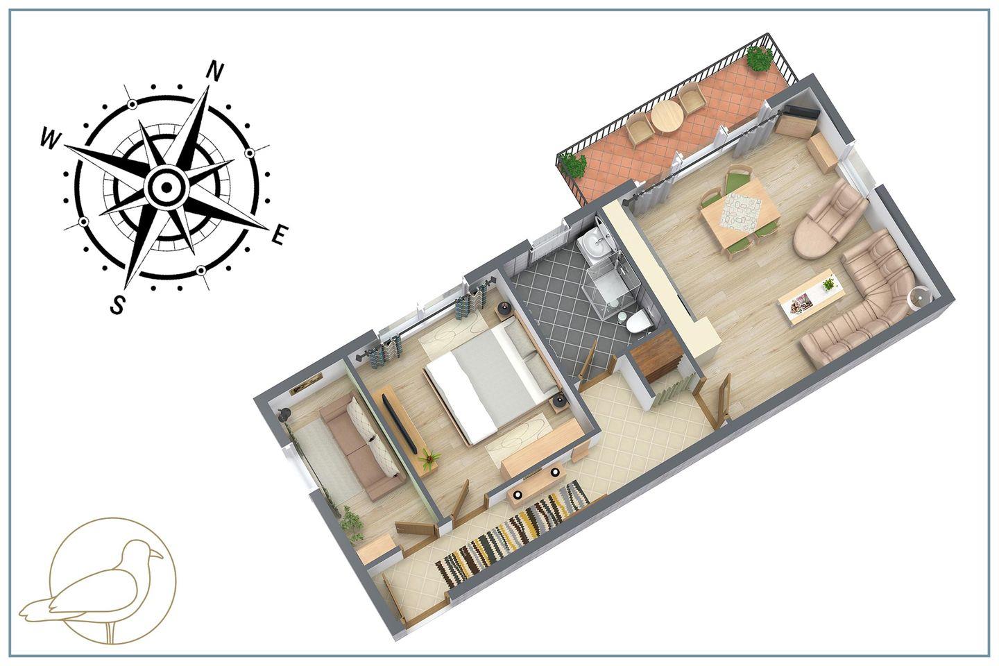 Ihr Urlaubsdomizil befindet sich in der zweiten Etage des Hauses, verfügt über drei Räume und erstreckt sich auf 55 Quadratmetern. Erwachsene, aber auch Familien mit bis zu zwei Kindern können hier einen perfekten Strandurlaub erleben.