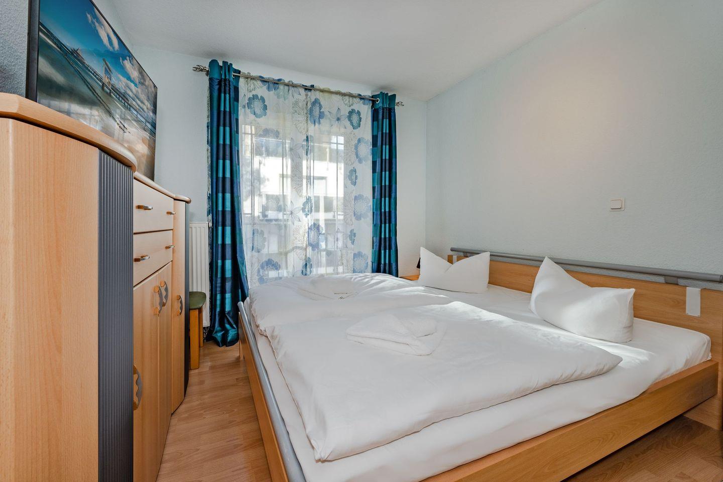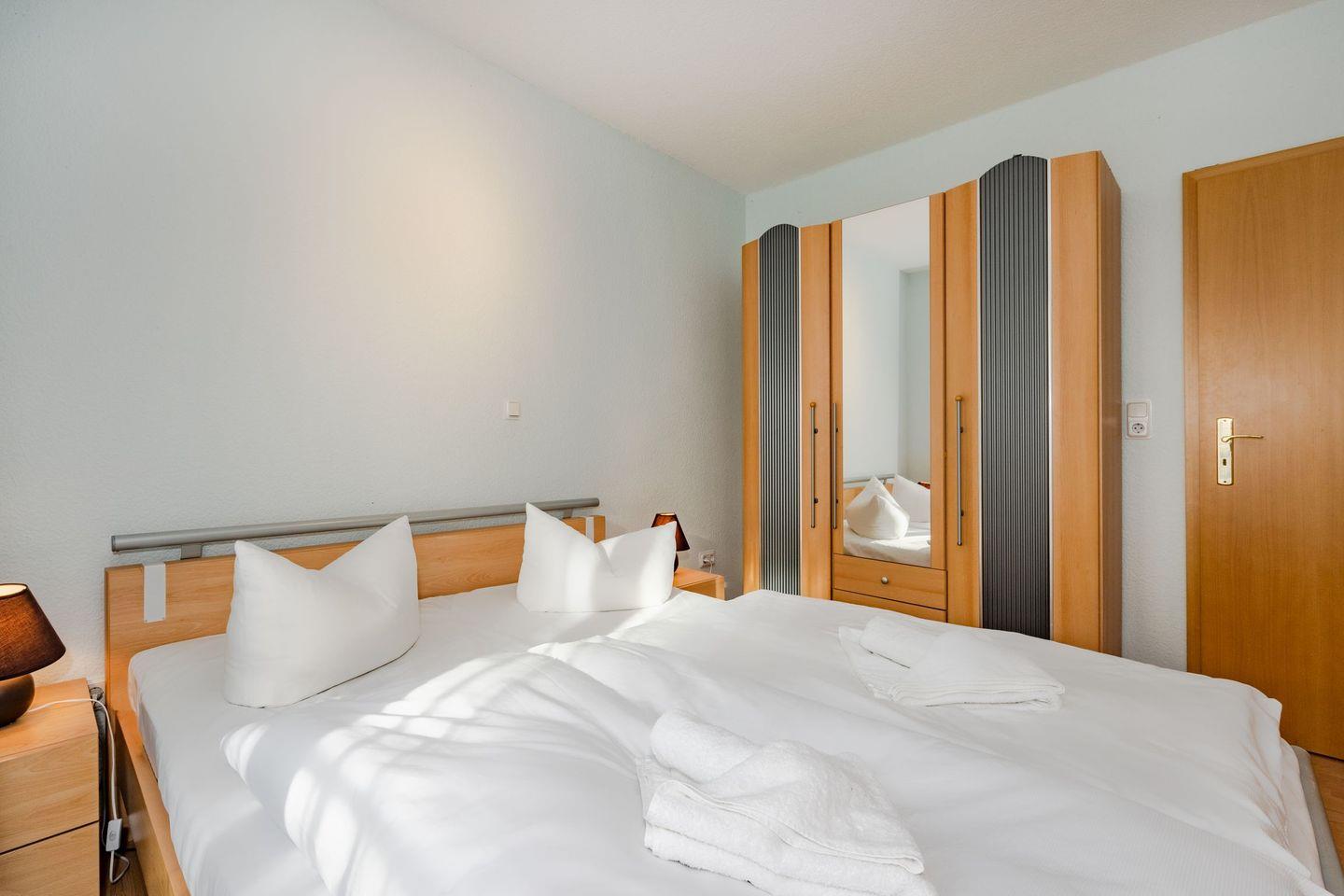 Das Schlafzimmer ermöglicht erholsamen Schlaf in einem bequemen Doppelbett (1,80 x 2,00 Meter) und ist für Ihren Komfort mit einem Fernseher ausgestattet. Ausreichend Stauraum verschaffen Ihnen sowohl der Kleiderschrank, als auch eine Kommode. Für die Kinder befindet sich im zweiten Schlafzimmer eine Schlafcouch (1,40 x 2,00 Meter), welche nach Belieben ausgezogen werden kann. Das Badezimmer verfügt über WC, Waschbecken, Handtuchheizung und Dusche.