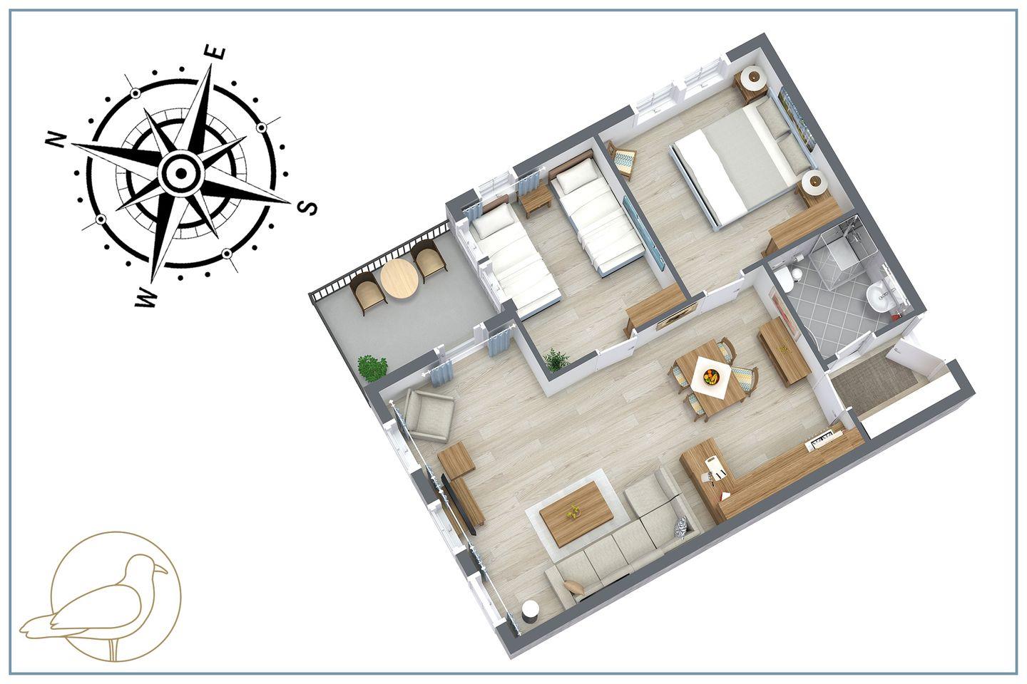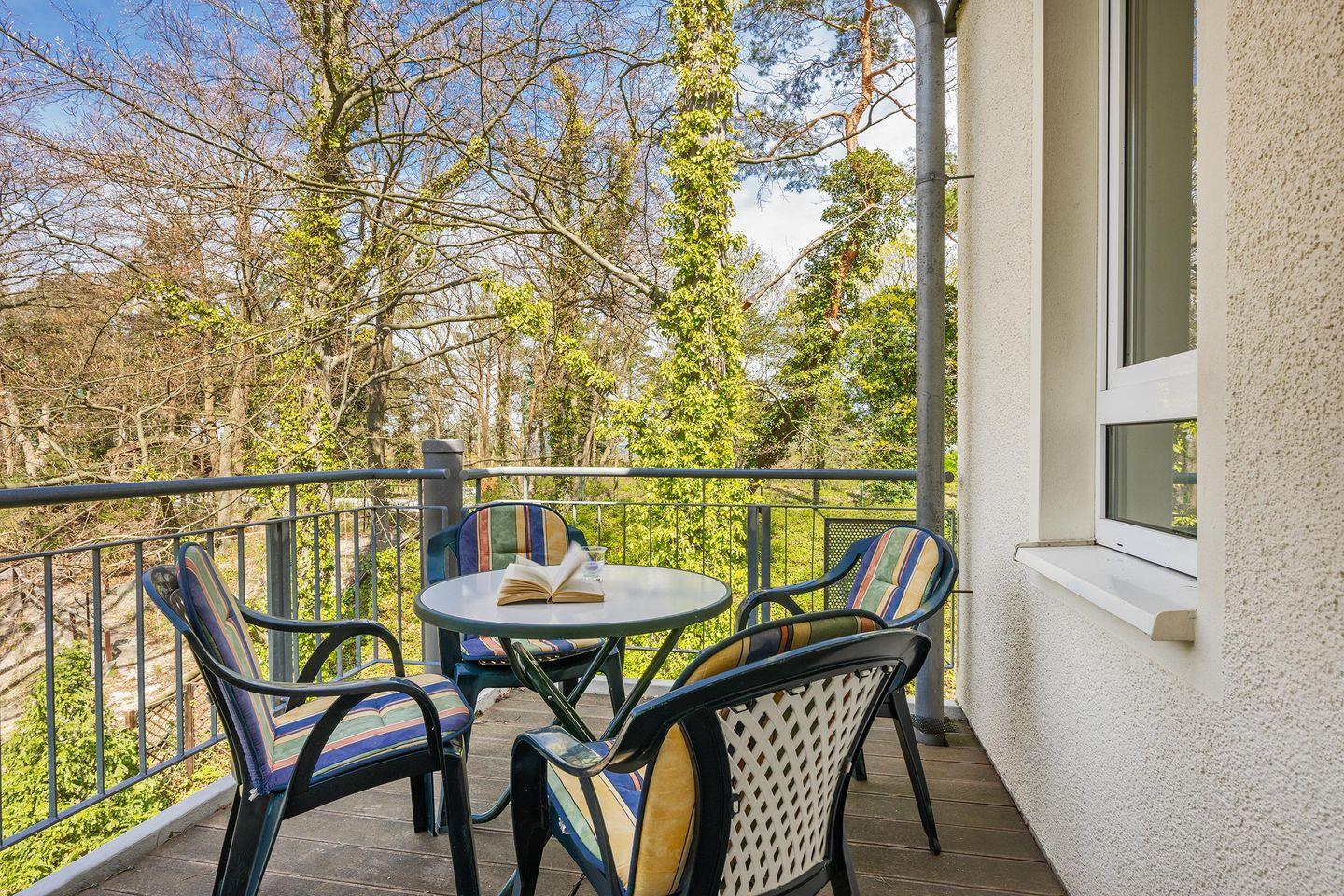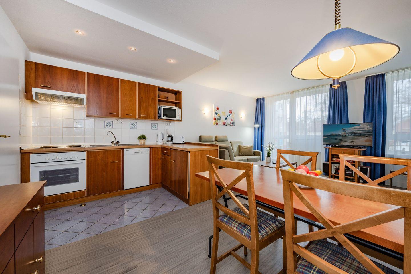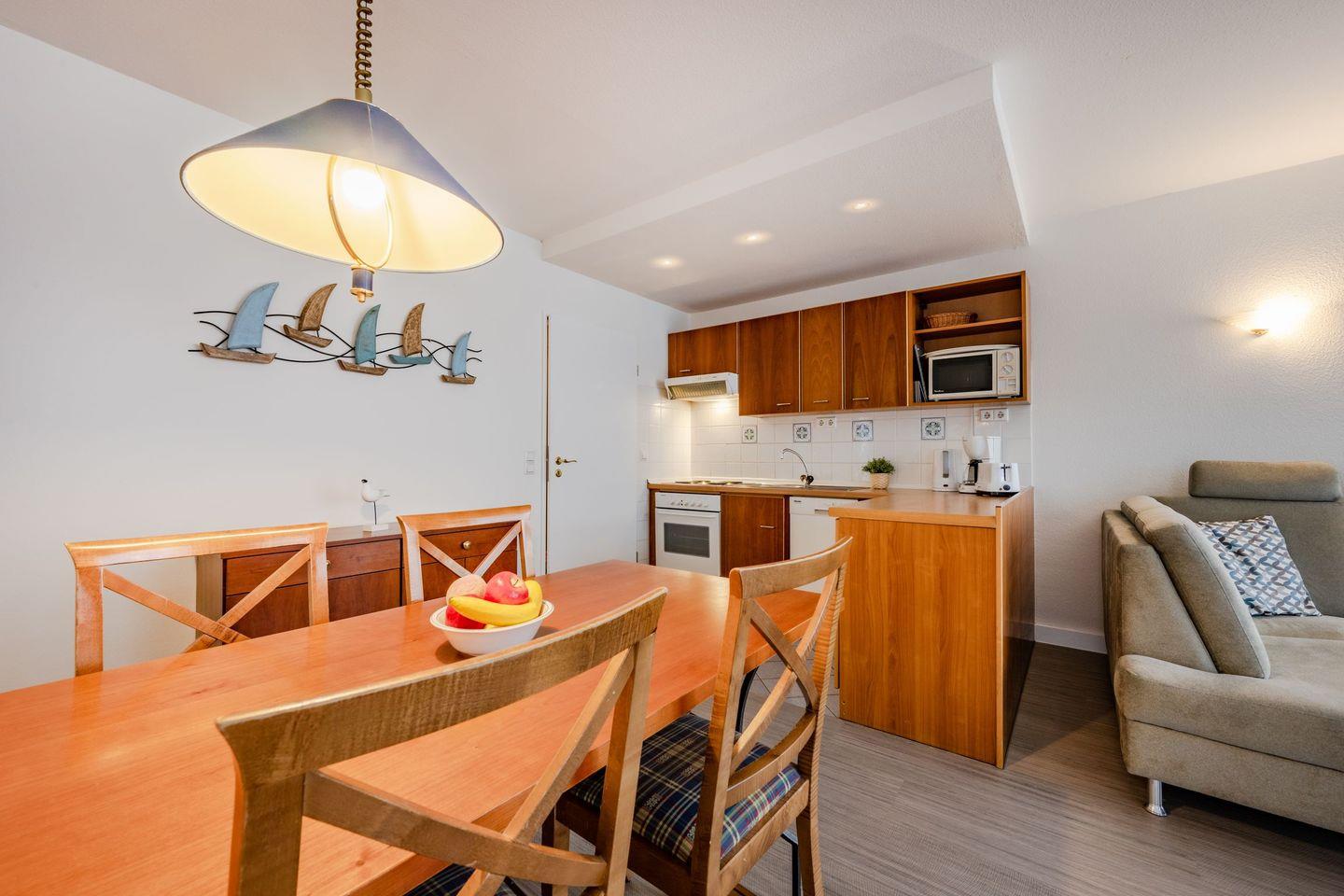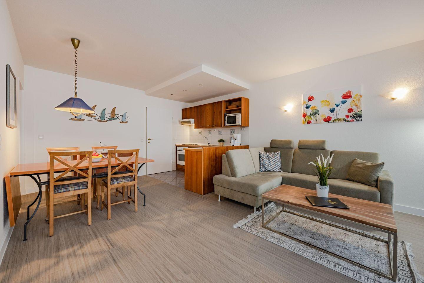 Das Appartement mit der Nummer 123 ist 56 Quadratmeter groß und bietet aufgrund seiner beiden Schlafzimmer und einer vorteilhaften Raumaufteilung bis zu vier Personen Platz. Im Wohnzimmer befinden sich eine bequeme Couch, ein Sessel sowie ein Flat-TV, der gemeinsame Fernsehabende mit der ganzen Familie ermöglicht. Die Küche ist offen zum Wohnraum gestaltet und vollwertig mit 4-Platten-Herd, Backofen, Kühlschrank und Spülmaschine ausgestattet. Ein großer Esstisch mit ausreichend Bestuhlung ist ebenfalls vorhanden. Der angrenzende, nord-westlich ausgerichtete Balkon bietet einen idyllischen Ausblick auf die gepflegte Parkanlage und - leicht eingeschränkt durch umliegende Bäume - auch bis zum Meer.