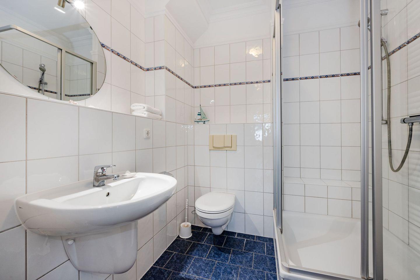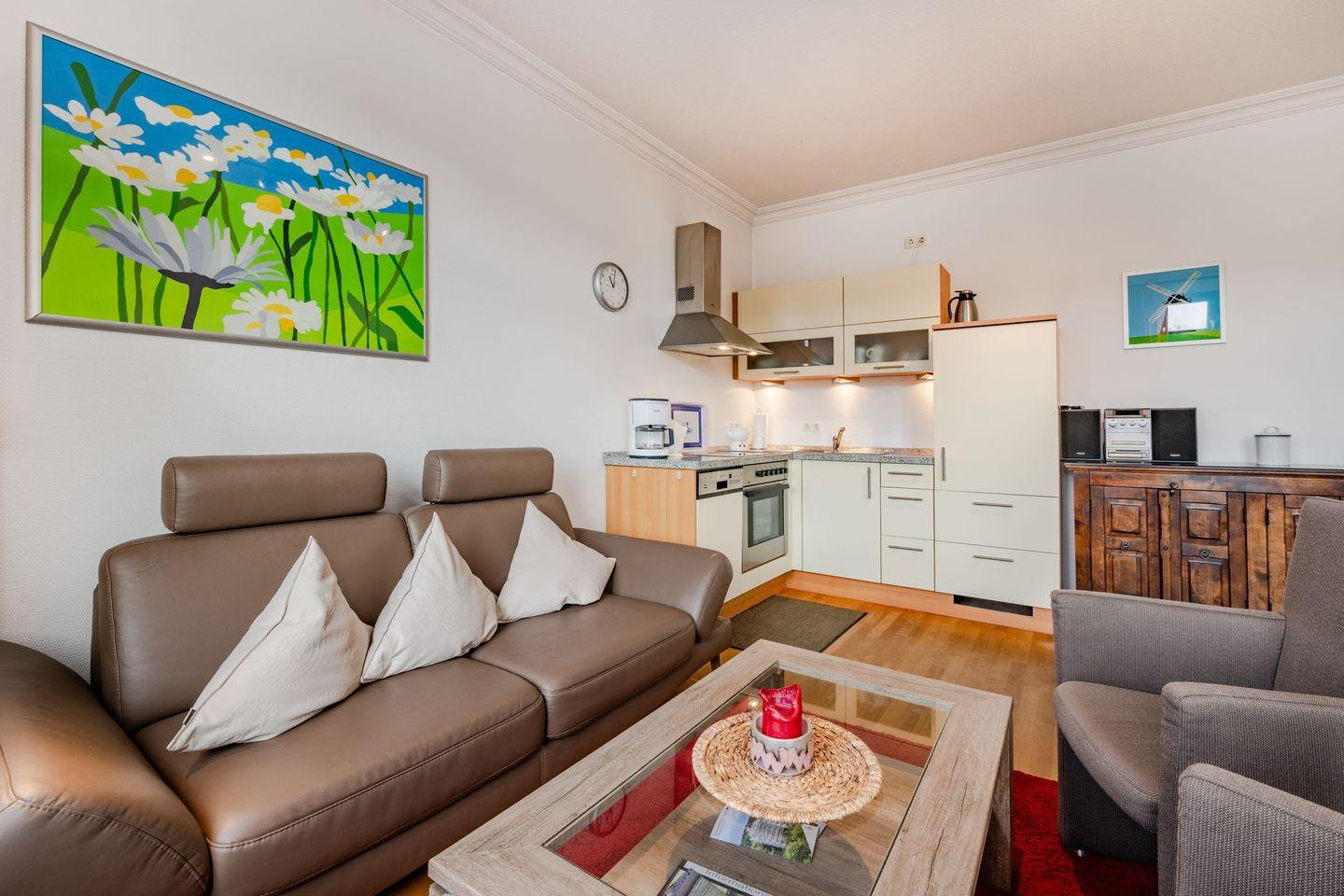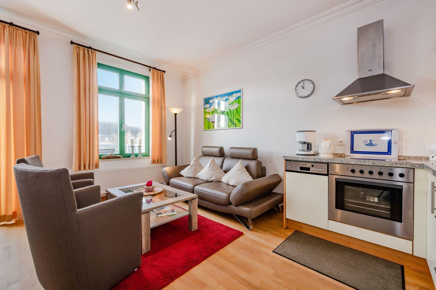 Ihr Urlaubsdomizil erstreckt sich auf 59 Quadratmetern, befindet sich in der zweiten Etage der historischen Villa und verfügt - dank zweier Schlafzimmer - über Platz für bis zu vier Personen. Der Wohnraum ist offen gestaltet und besitzt ebenfalls die Küchenzeile. Hier können Sie entweder Ihre Abende auf der gemütlichen Ledercouch mit dem Flat-TV verbringen oder dank der vollwertigen Küchenausstattung eigene Mahlzeiten zubereiten und diese zusammen mit der Familie an dem großen Esstisch genießen. Alternativ lädt der anliegende Balkon zu einem ausgiebigen Frühstück ein. Das erste Schlafzimmer ist mit einem Doppelbett und einem großen Kleiderschrank eingerichtet und verspricht erholsamen Schlaf. Das zweite Schlafzimmer verfügt über zwei Einzelbetten und ebenfalls über einen Kleiderschrank. Das Badezimmer ist mit Dusche, WC, Waschbecken und Handtuchheizung ausgestattet.