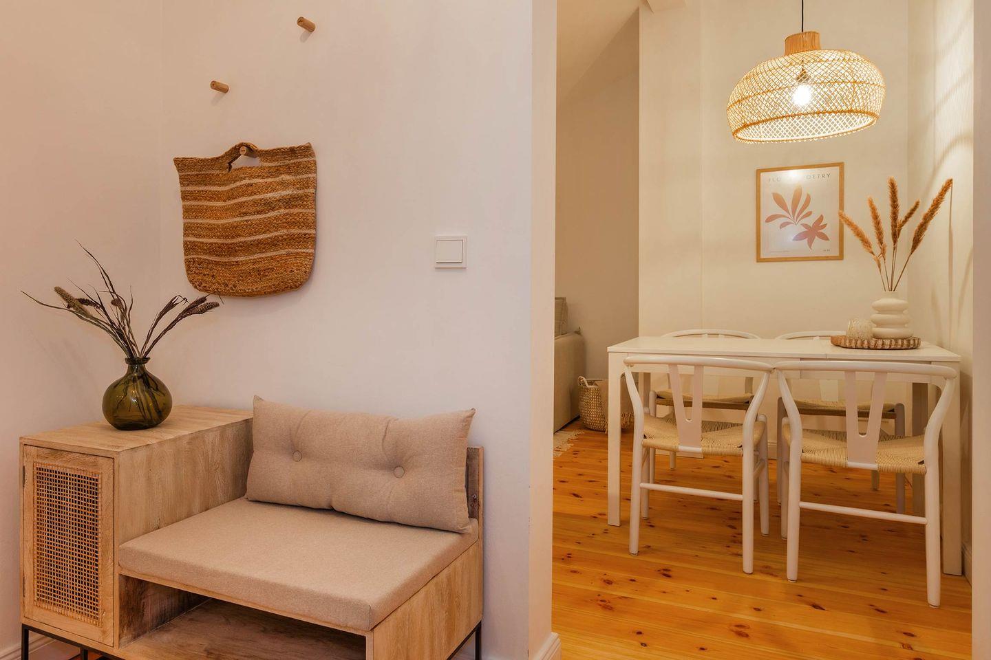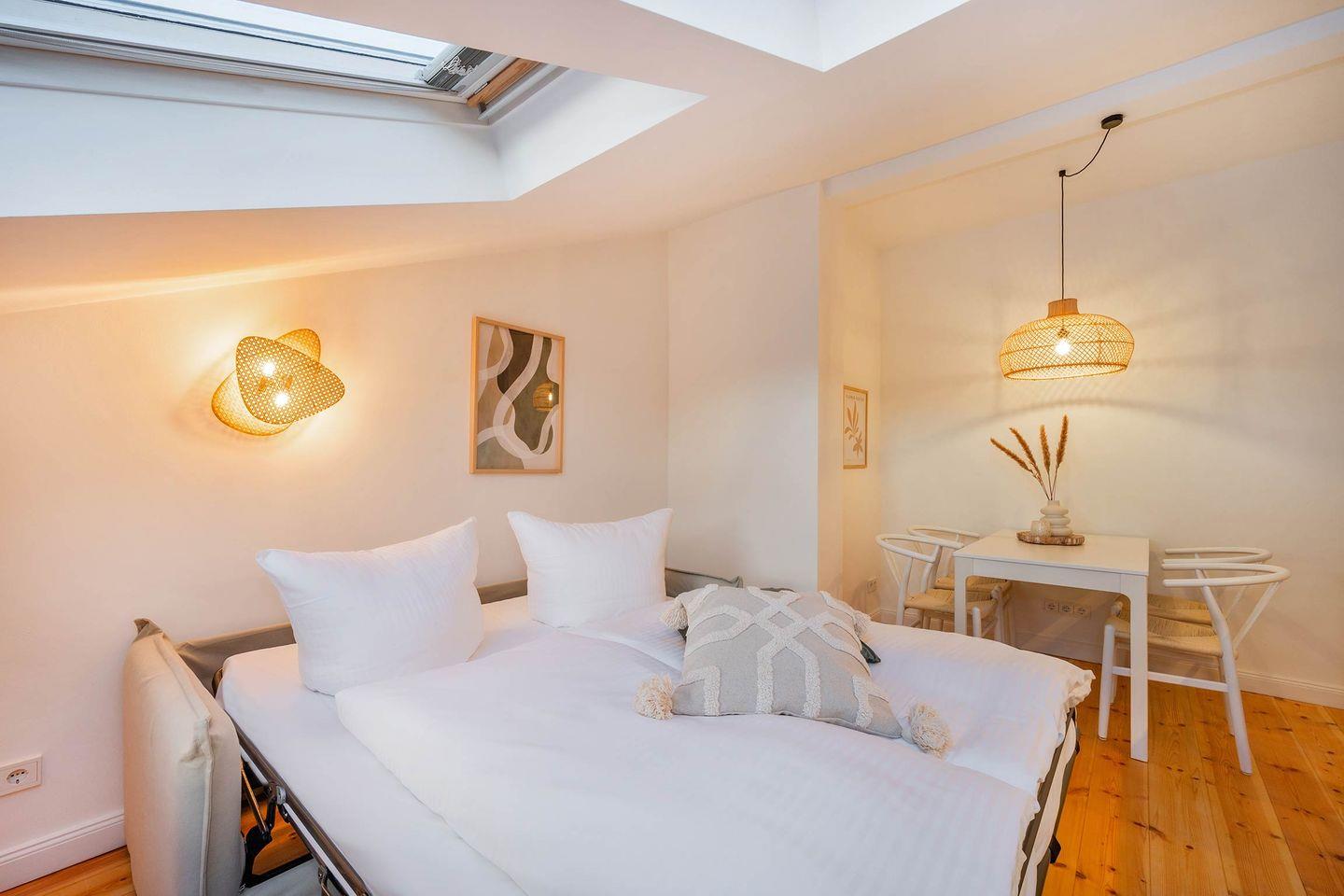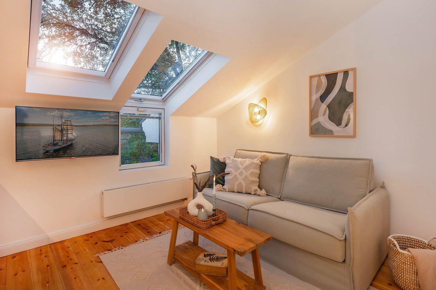 Im Dachgeschoss des Hauses erwartet Sie die im Jahre 2023 neu modernisierte Zwei-Raum-Wohnung. Viele kleine und wohl ausgesuchte Details schaffen ein einladendes Ambiente. Hier heißt es Ankommen, Entschleunigen und sofort wie Zuhause fühlen. Die geschickte Kombination aus zeitloser Architektur und modernen Einrichtungselementen in Verbindung mit dem hochwertigen aufgearbeiteten Dielenboden sorgt für ein stimmiges Gesamtbild, das zum Wohlfühlen und Entspannen einlädt.