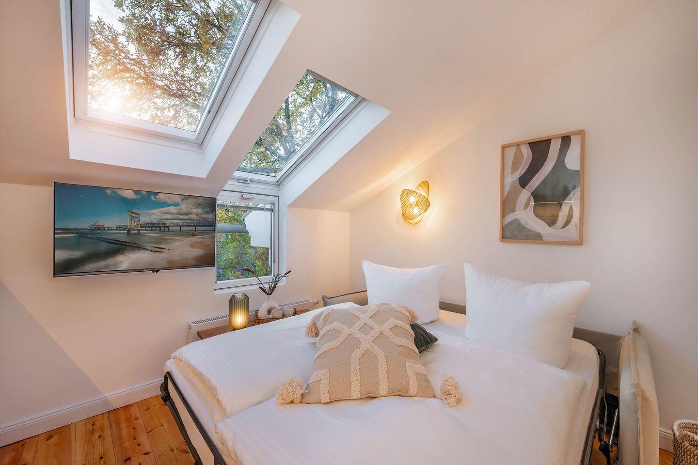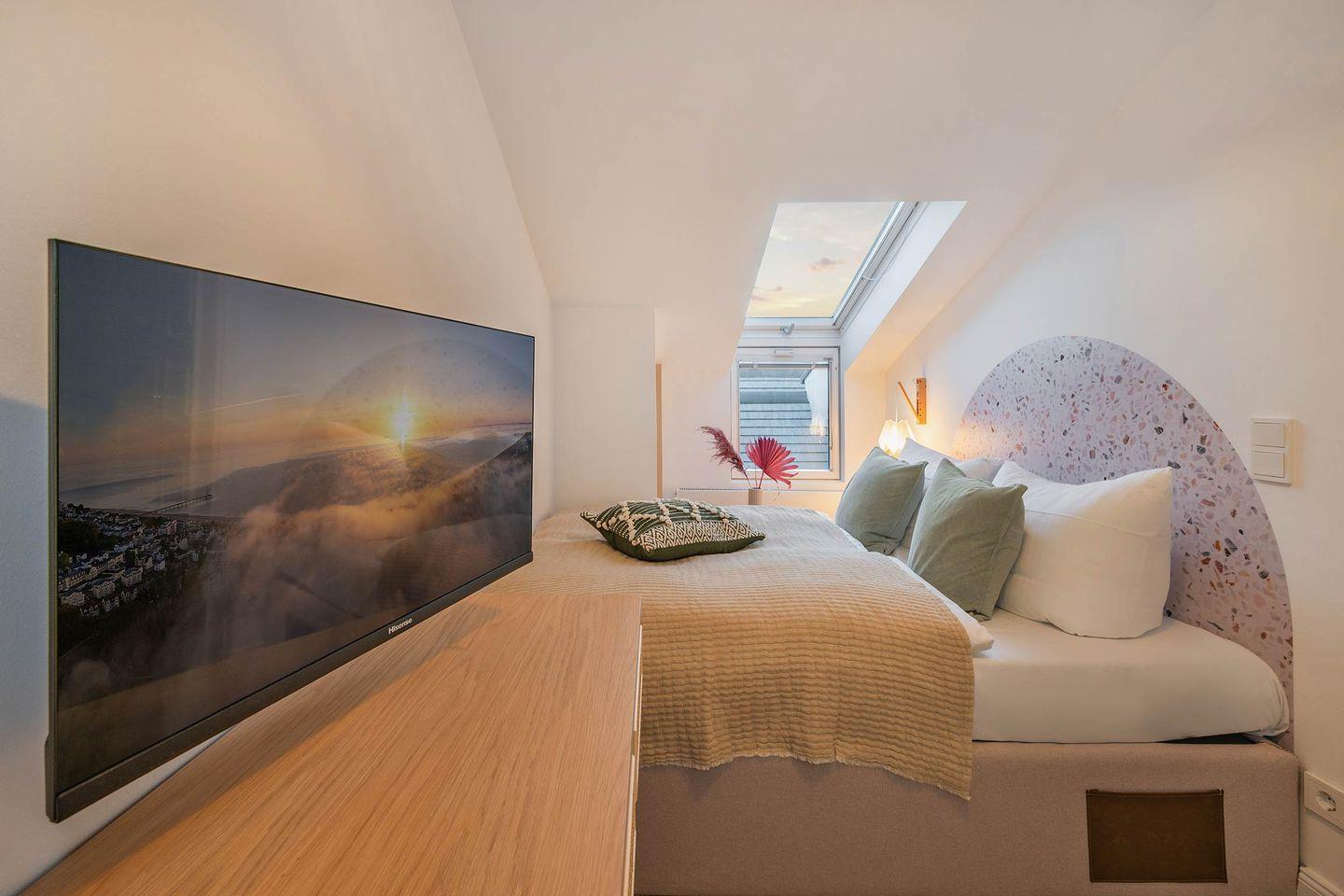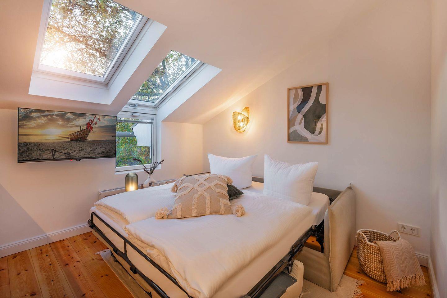 Im Schlafzimmer befinden sich ein bequemes Doppelbett (Liegefläche 1,60 x 2,00 Meter), ein zweiter TV sowie ein geräumiger Kleiderschrank. Die gesamte Wohnung verfügt über Dachfenster, die für zusätzliches Tageslicht und eine angenehme, helle Atmosphäre sorgen. Als besonderes Highlight können Sie den Sternenhimmel, kurz vor dem Schlafengehen, aus Ihrem eigenen Bett beobachten. Selbstverständlich können die Fenster auch verdunkelt werden.