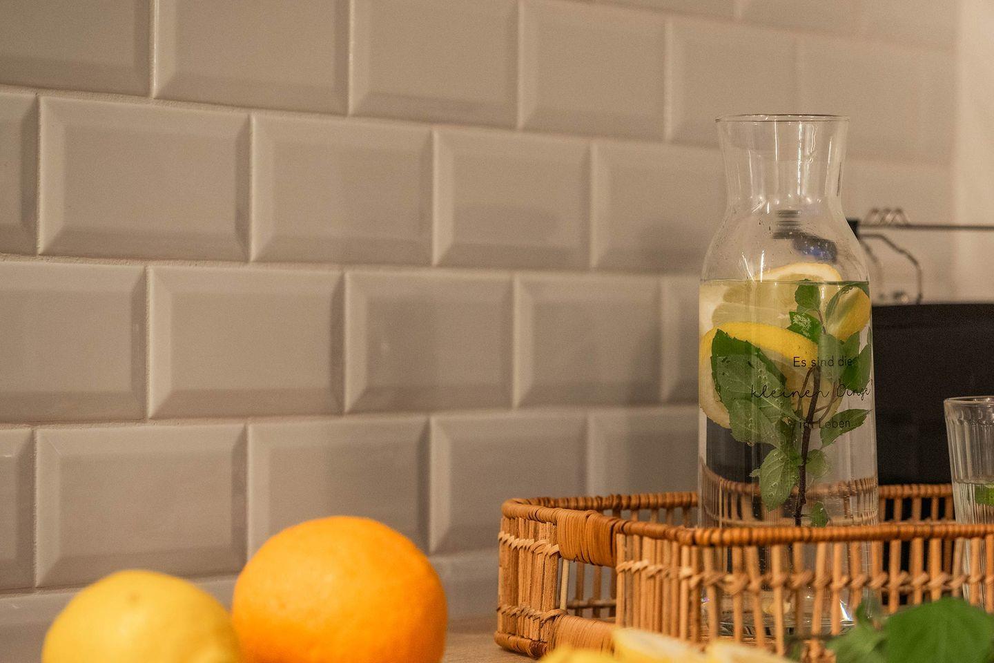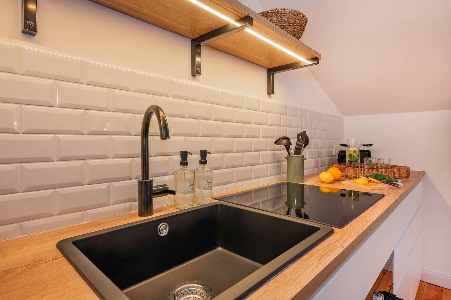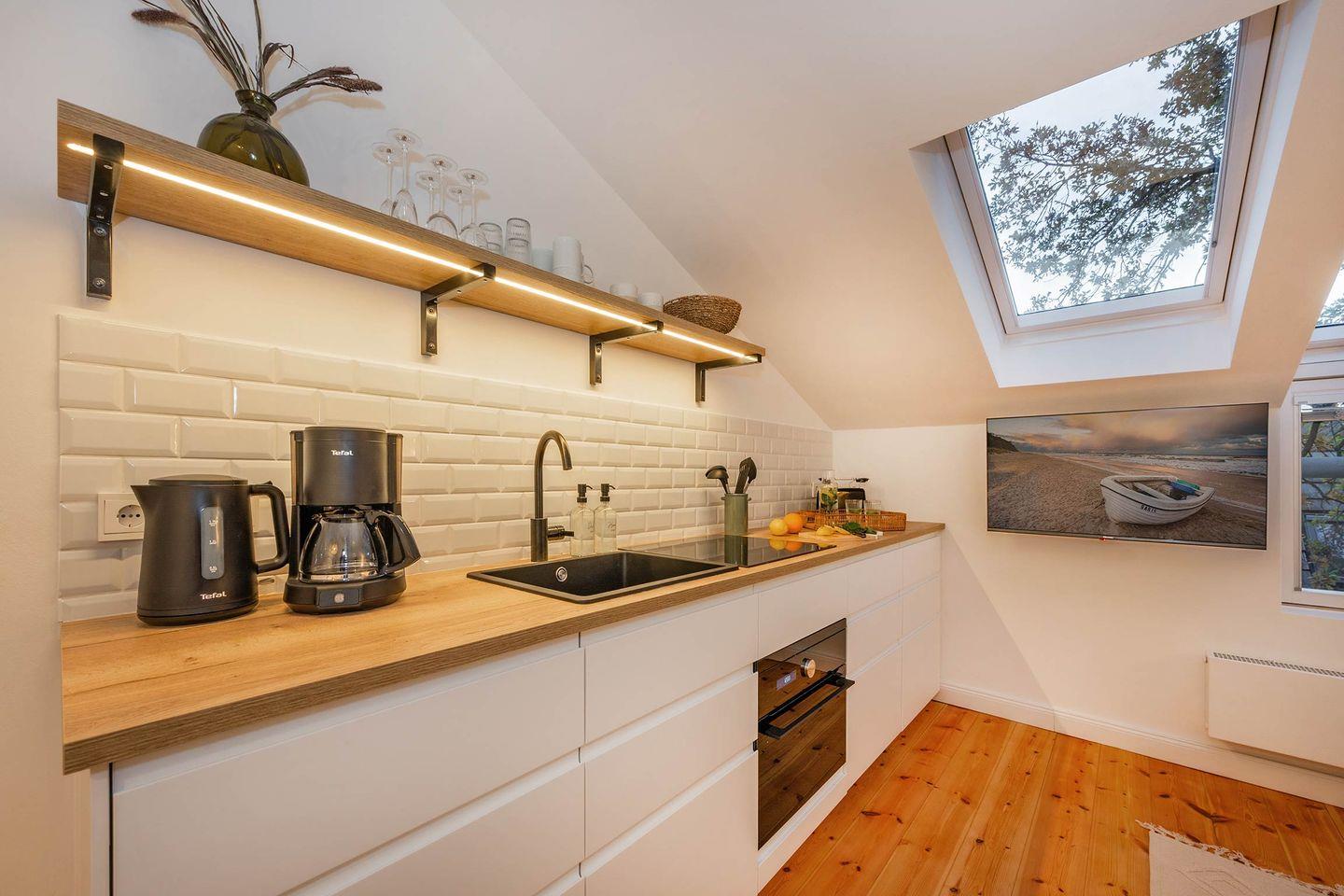 In der Wohnküche sind die Küchenzeile und das Mobiliar wie Schlafsofa, Fernseher, Beistelltisch und Esstisch so gekonnt platziert, dass sie die Räumlichkeiten perfekt ausnutzen und auf begrenztem Raum ausreichend Platz bieten. Die Küche ist mit einem Induktions-Herd, Backofen mit Mikrowellen-Funktion, Spülmaschine, Kühlschrank mit Gefrierfach und weiteren wichtigen Küchenhelfern ausgestattet. Neben einer Kaffeemaschine befindet sich außerdem auch eine Nespresso-Kapselmaschine in der Wohnung. Das vollwertige Schlafsofa dient als Ausweichmöglichkeit, sollten Sie getrennt schlafen wollen.