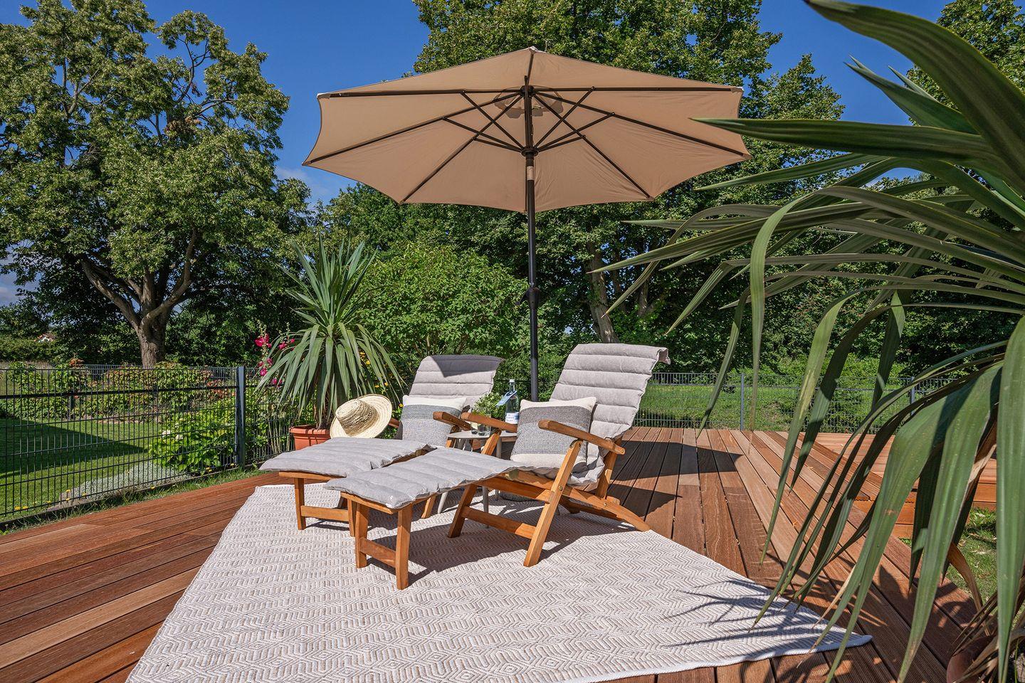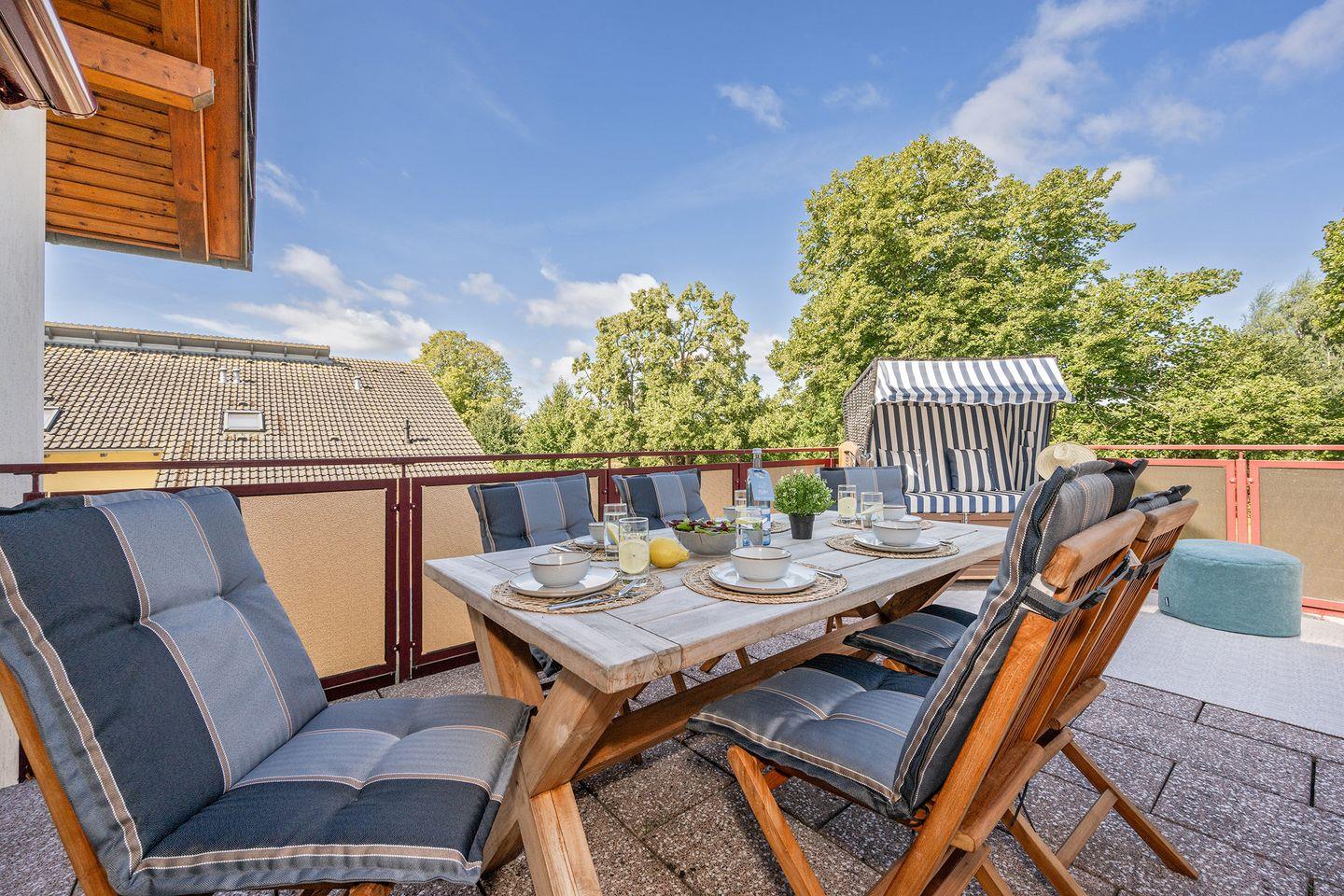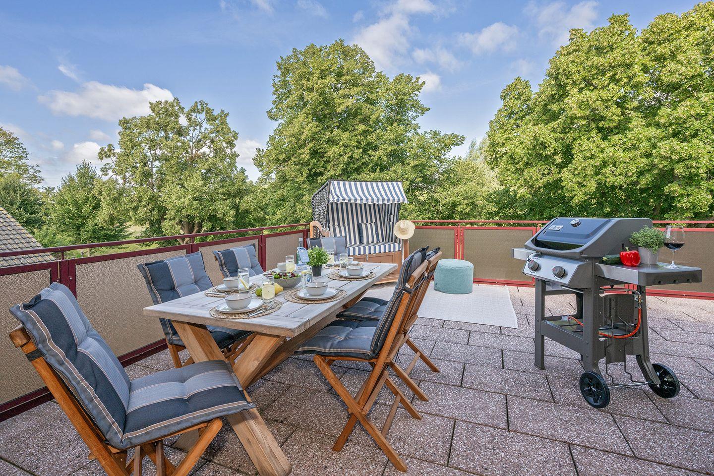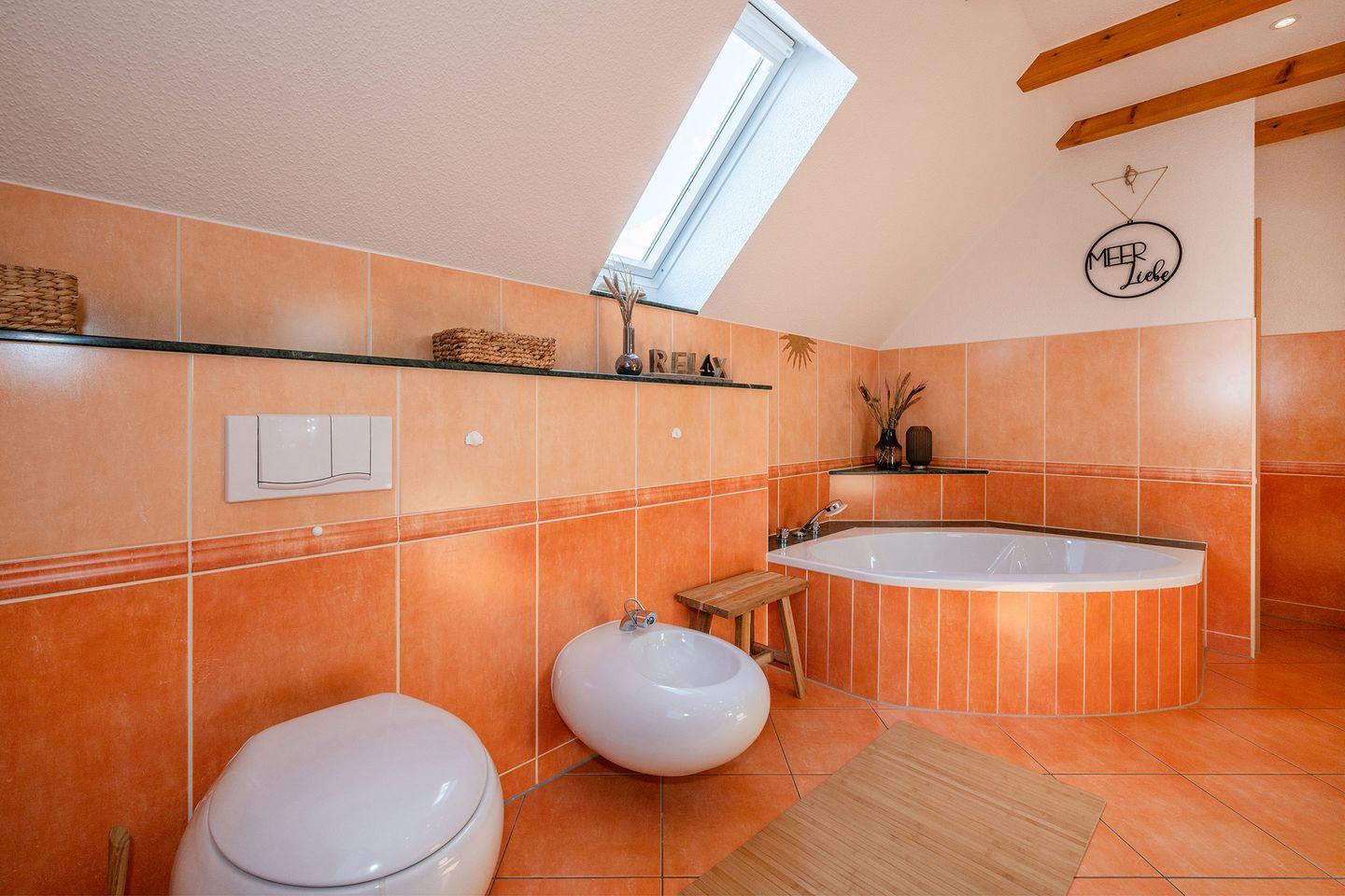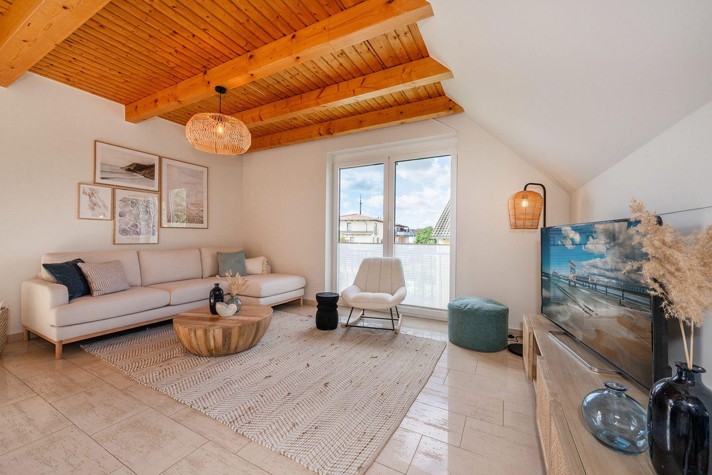 Über eine Treppe gelangen Sie in das erste Obergeschoss des Hauses. Sofort wird Sie das offene Konzept des Hauses begeistern. Der gesamte Wohnbereich mit gemütlicher Couch und großem Flatscreen-TV (Nutzung eigener Streamingdienste wie Netflix oder Amazon-Prime möglich) ist in hellen Farbtönen gehalten und bildet einen einmalig stimmigen Kontrast zu den warmen Holzelementen der Decke und der Treppe. Ein großer Kaminofen mit Sitzbank speichert die Wärme und sorgt gerade in den kühleren Monaten für eine anheimelnde Stimmung. Ausreichend Kaminholz ist vorhanden. Die Wohnküche lässt keine Wünsche offen. Am Induktionsherd der Kücheninsel können Sie eigene Gerichte zubereiten, während die Familie Ihnen bei der Zubereitung am Küchentisch hilft. Ein Backofen und viele hilfreiche Utensilien sind vorhanden, Filter-Kaffeemaschine, Wasserkocher und Toaster gehören ebenso zur Ausstattung, wie eine Brotschneidemaschine und ein Kaffeevollautomat von Jura. Am großen Esstisch oder auf dem angrenzenden Balkon nehmen Sie die Familienmahlzeiten ein. Ein hochwertiger Weber-Grill steht Ihnen zur Nutzung ebenso bereit, wie ein eigener Strandkorb. Vom Balkon mit süd-westlicher Ausrichtung genießen Sie den Blick auf das umliegende Grün. Eine Markise sorgt an warmen Tagen für Beschattung. Aufgrund des offenen Grundrisses und der vielen großen Fenster ist die gesamte Ebene lichtdurchflutet und besonders angenehm. Das große Schlafzimmer ist mit einem Doppelbett (Liegefläche 2,00m x 2,00m) mit elektrisch verstellbaren Lattenrosten, einem großen Einbaukleiderschrank sowie Verdunklungsmöglichkeiten ausgestattet. Das Badezimmer mit Tageslicht verfügt über eine ebenerdige Dusche, eine geräumige Eck-Badewanne sowie Bidet und WC. In der darüberliegenden Etage ist das Spielzimmer für unsere Kleinen (mit hochwertigem Funzy-Spielsofa und liebevollen Spielsachen eingerichtet) durch eine Galerie mit dem dritten Schlafzimmer verbunden. Ein kleiner Schreibtisch kann zum Arbeiten im Homeoffice genutzt werden. Das Schlafzimmer verfügt über zwei Einzelbetten (0,90m x 2,00m) und ist zusätzlich mit einem Kleiderschrank und einem eigenen TV ausgestattet. Auch auf dieser Etage befindet sich ein eigenes Gäste-WC. Bitte beachten Sie eine reduzierte Stehhöhe, aufgrund der Schrägen im oberen Bereich.