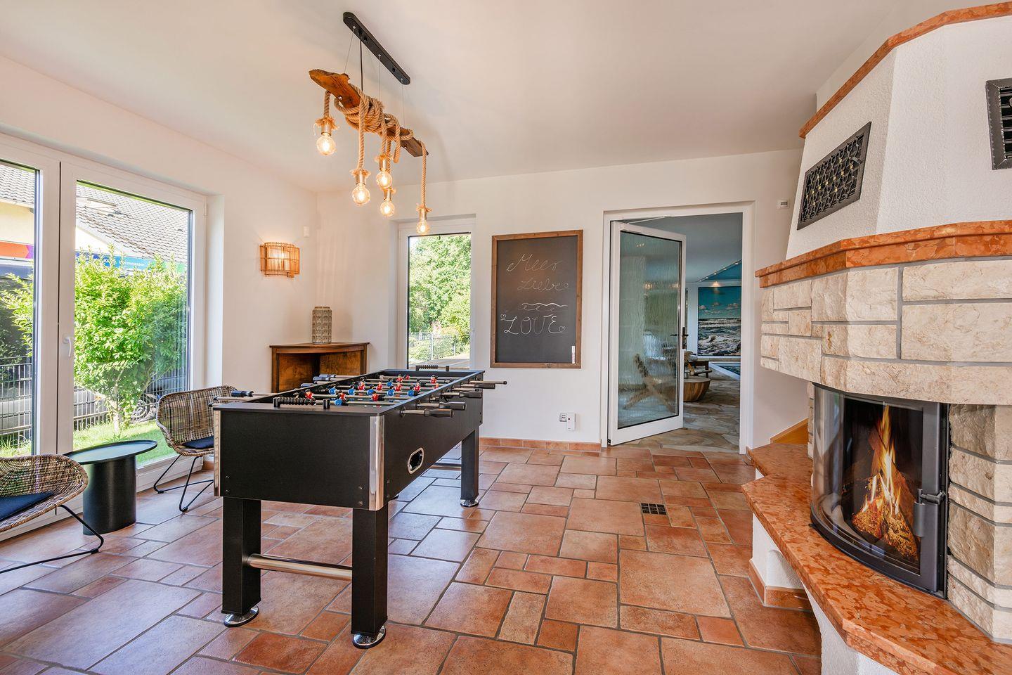 Im Erdgeschoss beginnen Sie bereits direkt nach dem Betreten des Hauses mit dem Urlaub. Sie erwartet ein großzügiger Eingangsbereich mit Tischkicker und Kamin, ideal als Pausengestaltung oder Abendbeschäftigung. Das erste der drei Schlafzimmer, ausgestattet mit einem komfortablen Doppelbett (Liegefläche 1,60m x 2,00m) und einer Kommode, befindet sich ebenso auf dieser Etage wie ein kleines Gäste-WC. Vom Wohnraum nur durch eine abschließbare Tür abgegrenzt, erreichen Sie das Highlight des Ferienhauses: den separaten Indoor-Wellnessbereich mit einem eigenem Schwimmbad und Gegenstromanlage (ca. 20 Quadratmeter groß), Infrarot-Sauna und gemütlichen Relax-Liegen. Die verglaste Fensterfront kann komplett geöffnet werden, sodass Sie nach den Saunagängen oder dem Schwimmen auch im Garten entspannen können. Verschiedene Licht-Szenarien verleihen dem Bereich eine angenehme Atmosphäre, besonders in den Abendstunden. Lassen Sie den Tag im Wasser ausklingen und erholen Sie sich vom Alltagsstress. Eine Dusche und ein separates WC runden diesen Bereich ab.