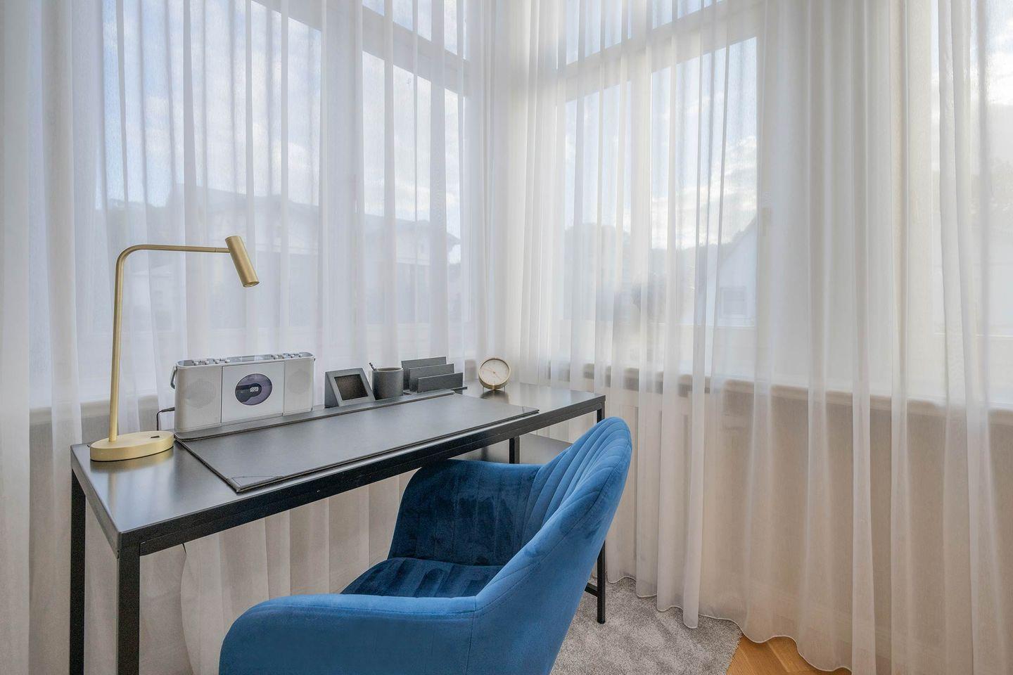 Unabhängig von der Jahreszeit erwartet Sie hier auf 62 Quadratmetern ein besonderes Urlaubsdomizil, das keine Wünsche offen lässt. Die Wohnung verfügt über einen geräumigen Wohn- und Küchenbereich mit Couch, voll eingerichteter Küchenzeile (Backofen, Spülmaschine, Ceran-Kochfeld sowie Kühlschrank mit Gefrierfach). Bereiten Sie eigene Mahlzeiten vor, die Sie im Anschluss in der angrenzenden Loggia am Esstisch zu sich nehmen - oder genießen Sie gemütliche Abende vor dem Elektrokamin. Eine Nespresso-Kaffeemaschine ist zusätzlich zur Filtermaschine vorhanden. Ob Sie endlich ausspannen und den Alltag hinter sich lassen, oder aber den Schreibtisch zum Arbeiten im Homeoffice nutzen, die Entscheidung liegt bei Ihnen. Die Wohnung 05 der Villa Luise macht es Ihnen in jedem Fall leicht, sich im Anschluss an einen Arbeits- oder Urlaubstag ausgiebig zu erholen. Offene, helle Räume, hohe Decken und Echtholzparkett unterstreichen den Charme der herrschaftlichen Villa.