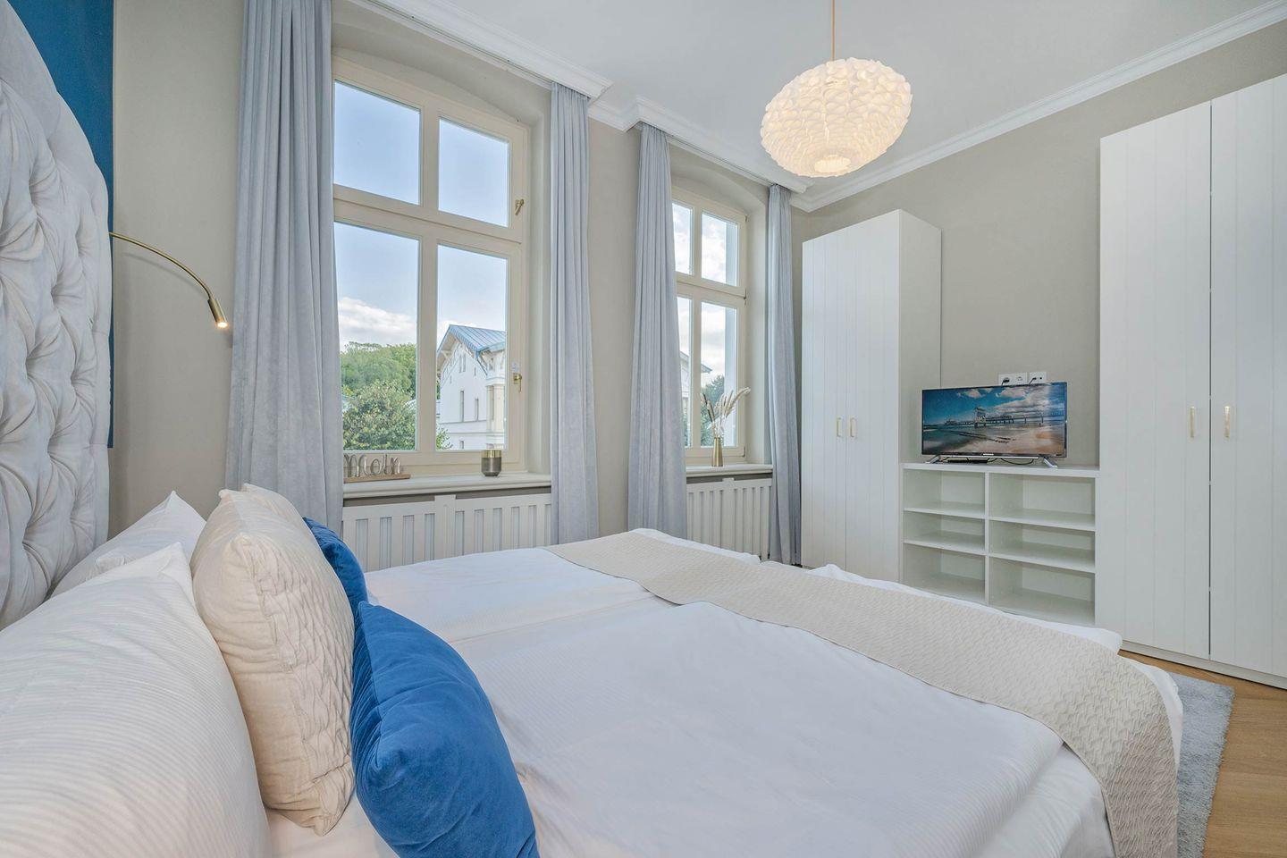 Im Schlafzimmer befinden sich neben dem Boxspring-Doppelbett (Liegefläche 1,80m x 2,00m) auch eine Kommode und Kleiderschränke für Ihre Garderobe. Für den besonderen Komfort und angenehmen Schlaf sorgen ein zweiter Flachbild-TV sowie die Verdunklung vor den Fenstern.
