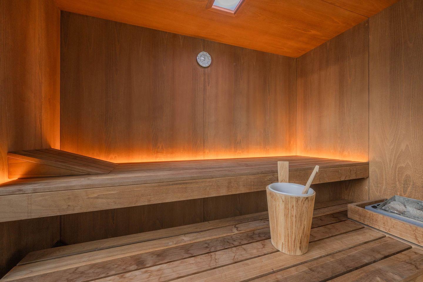 Im Badezimmer sorgen die ebenerdige Glasdusche mit Regenbrause sowie die eigene, geräumige Holzsauna mit Beleuchtung für echte Spa-Erlebnisse in tollem Ambiente.